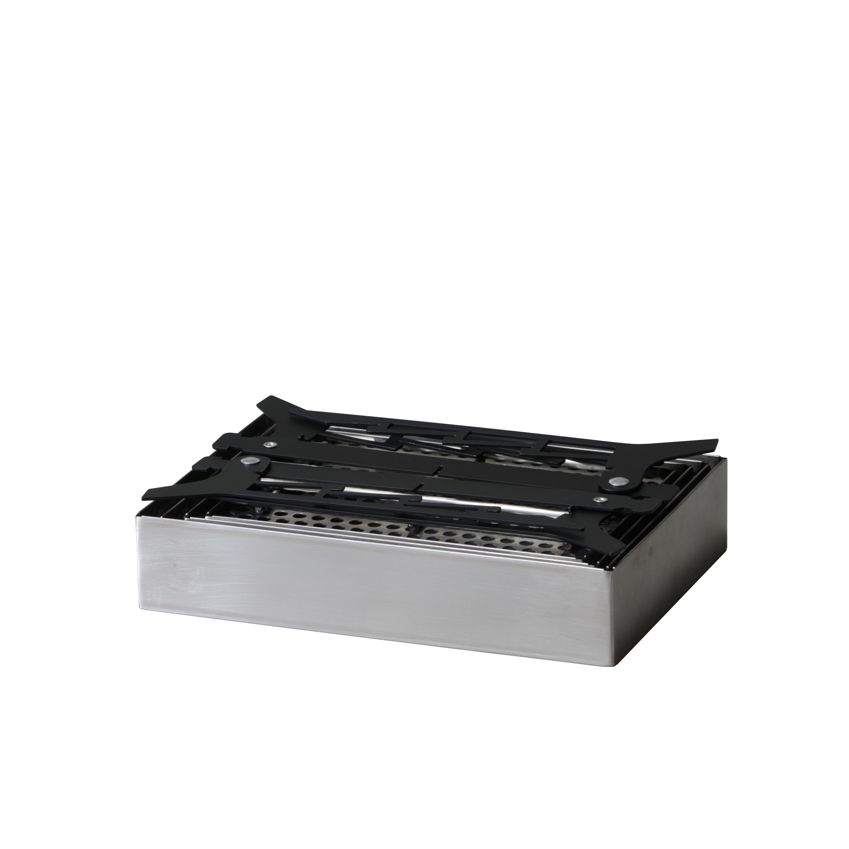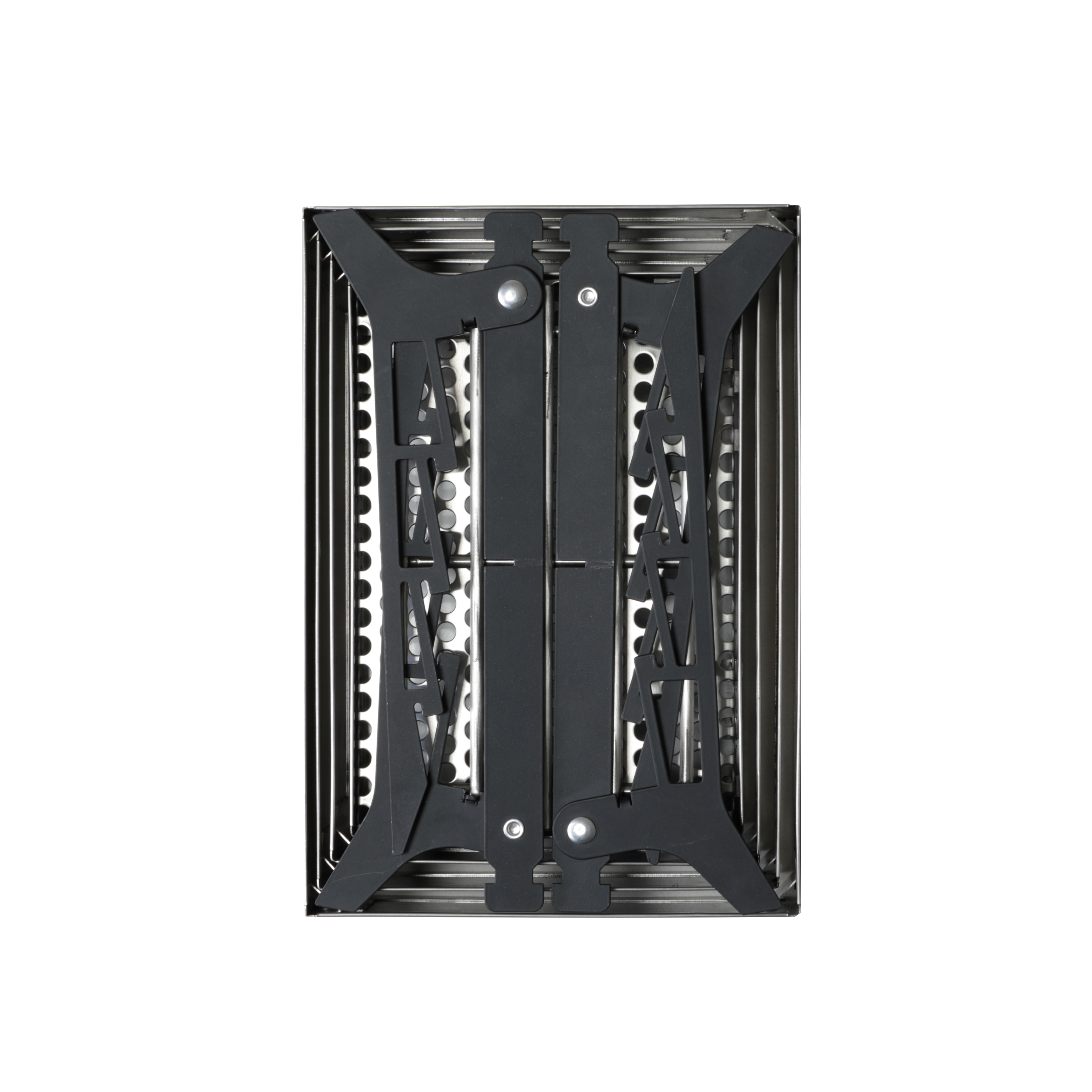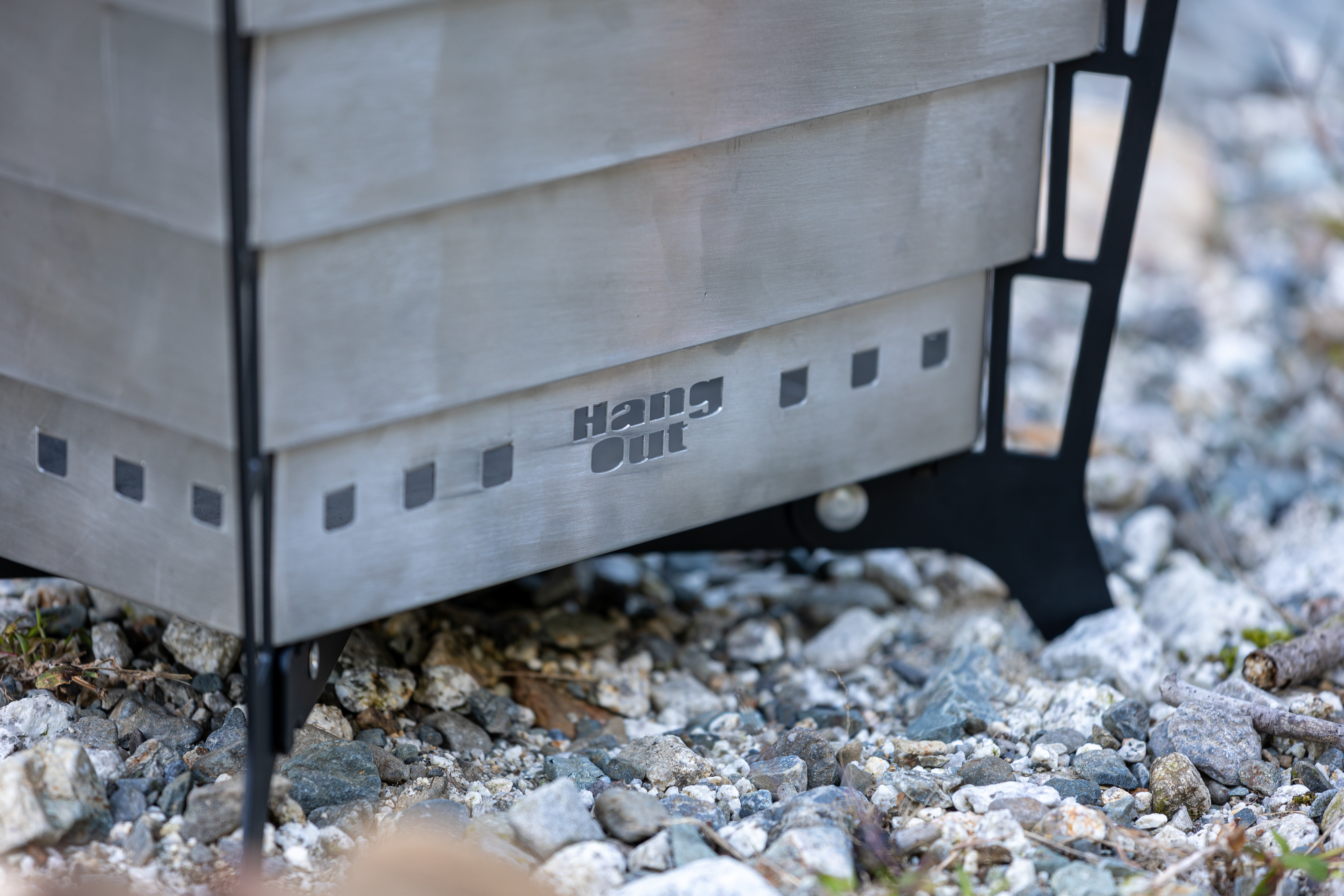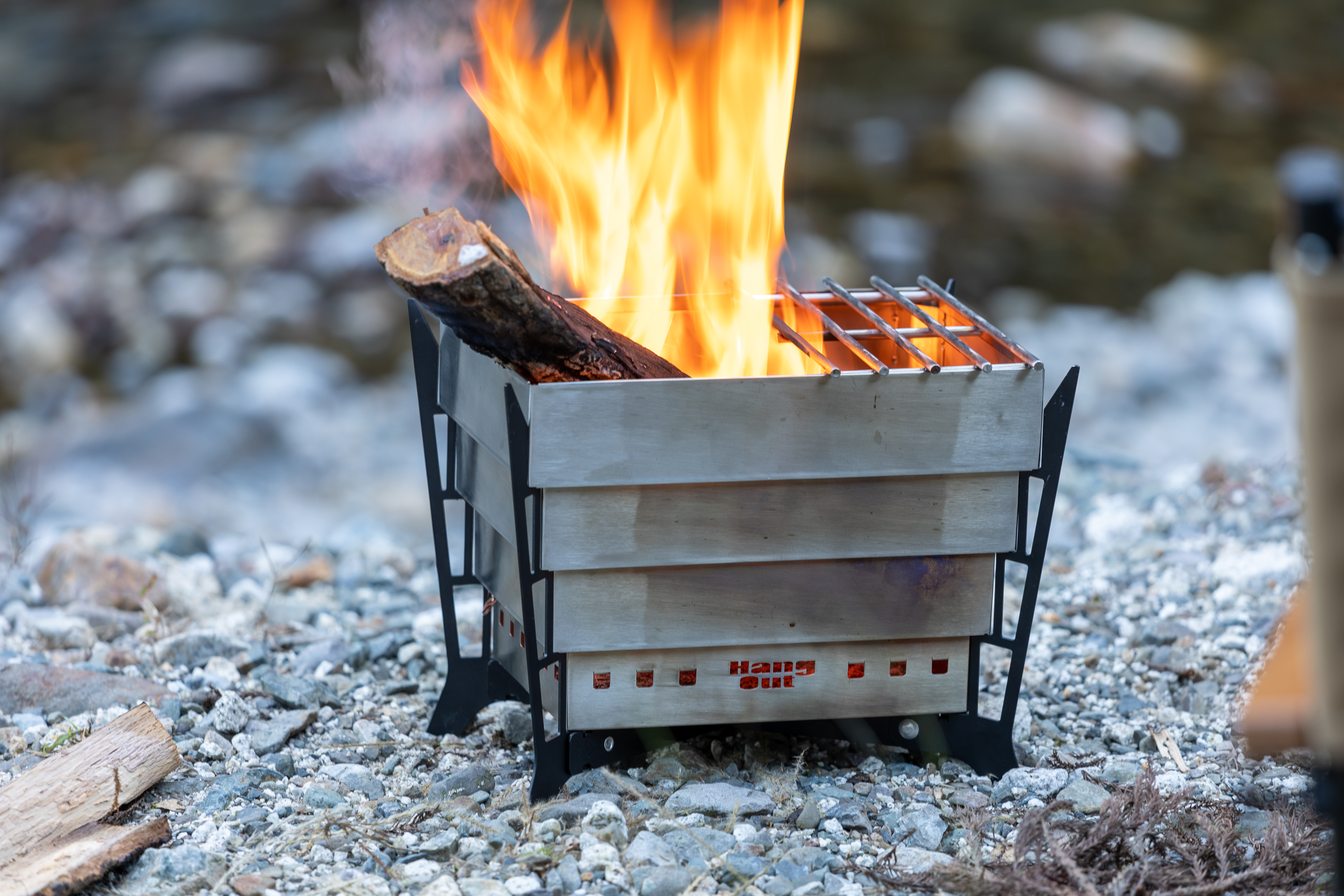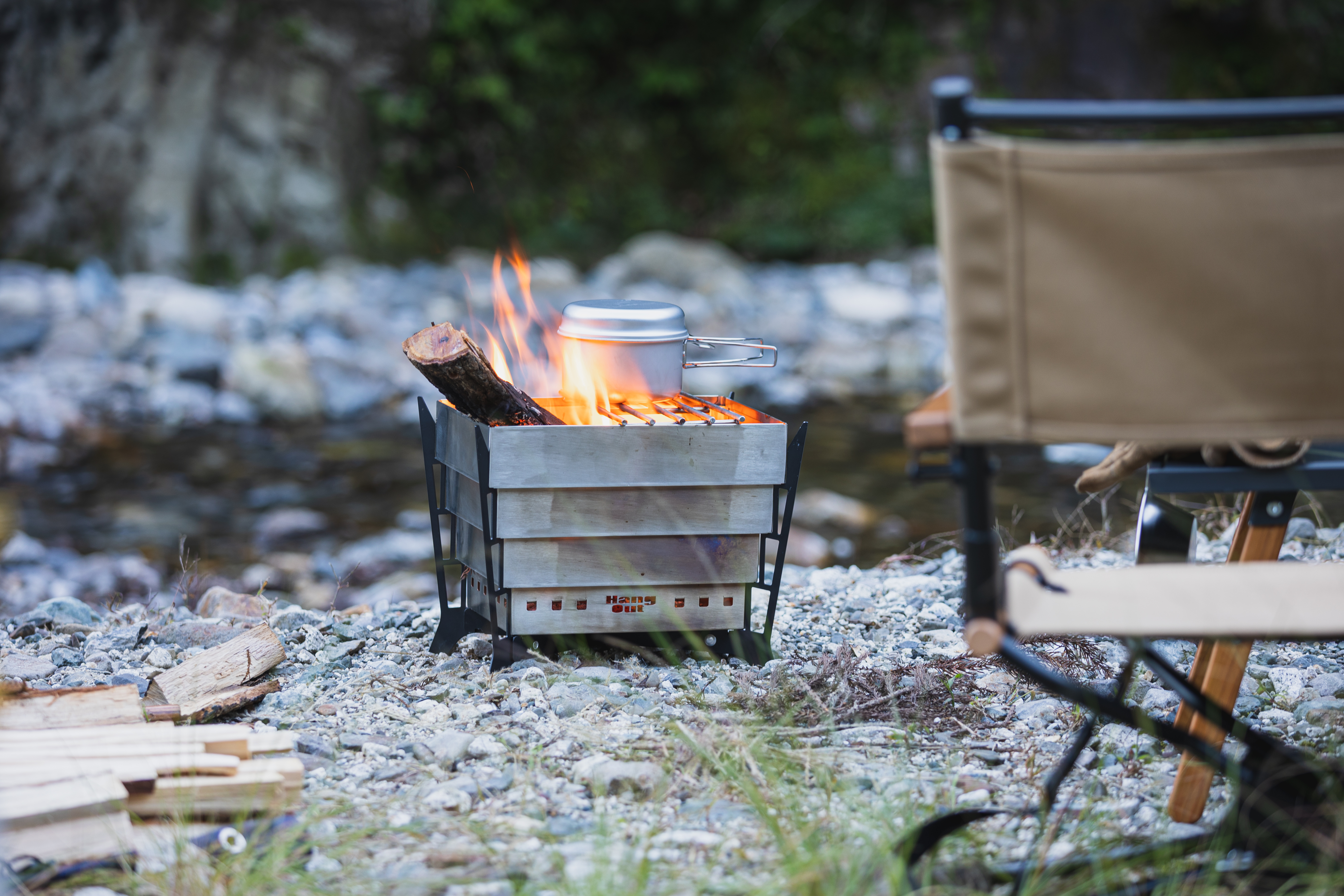 『Komorebi/コモレビ』は、焚火とその灯りを楽しむことをデザインした焚火台。3枚のシェードからもれ出る炎の光を間接照明のように楽しめます。また、煙突効果で燃焼力が高く、付属のゴトクで調理も可能。実用性も兼ね備えた焚火台です。