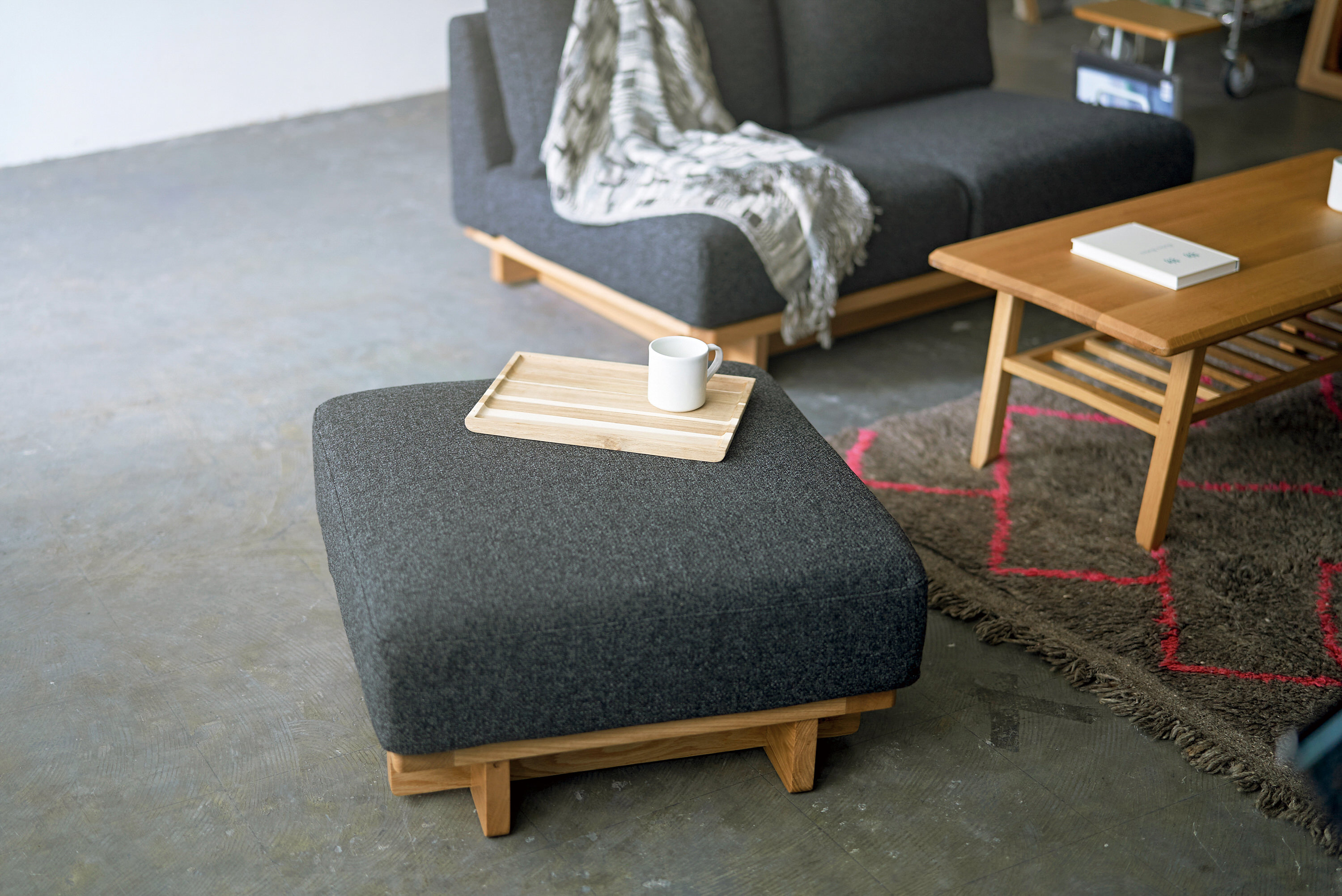 交差した天然木のフレームにボリュームのあるクッションを配置したソファです。座の高さは低めに抑えておりますので、どっしりと体を預けられます。2人掛け、1人掛け、オットマンを組み合わせることで自由にレイアウトできます。和にも洋にも合う雰囲気を持ったソファとなりました。