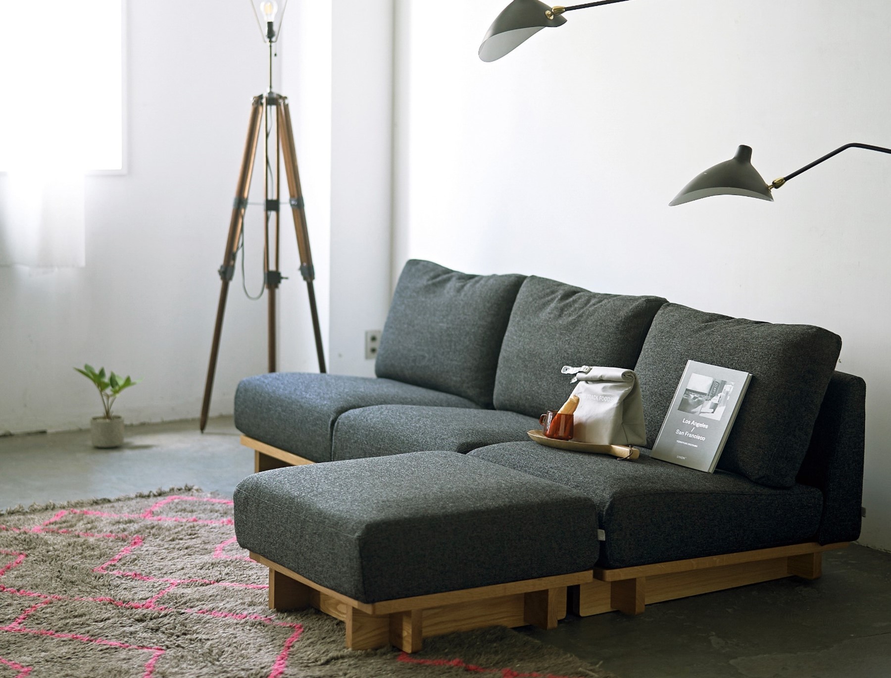 交差した天然木のフレームにボリュームのあるクッションを配置したソファです。座の高さは低めに抑えておりますので、どっしりと体を預けられます。2人掛け、1人掛け、オットマンを組み合わせることで自由にレイアウトできます。和にも洋にも合う雰囲気を持ったソファとなりました。
