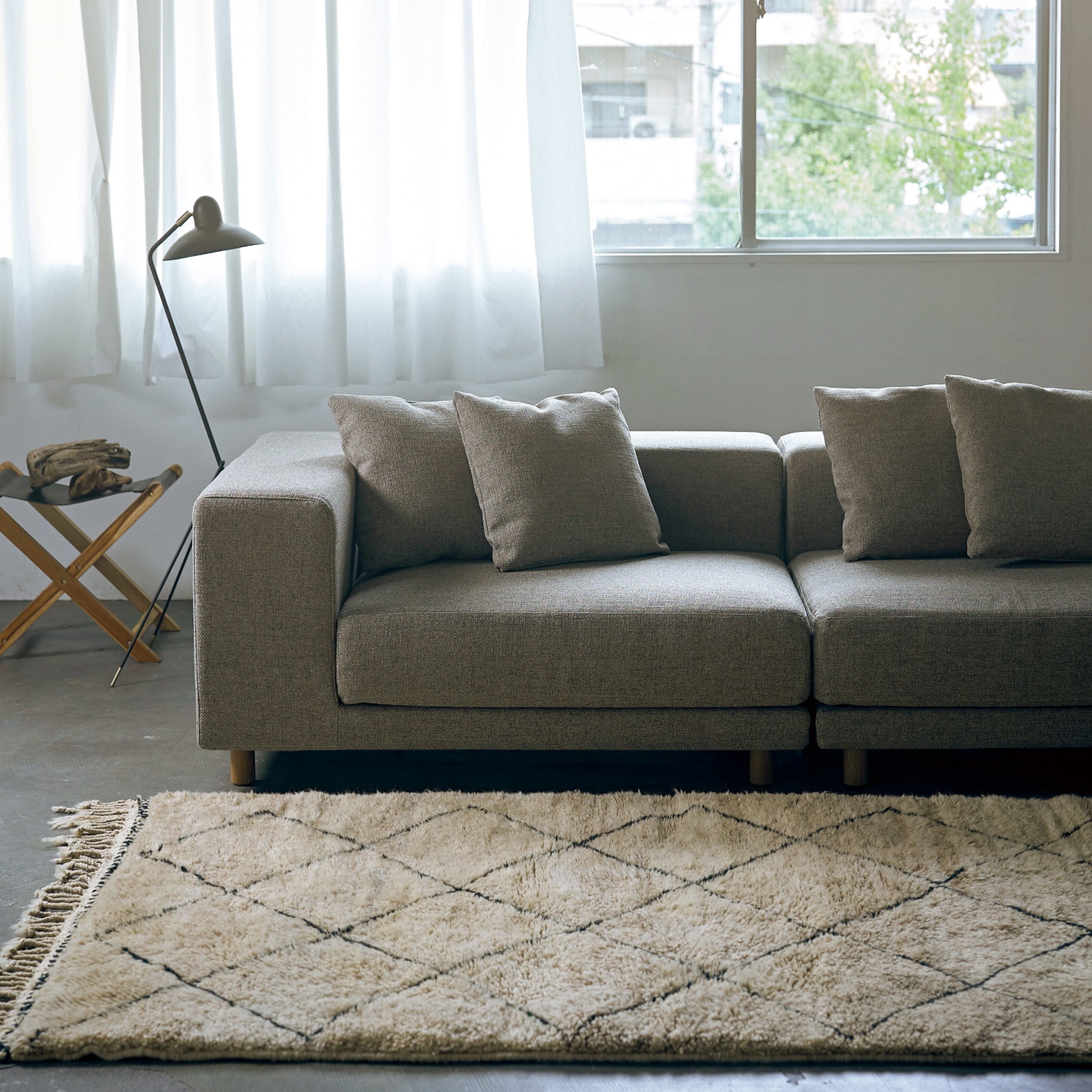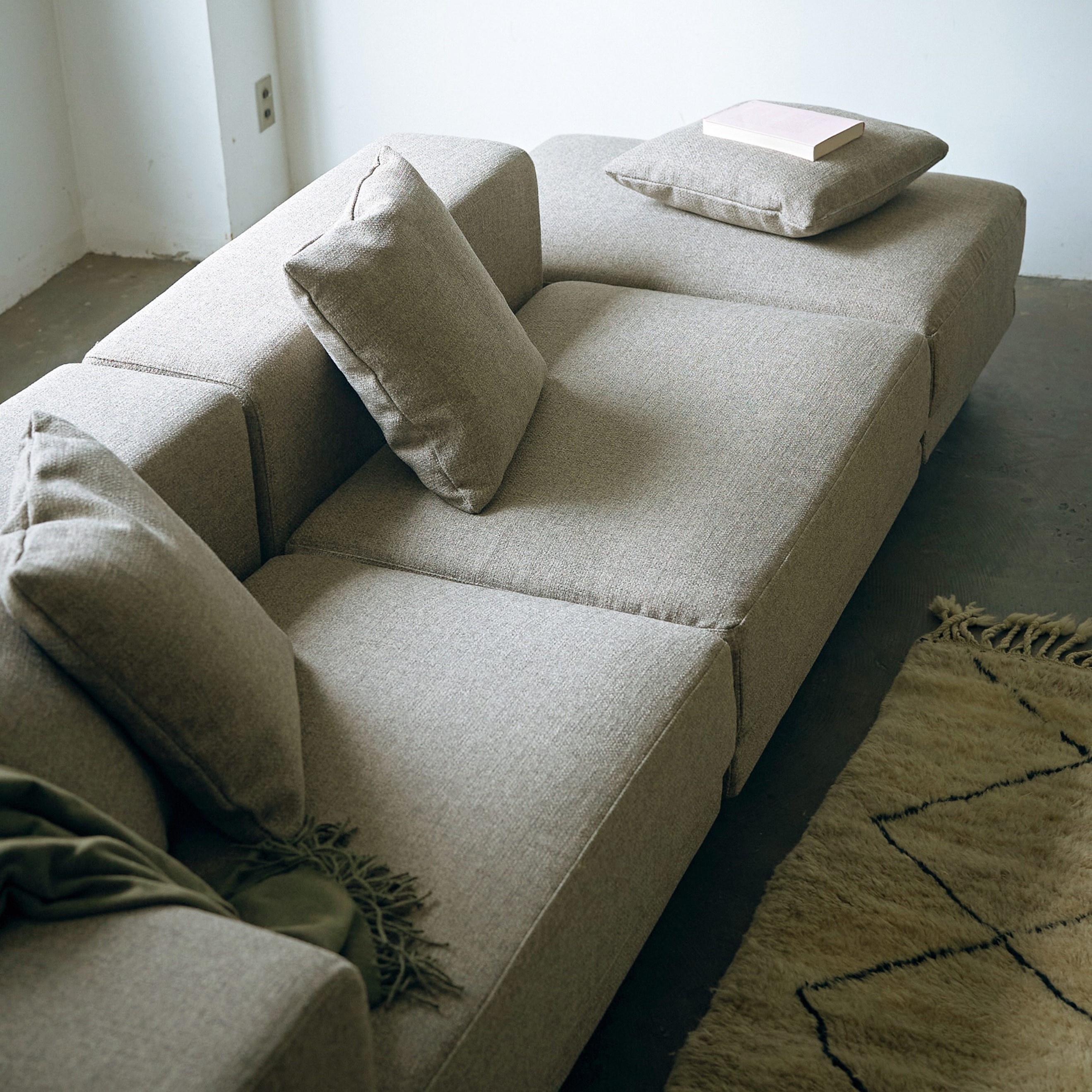 4つのアイテムすべての座クッションのサイズを合わせたことで様々な組み合わせが可能となりました。背、肘となる部分と座にボリュームを持たせつつ高さを抑えておりますので安定感のある佇まいです。背、肘となる部分には腰掛けることもでき、配置場所を選ばない、自由度の高いユニットソファです。