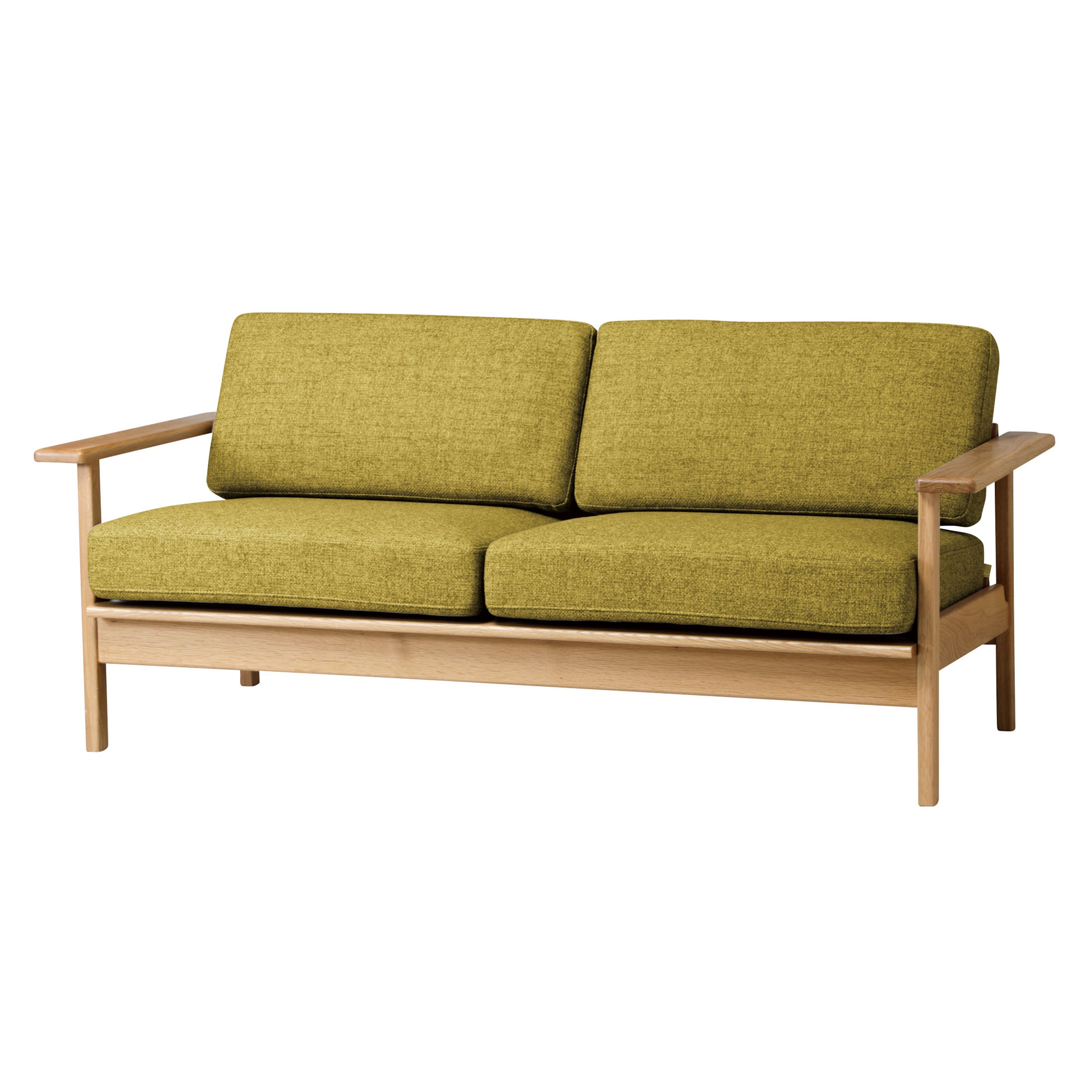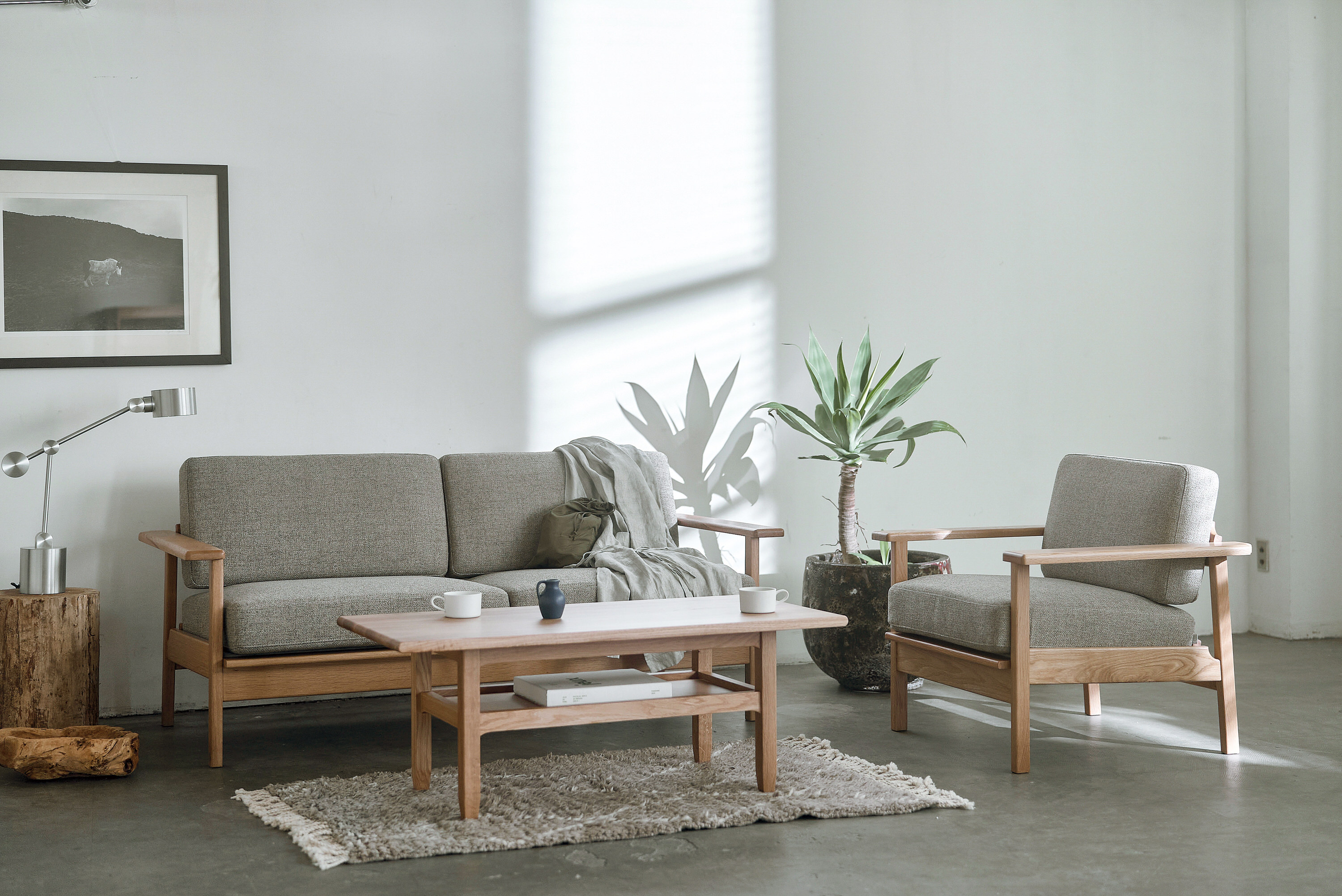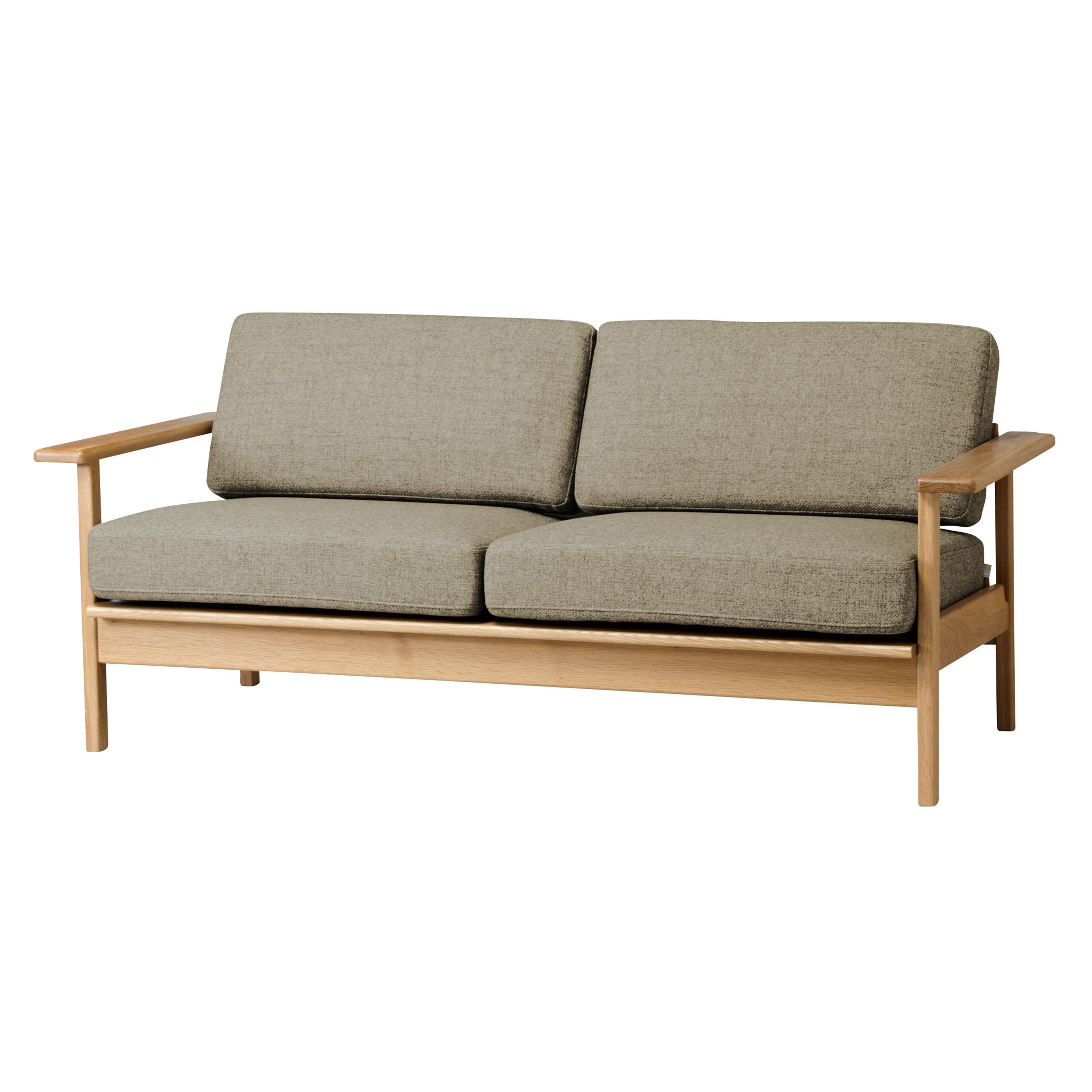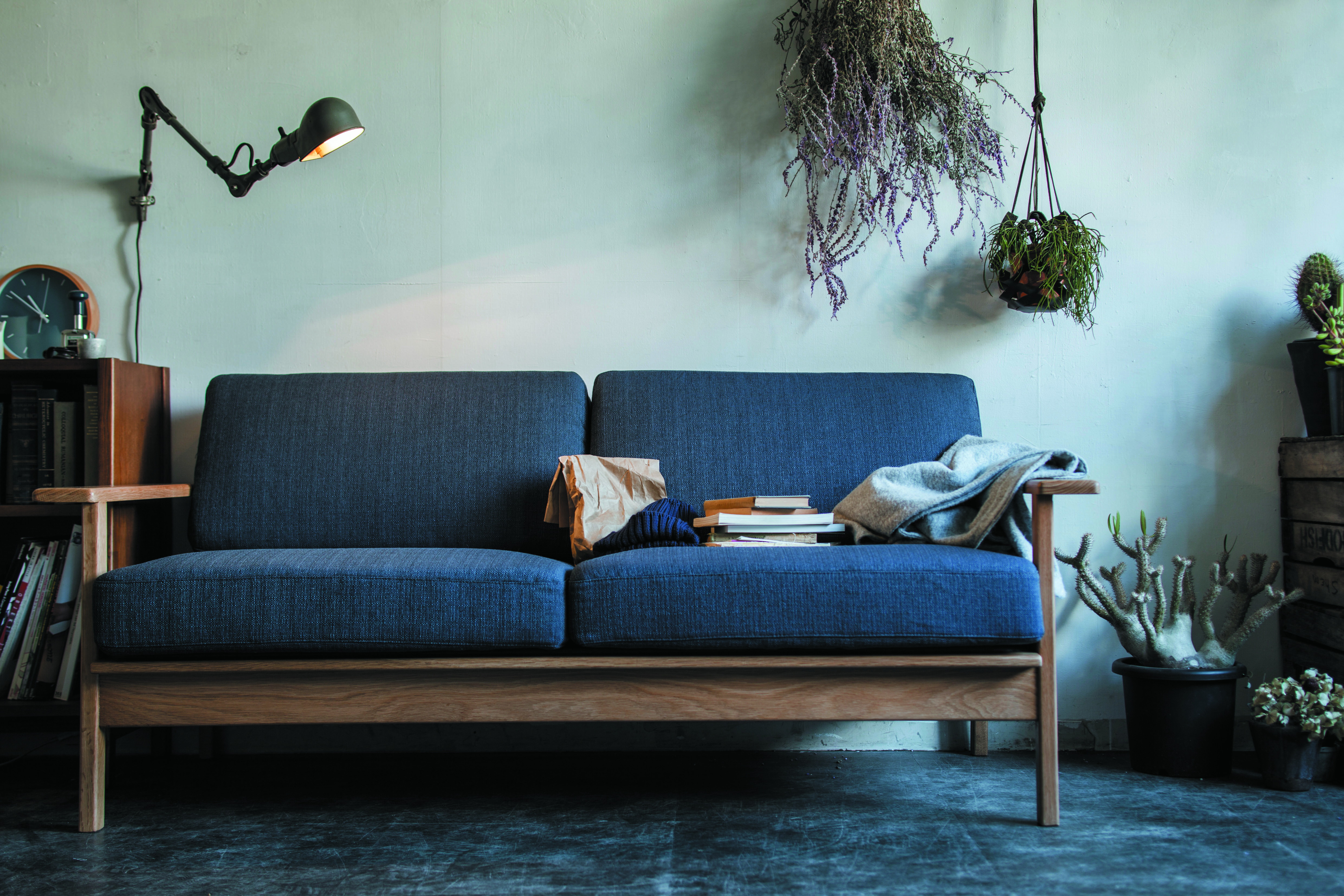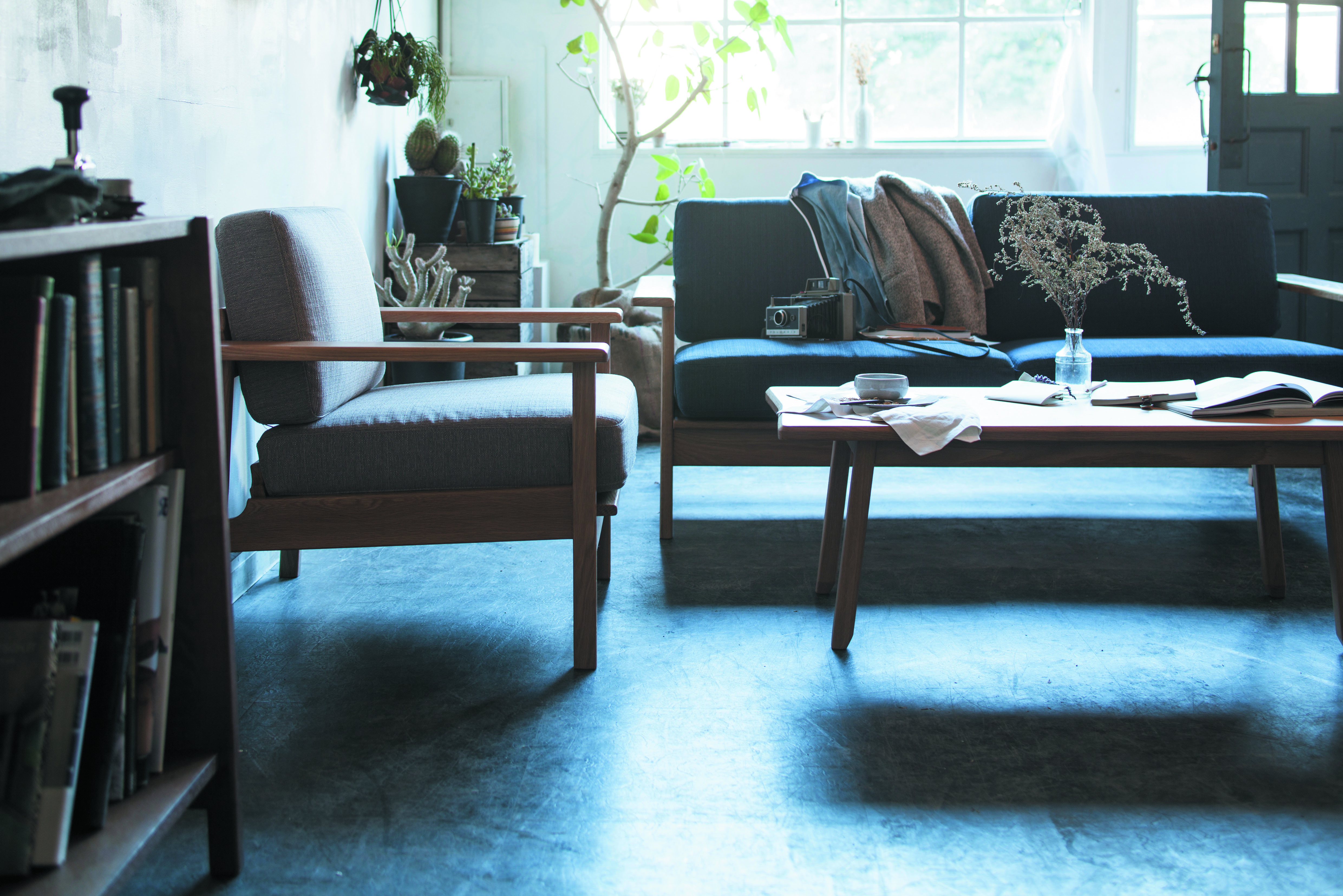 木板を組み合わせたシンプルな構造にフレームの一部を切り取ることでアクセントを加えた木フレームソファです。座は固めのウレタンと、柔らかいウレタンを組み合わせ、しっかりとした座り心地にこだわりました。この度、生地がより風合いの良いものにリニューアルしました。