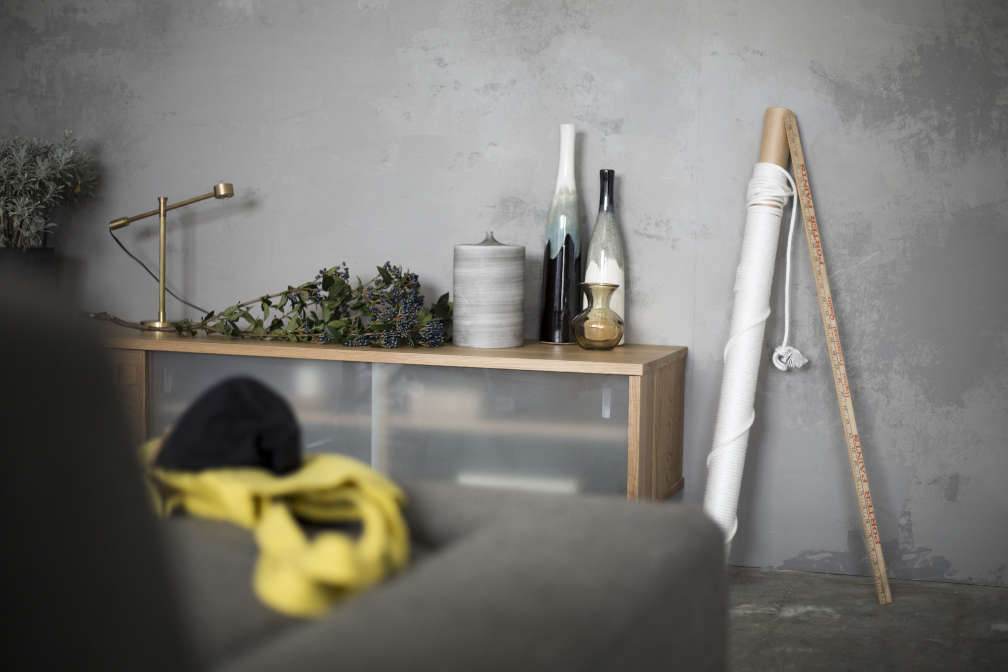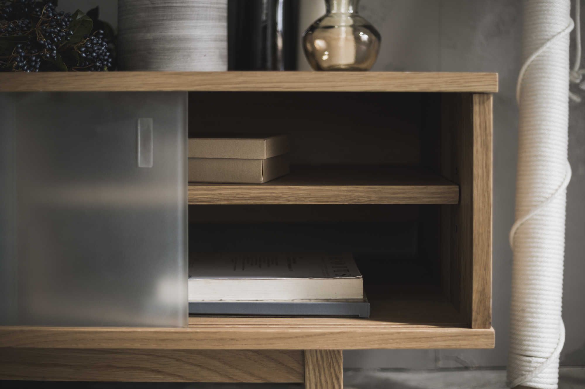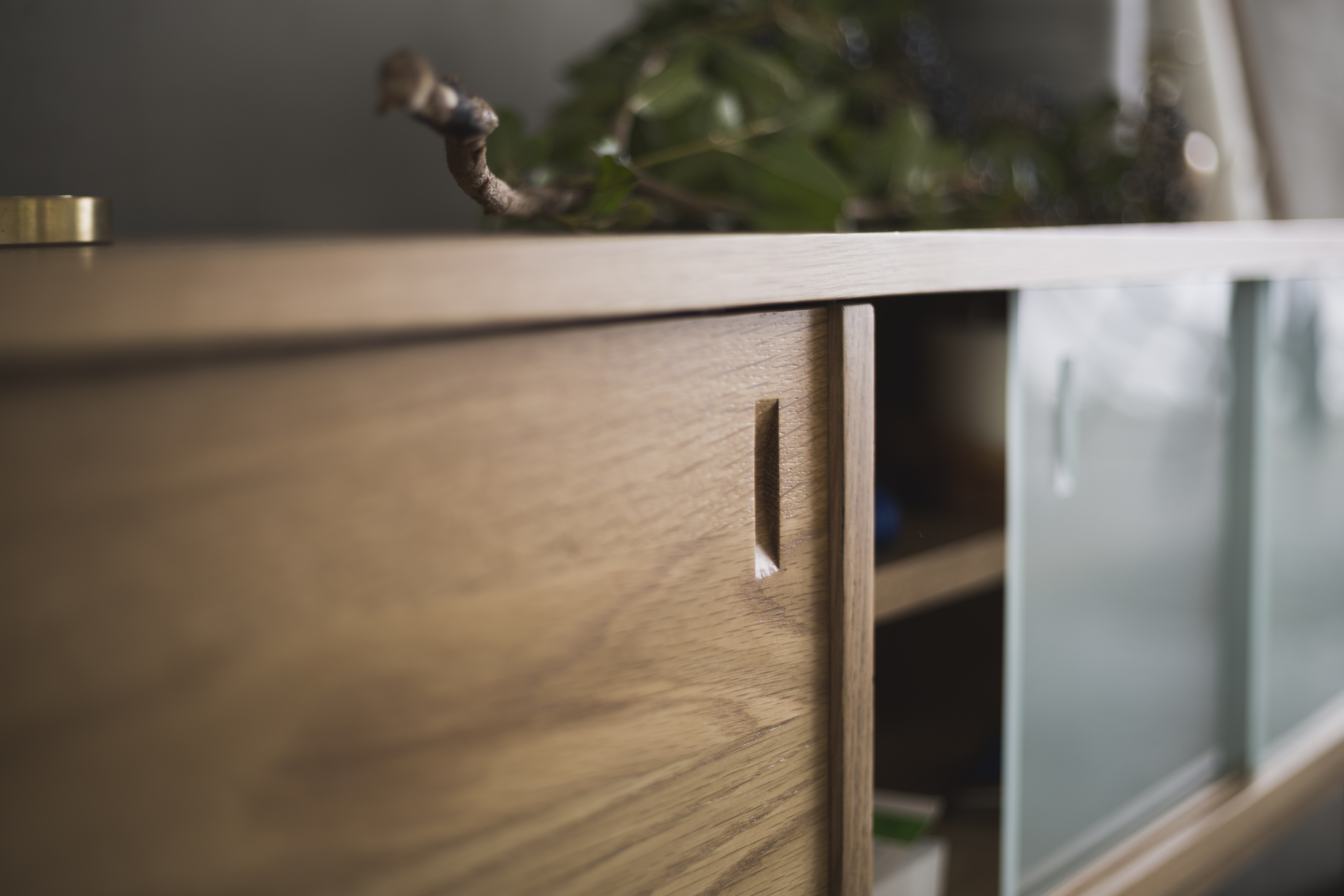 右側はフロストガラス、左側はオーク無垢材の戸となっており、右側はぼんやりと中が見える仕様です。