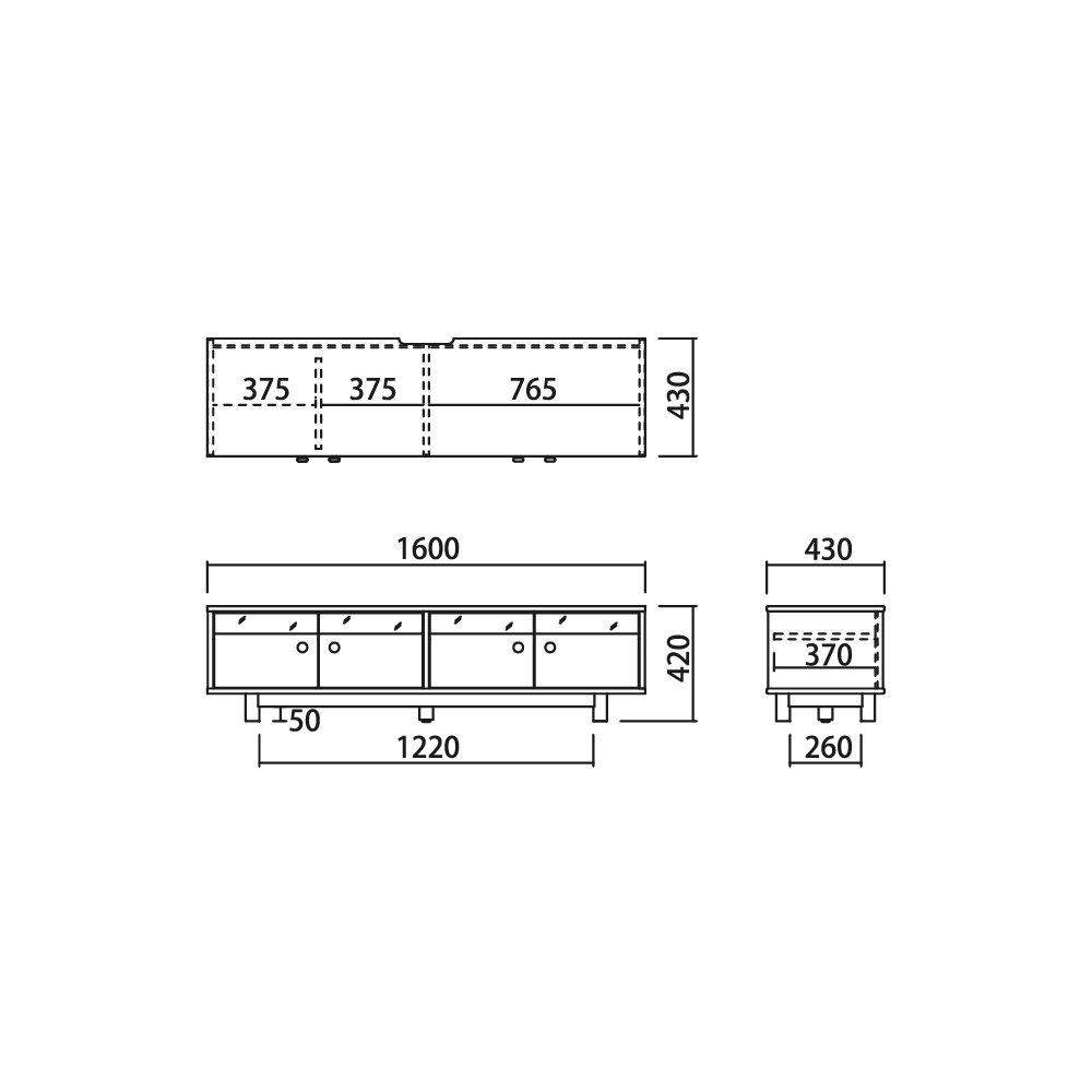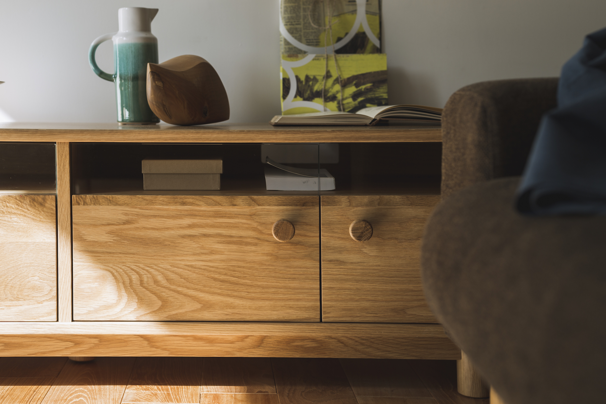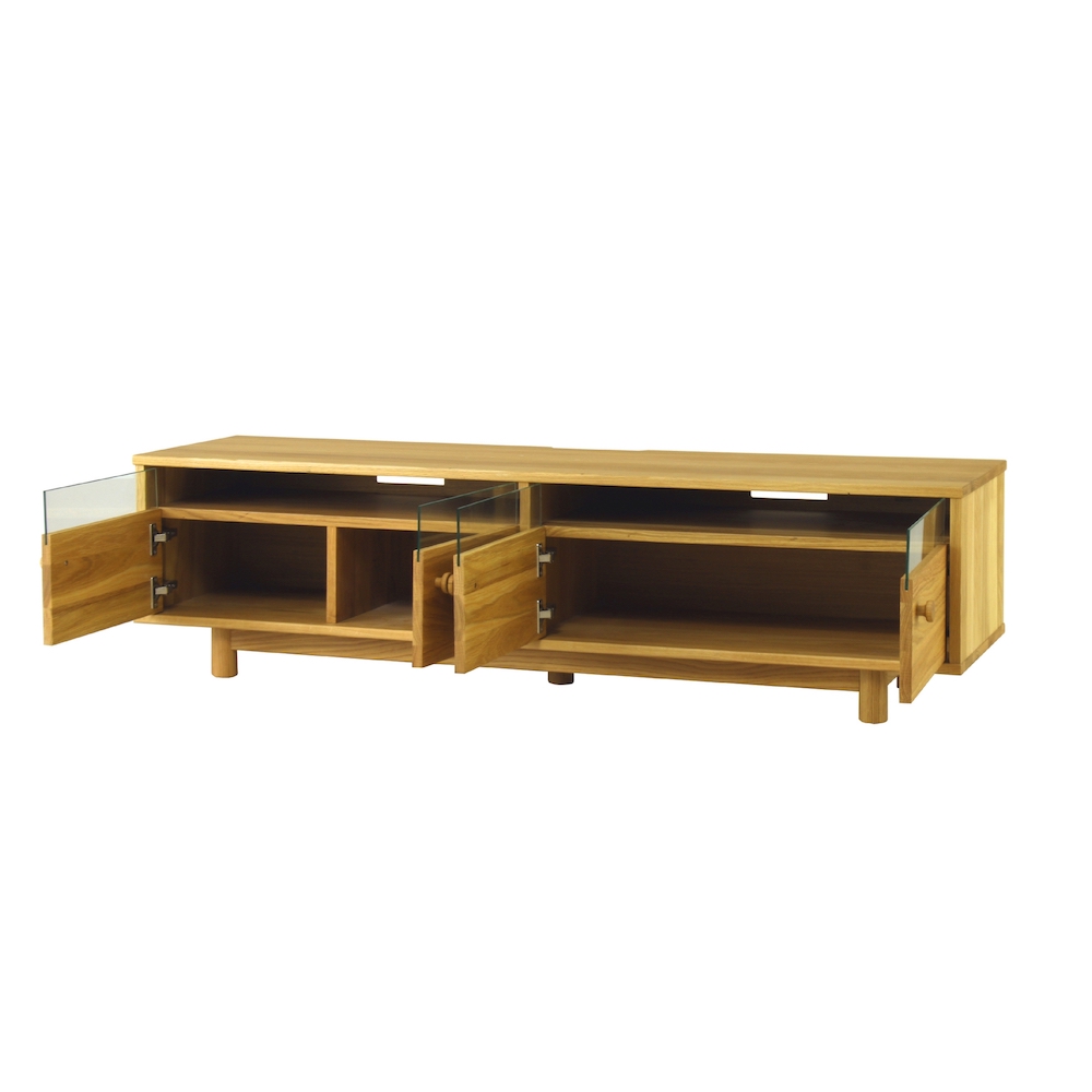 開き戸の上部にガラスの窓があるローボードです。クリアガラスの窓のため、AV機器のリモコンが使用できます。窓を開けると大容量の収納となっており、たくさんのメディアや小物を収納できます。天板や棚にはコード用の隙間が設けられています。