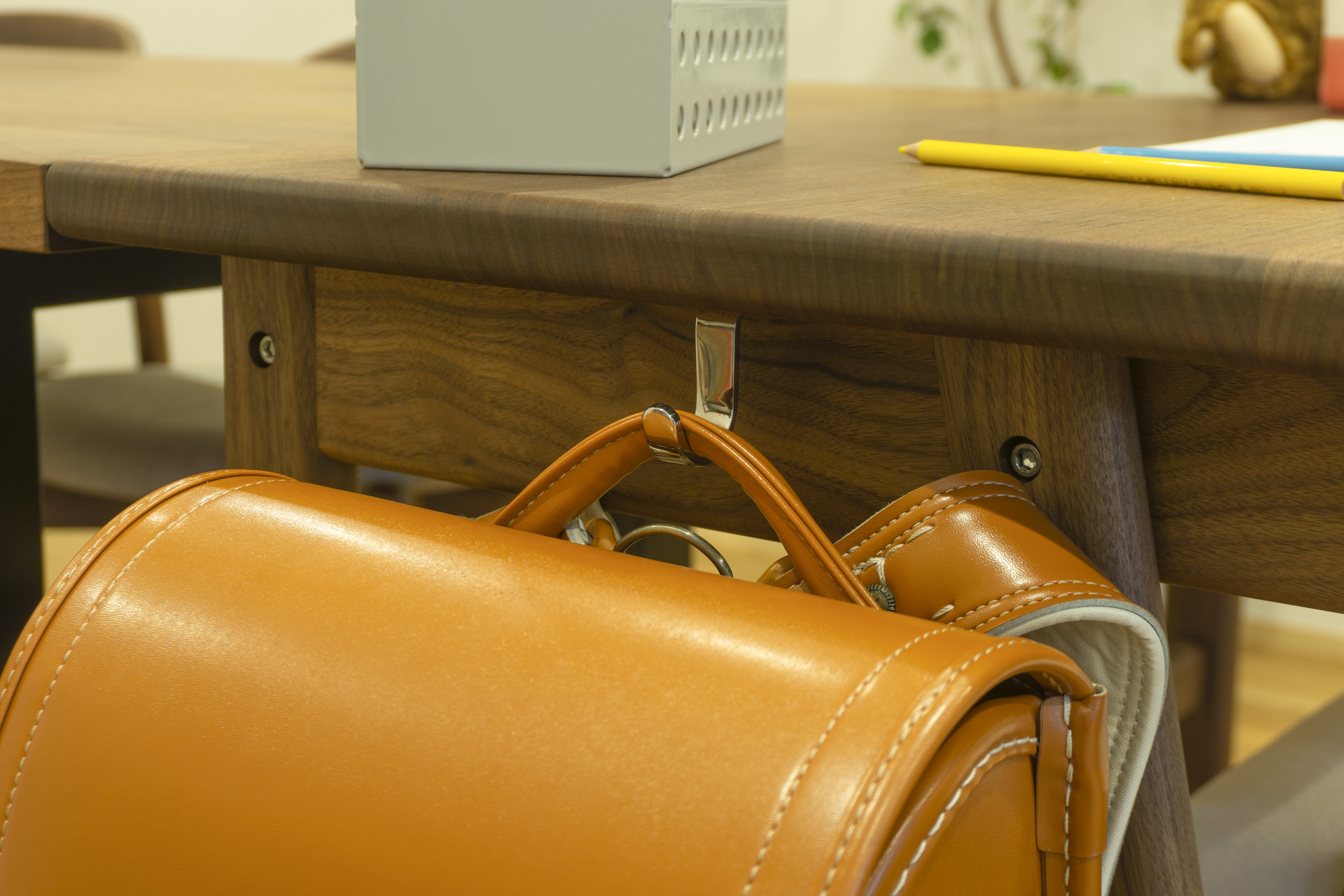 シンプルなデザインに引出しを2杯備え、デスク周りのものを収納でき、付属のフックは左右付け替えが可能です。