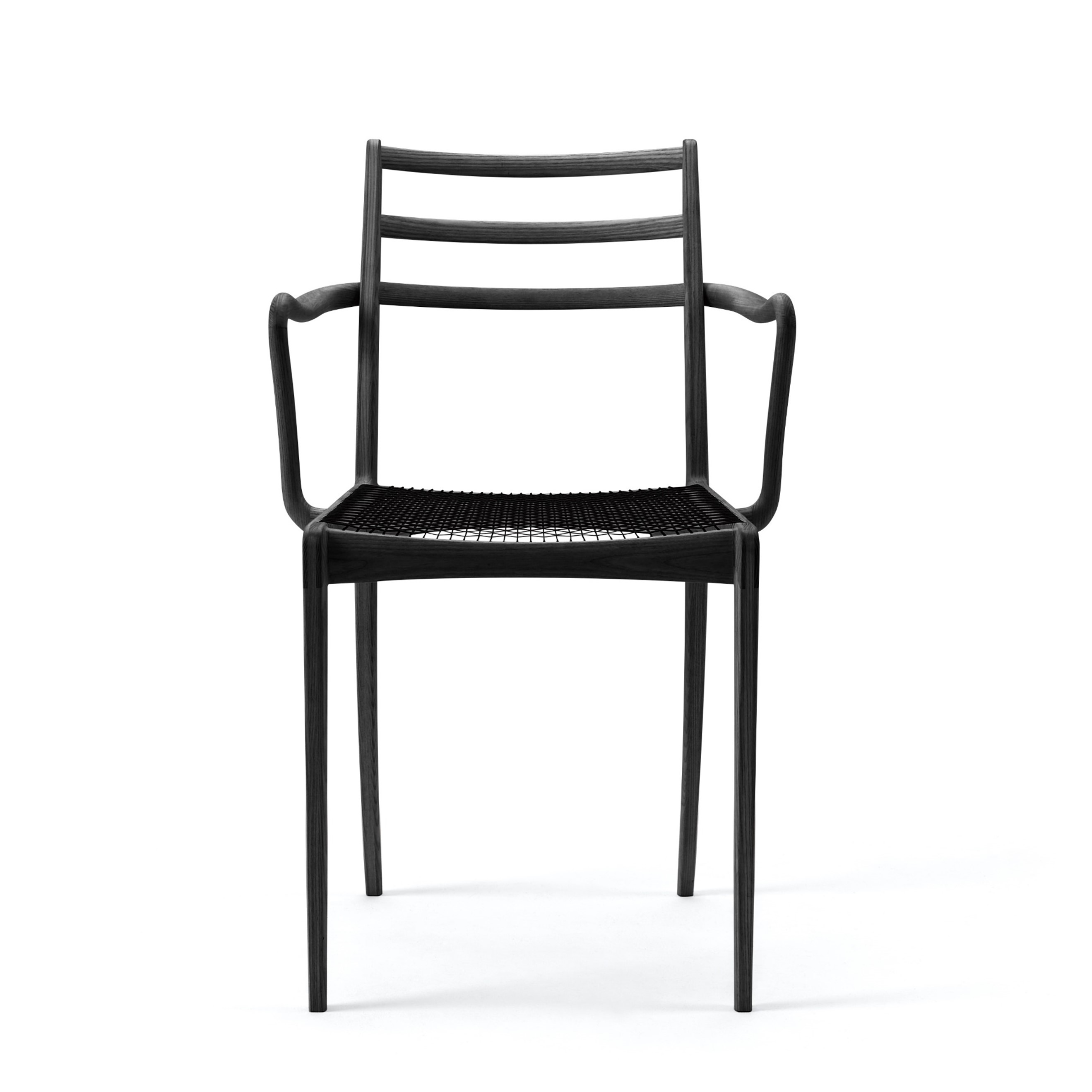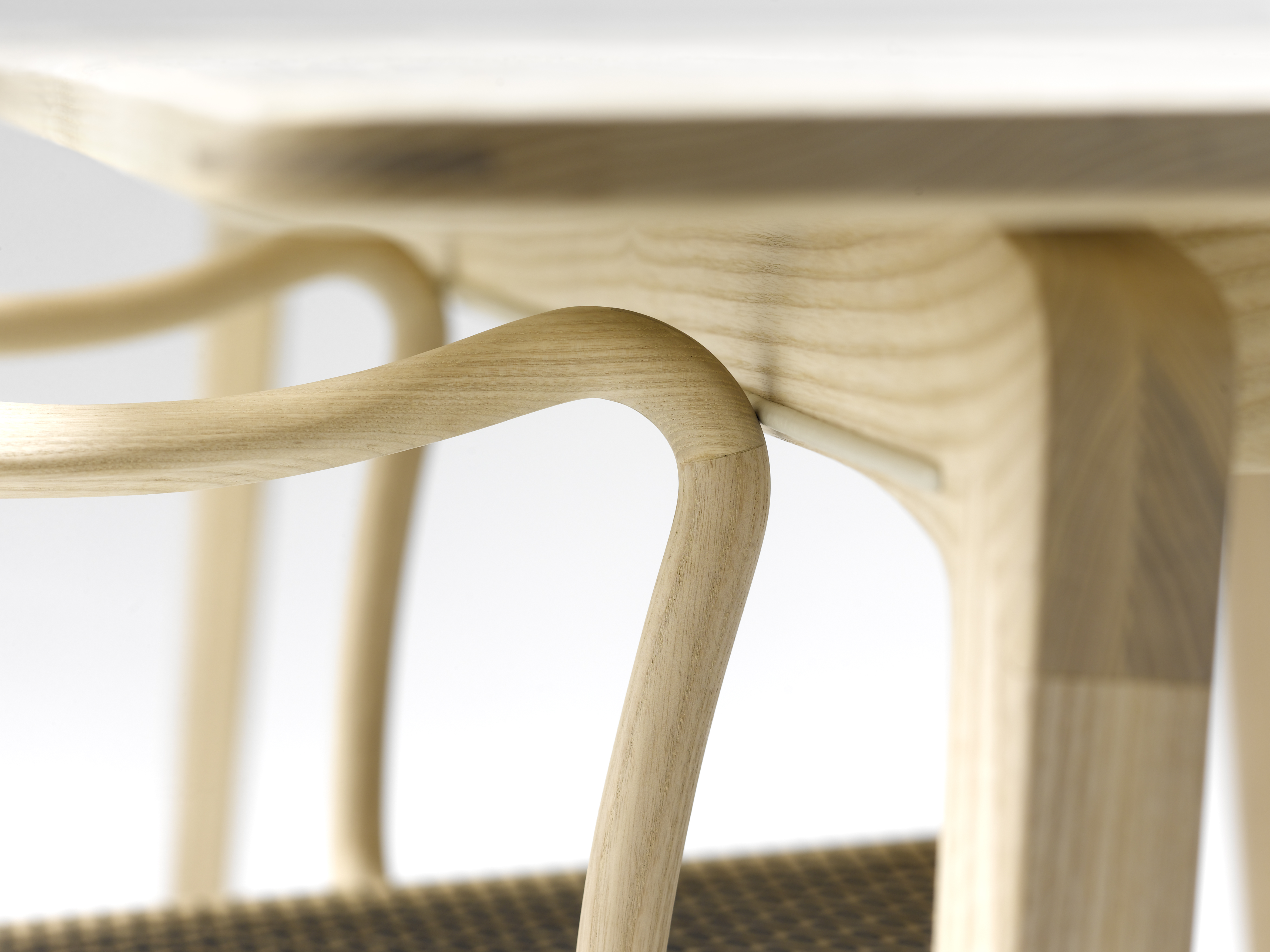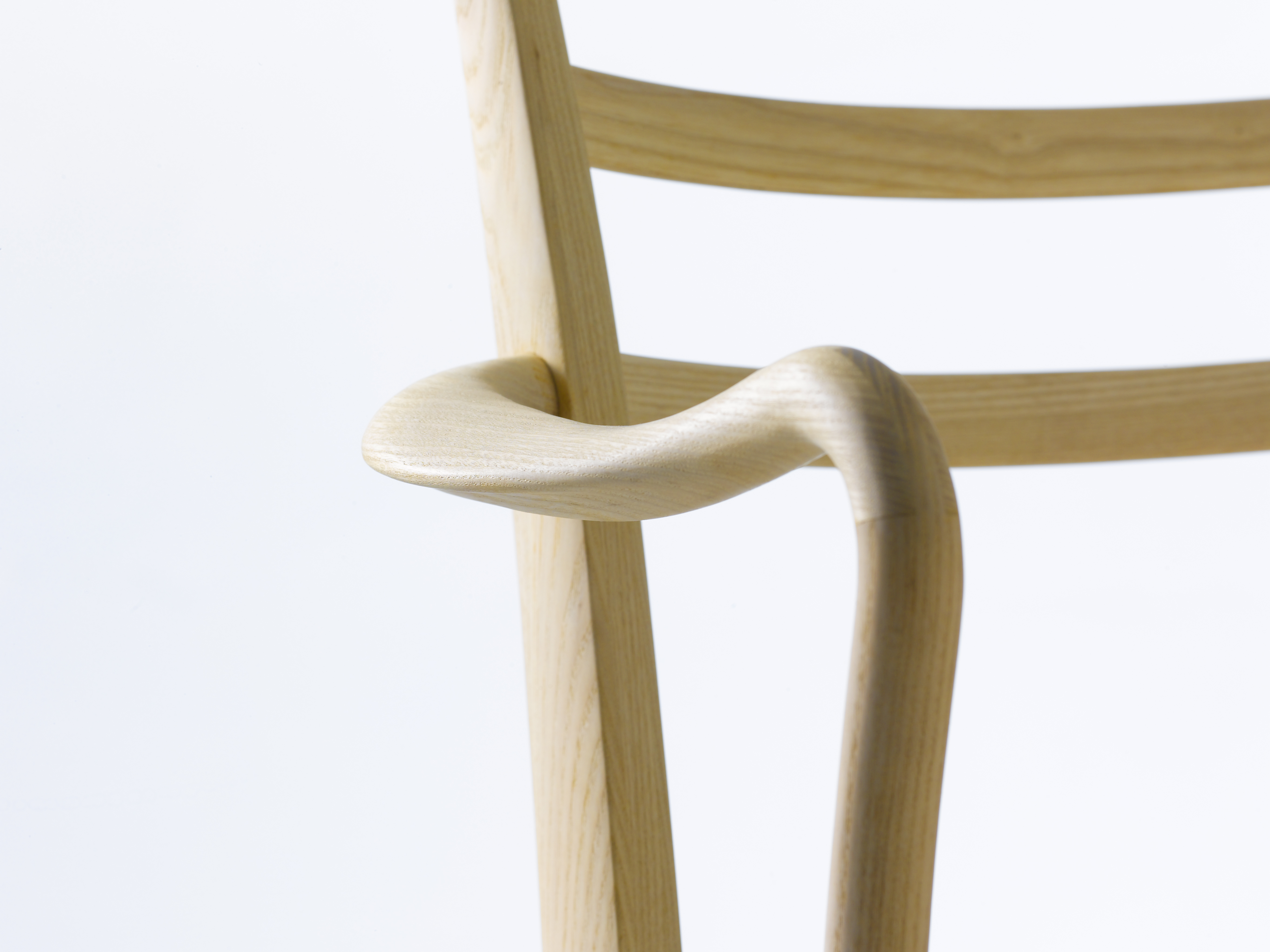細く美しい曲線美と、アーム付でありながらわずか2.5kgの軽さを誇るチェア。ゆるやかなカーブを描くアームレストは、ミニマル構造の造形美を際立たせています。上品さ・軽さ・シンプルさをキーワードに、デンマークのデザイナー、ハンス・S・ヤコブセンと日本の木工家具メーカーが共同開発し、軽さと強度を両立するため、数え切れないほどの試作とテストを行って辿り着いたのは、3層のラミネートフレーム構造。3層の木材の複雑な組み合わせが、丈夫で美しい、軽量なチェアを実現しました。