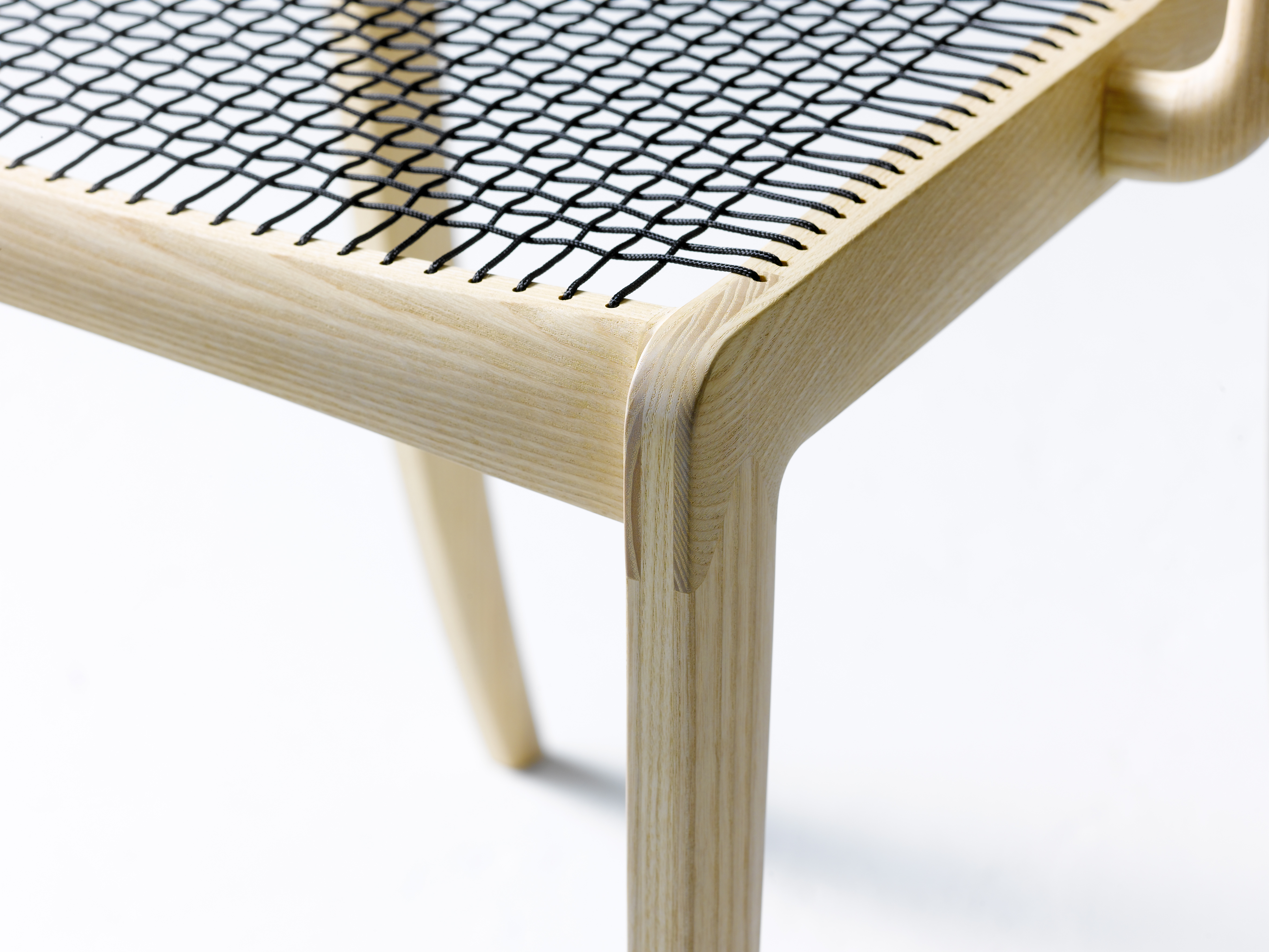 水にも強く魚網などにも使われる素材を編み込んだ座面は、最適な寸法、独特の織り方により、強さと軽さを備えると同時に、繊細な表情と透明感を織りなしています。余計なものをなくし、必要なものだけを残したしなやかで軽やかな造形が、軽やかに舞うような空気を暮らしに纏います。