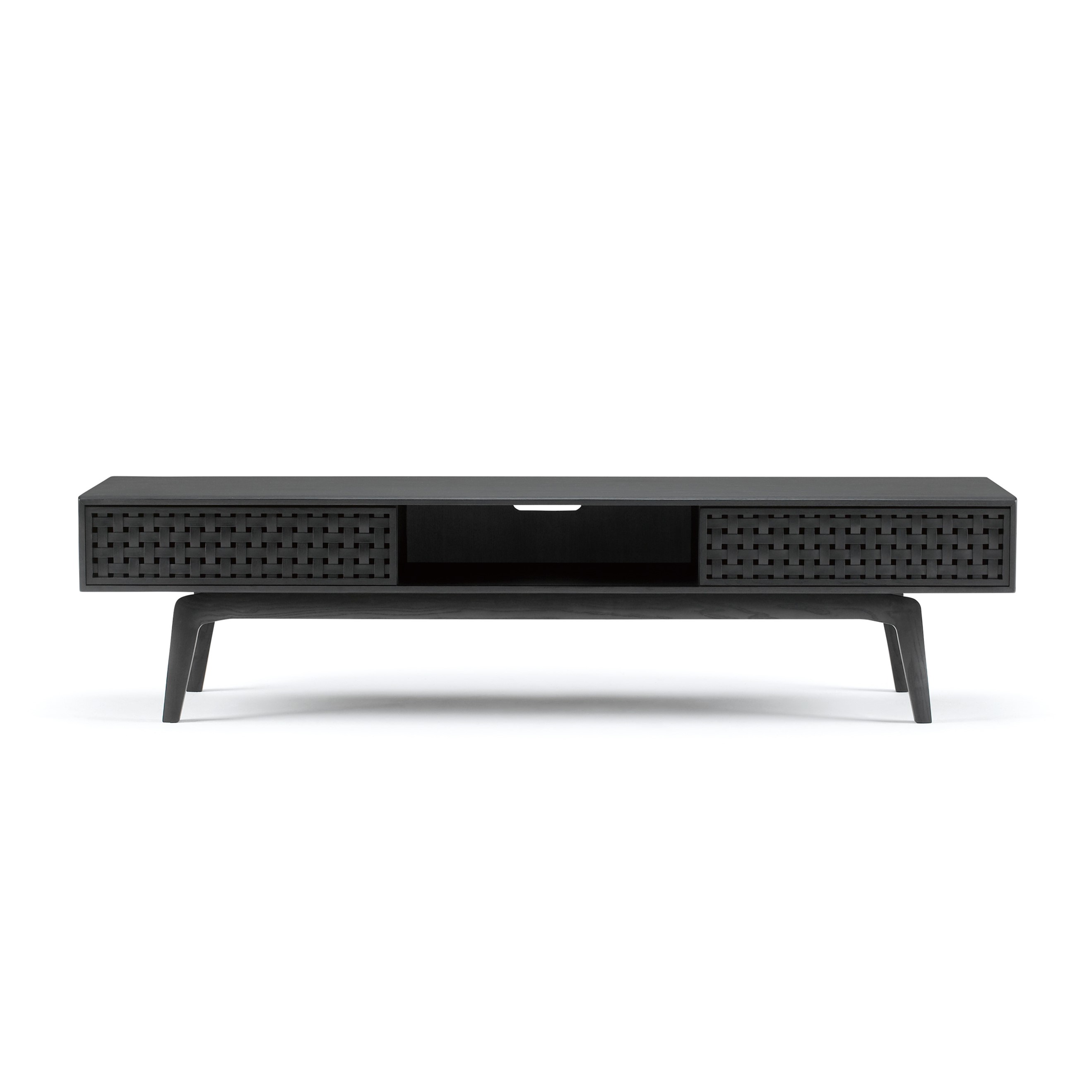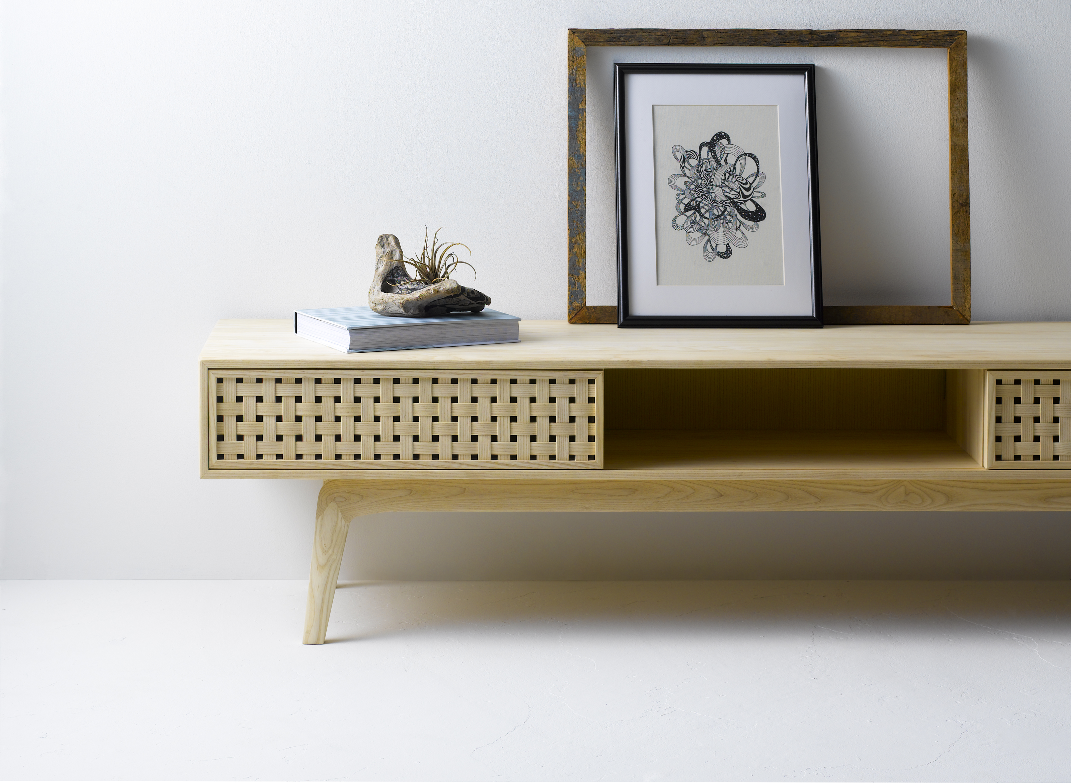 無垢材を編み込んだ前扉が、軽やかな空気感を印象付けるTVボード。