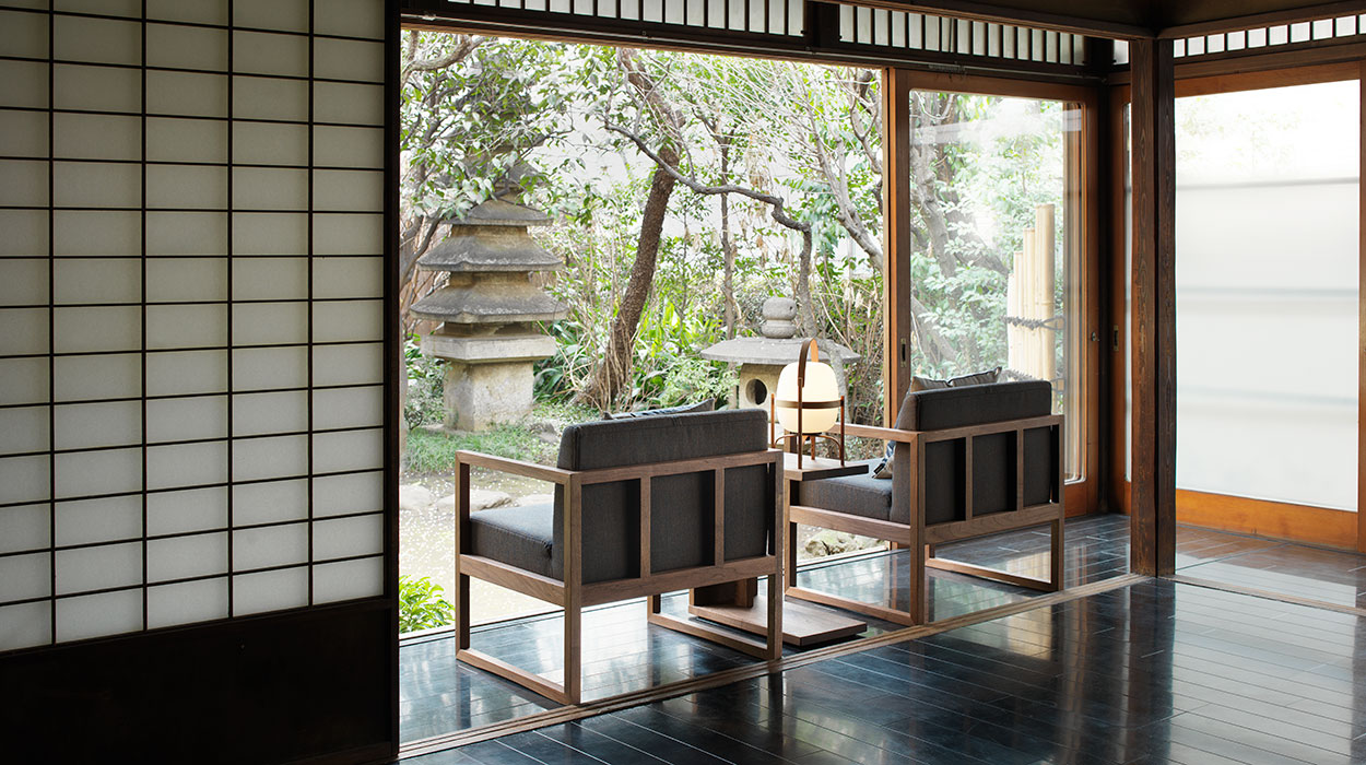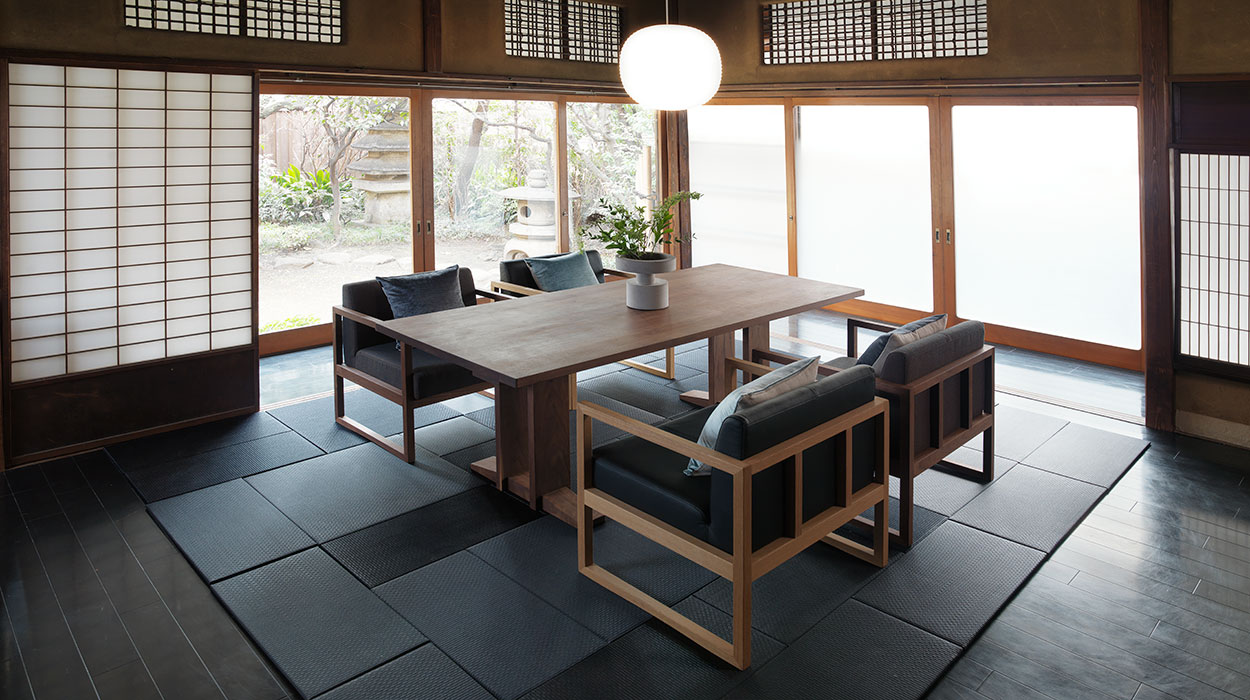 ウォールナットの無垢材で作られたシンプルなフレームは、畳が描く垂直な線とともに静謐な空間をつくりあげます。