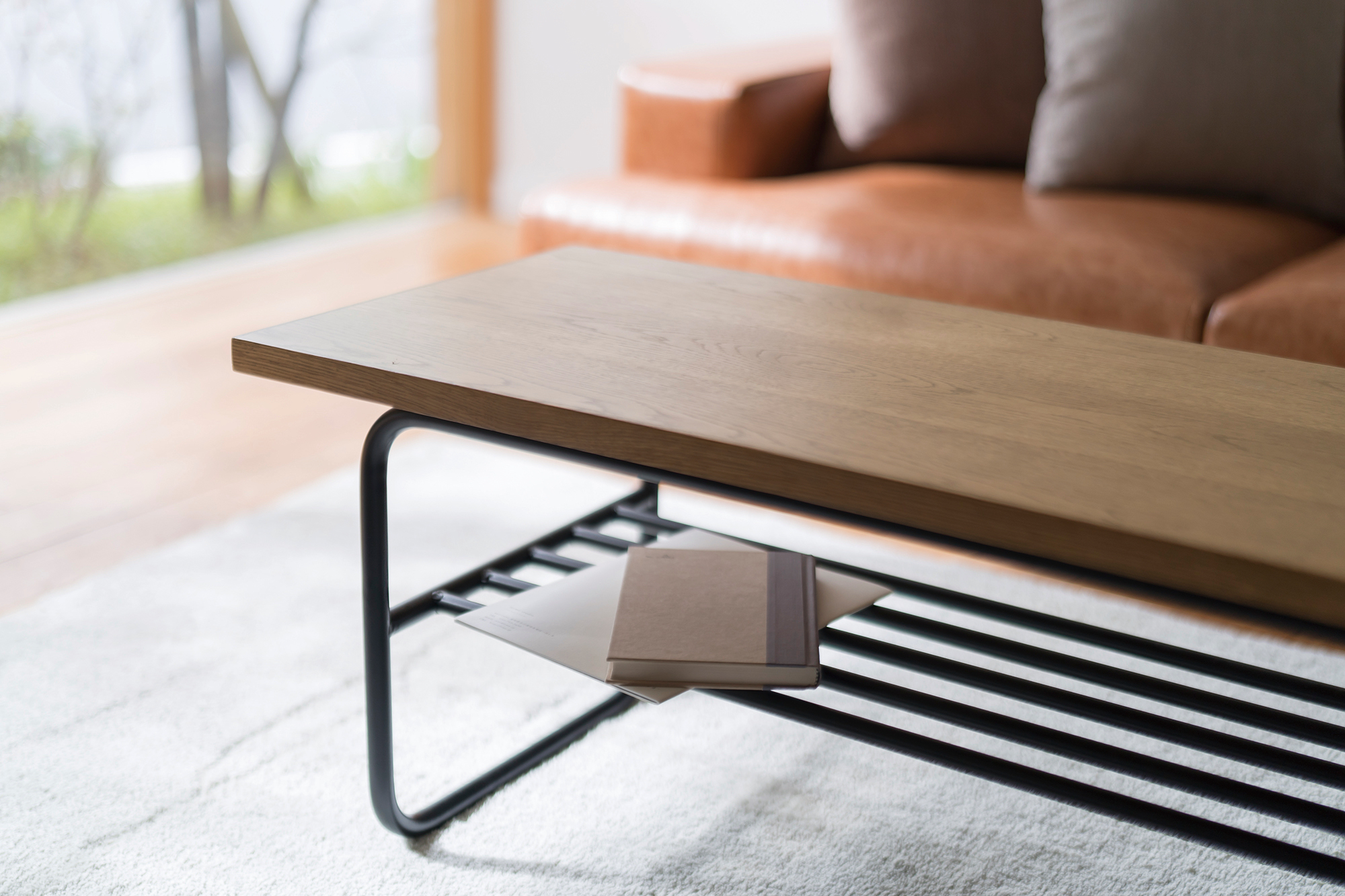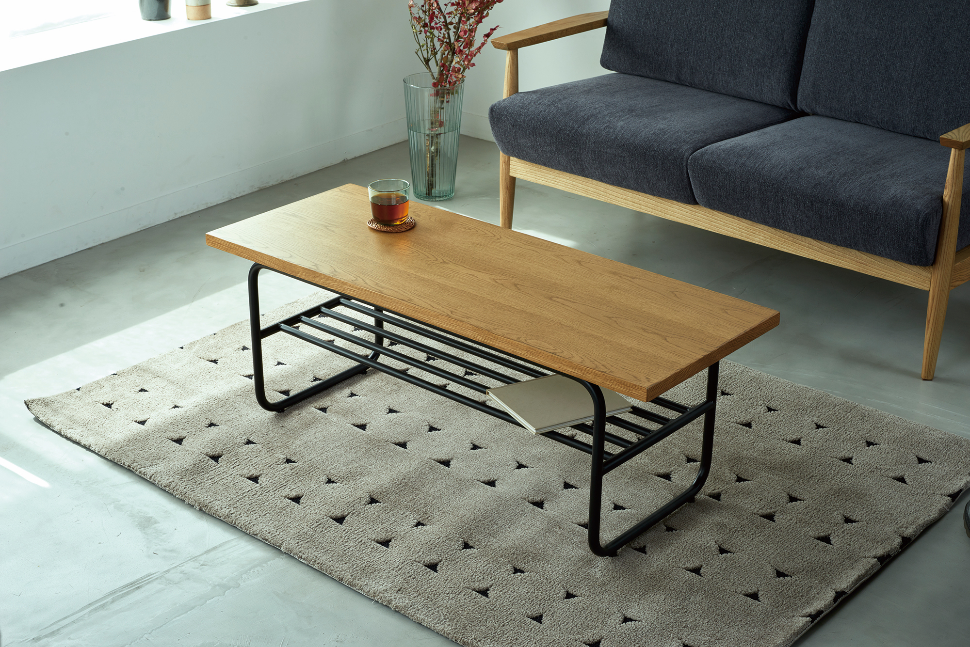 置く場所を選ばないスタンダードな形状のセンターテーブルです。小物の収納に便利な棚付きです。