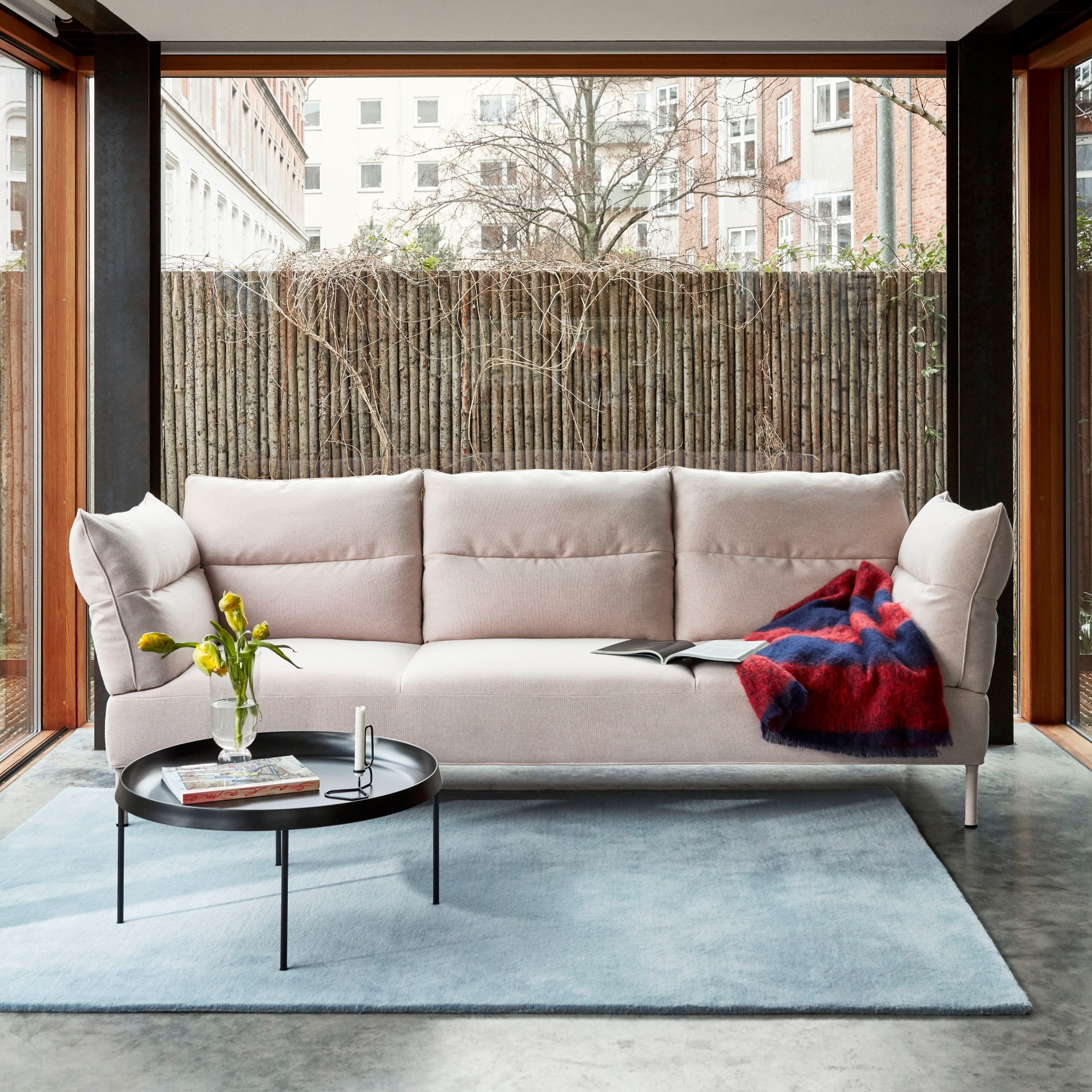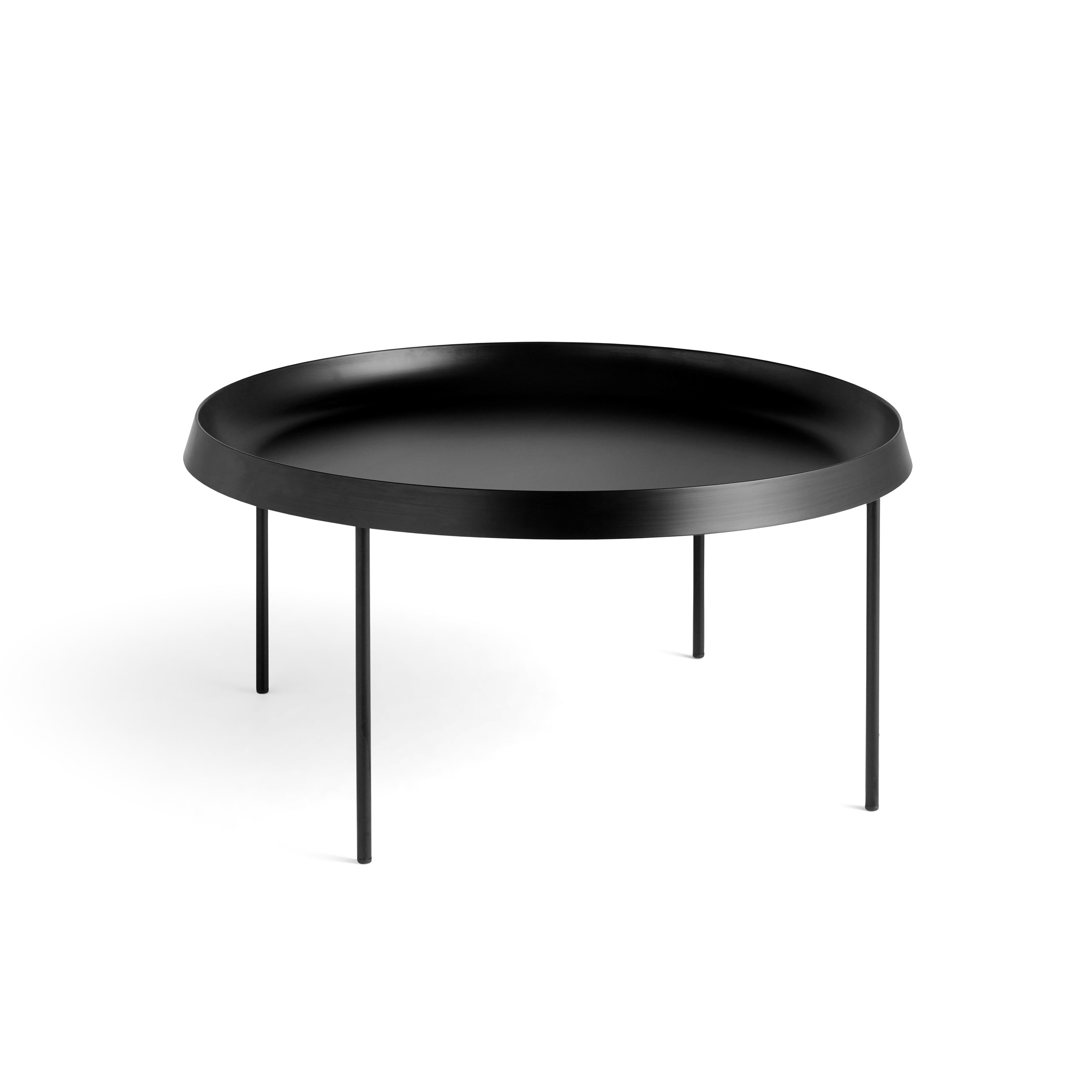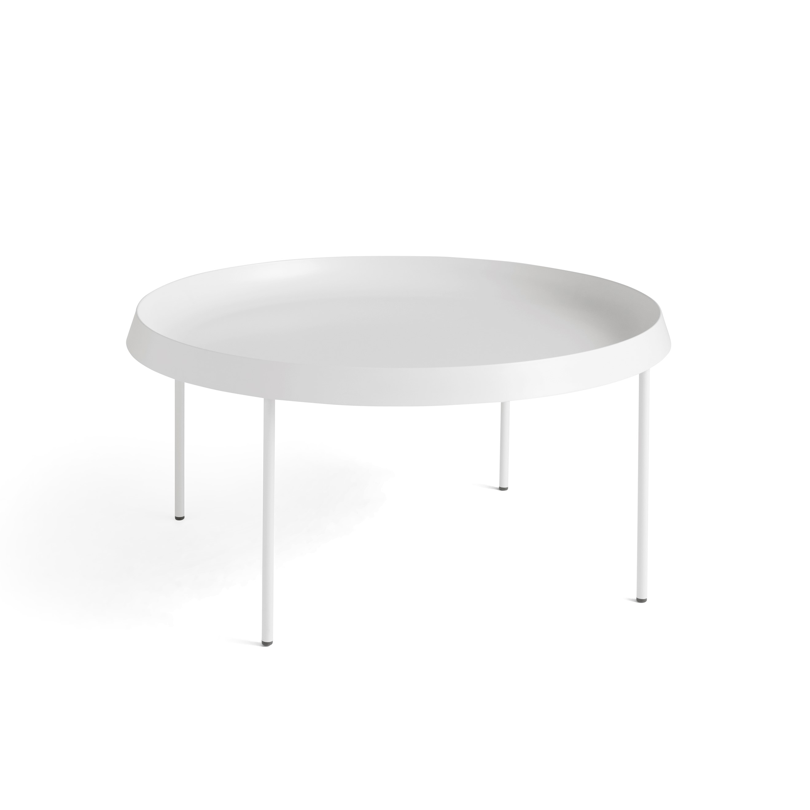 丈夫で持ちやすい縁のあるラウンド形の薄いスチール製のトレイと、スチールチューブでできた4本脚フレームというたった2つの基本的な要素で構成されたミニマルなデザインです。