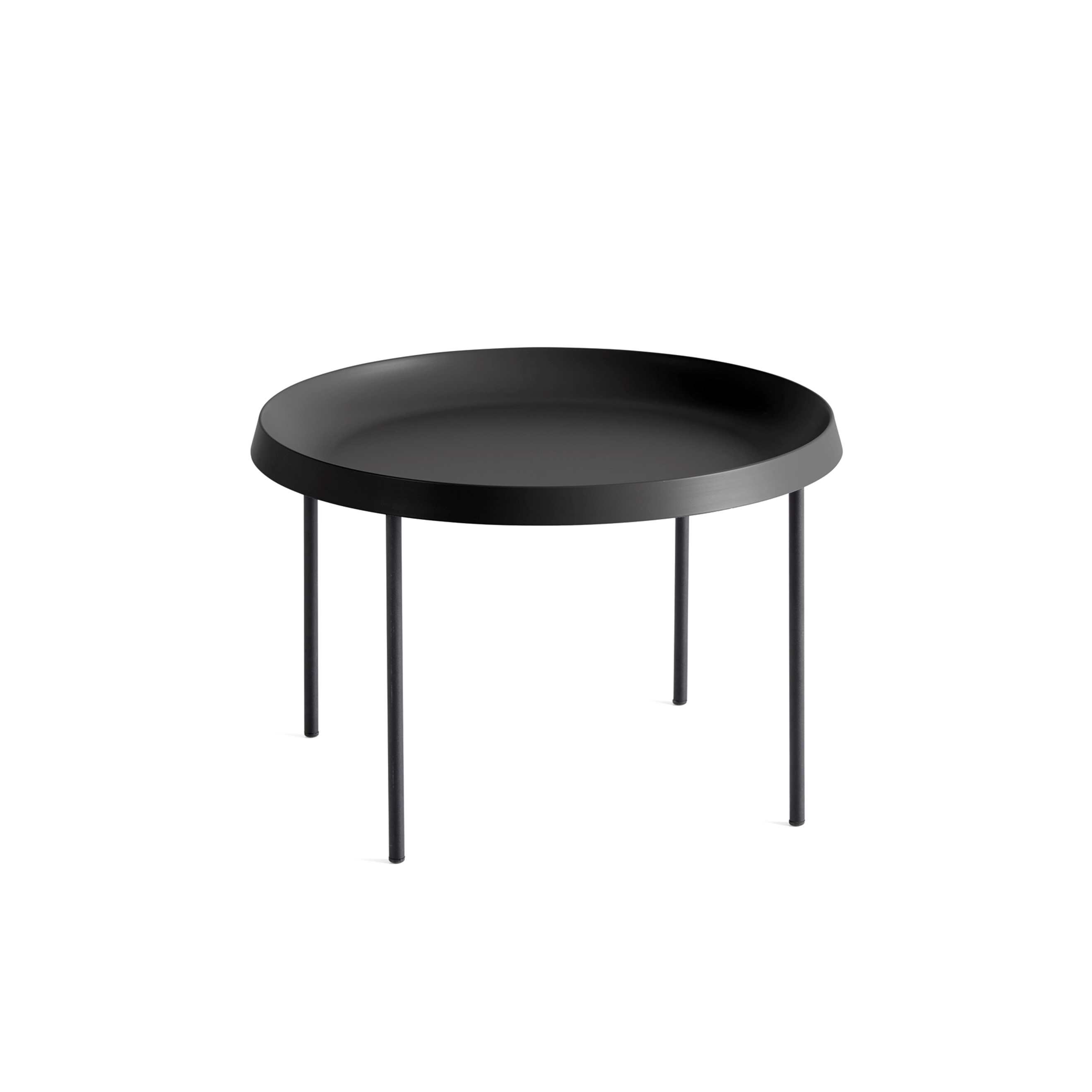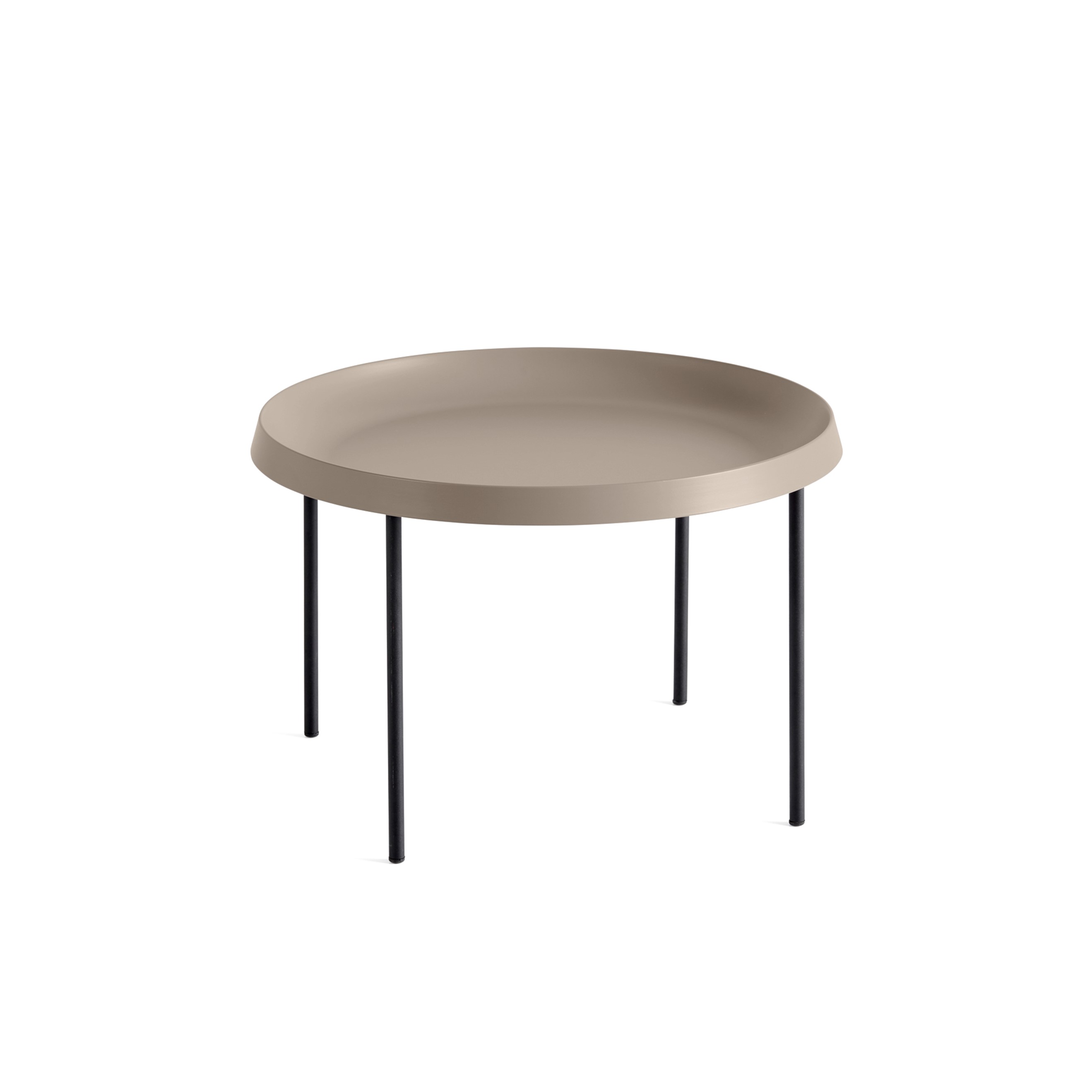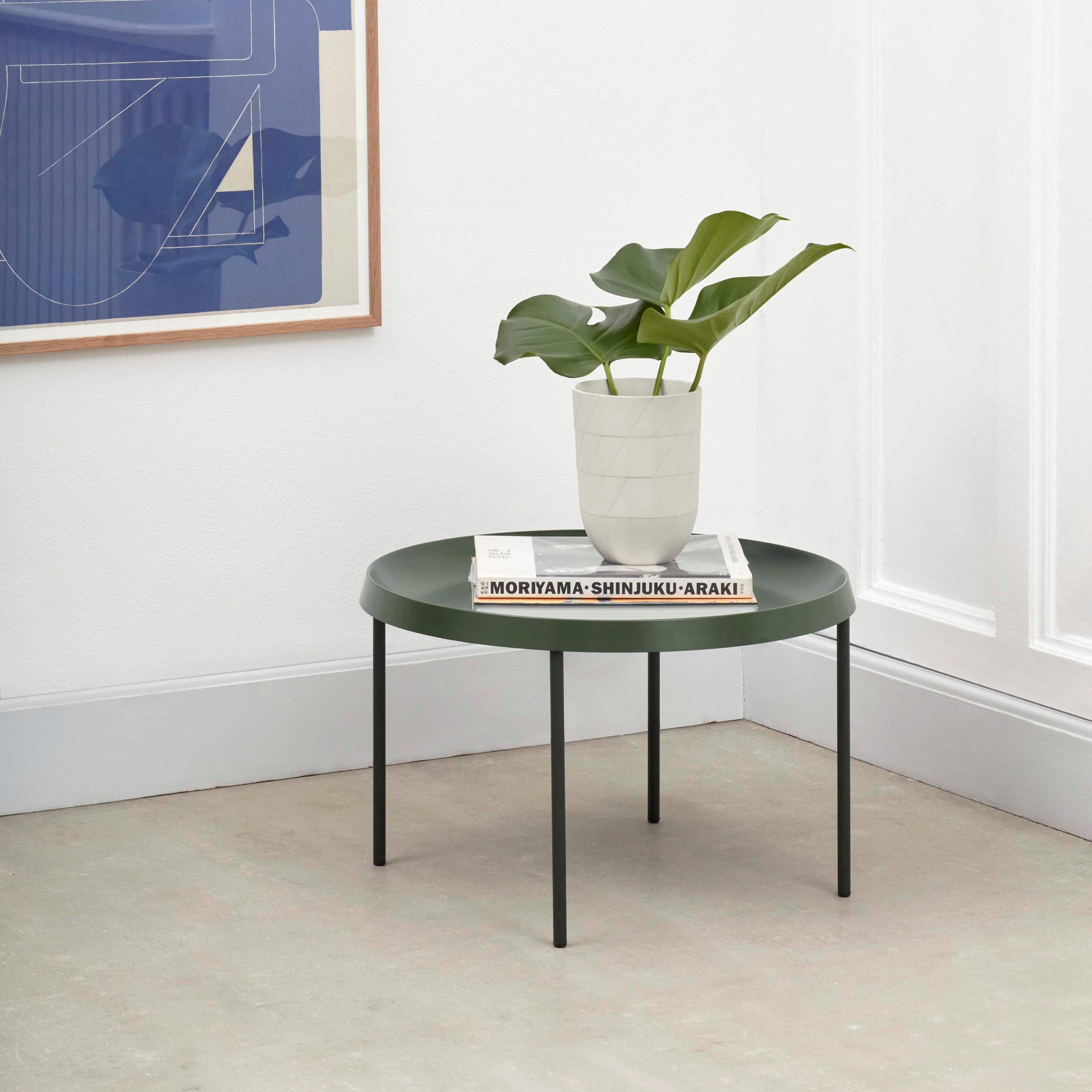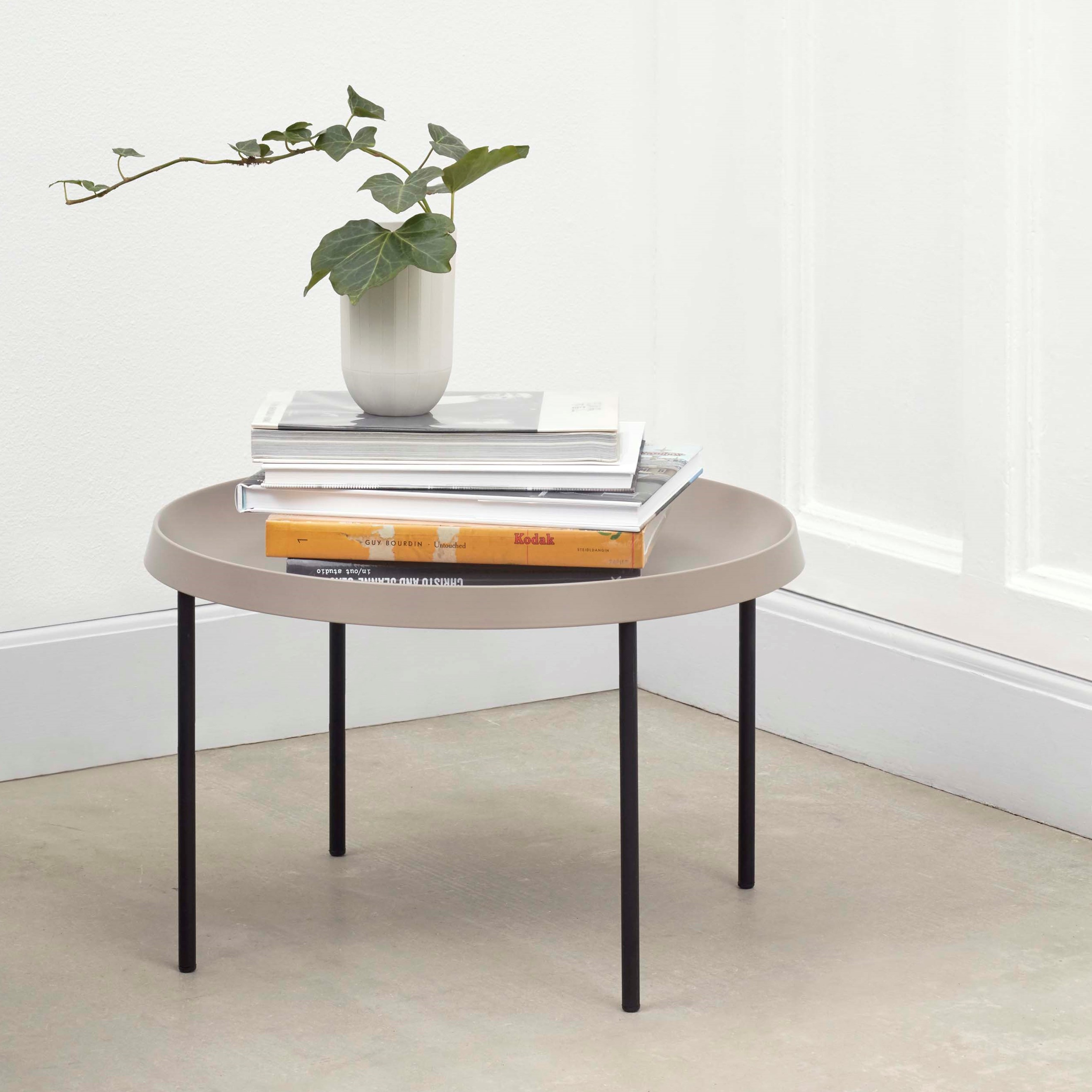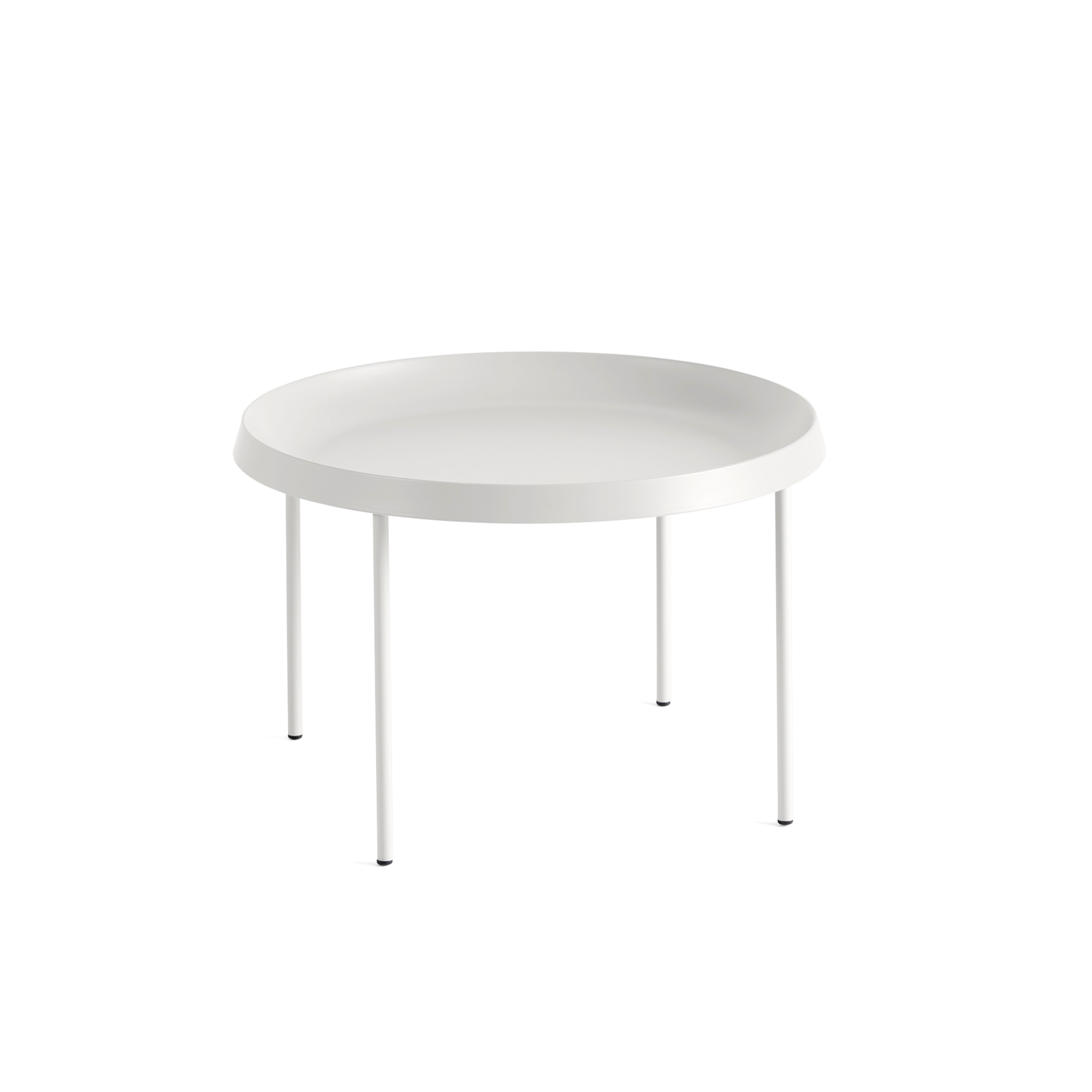丈夫で持ちやすい縁のあるラウンド形の薄いスチール製のトレイと、スチールチューブでできた4本脚フレームというたった2つの基本的な要素で構成されたミニマルなデザインです。