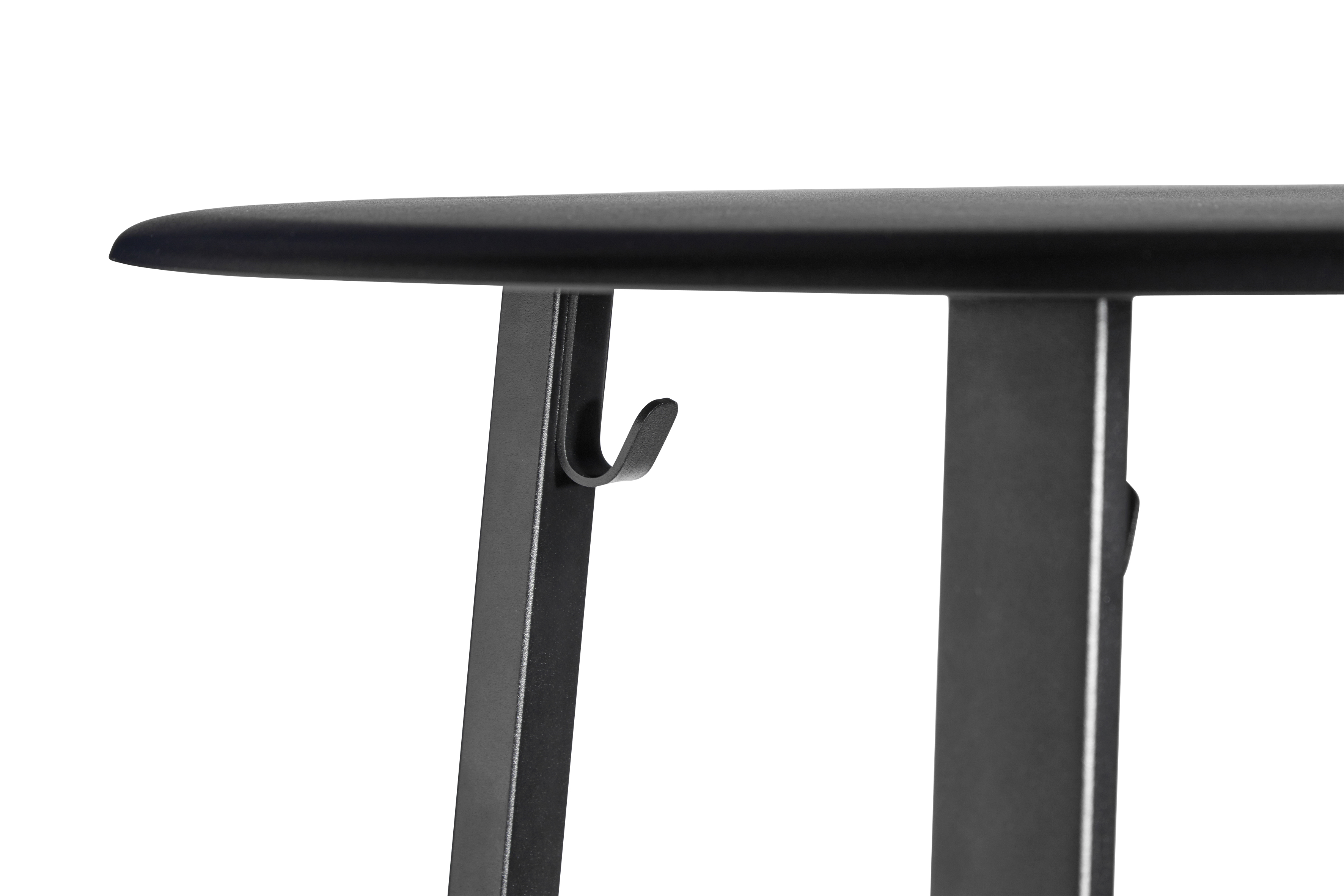 カーブしたアウトラインが印象的なシンメトリーなデザインになっています。また、ラウンド型フットレストが足を置くスペースをサポートし、テーブル脚上部についたフックでコートやバッグを吊るすことができ、機能的にも優れています。