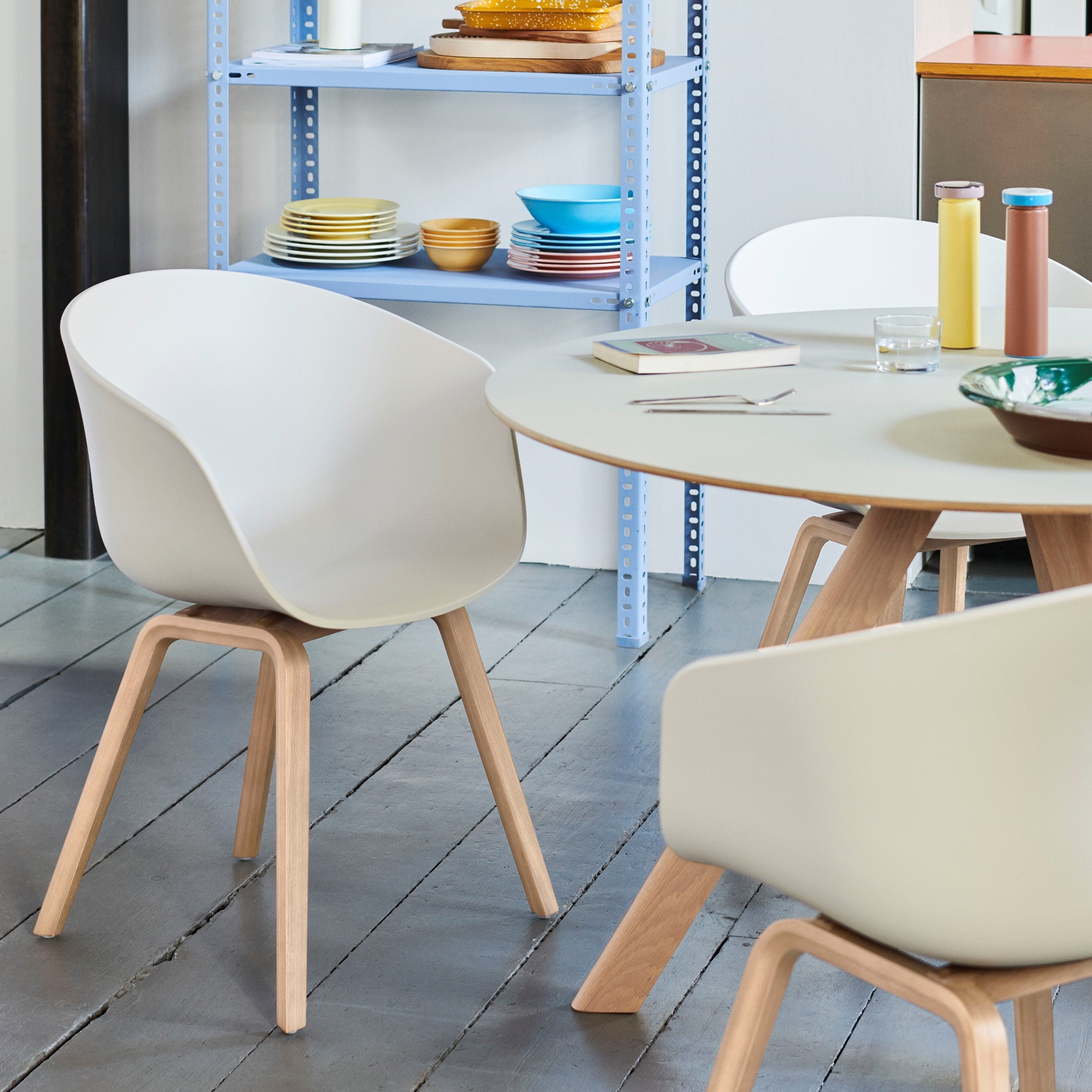 ポリプロピレン製の頑丈なシートは、アームレストと一体型の美しい曲線をもつ背もたれになっており、柔らかな印象と一体感のあるシルエット、非常に快適な座り心地を生み出しています。また、4本脚の木製ベースには、時代にとらわれないクラシックな表情があります。木目や色の濃淡は1点ずつ異なります。天然素材ならではの質感をお楽しみください。毎日使う椅子だからこそ、優れた安定性と長い間お使いいただける品質にもこだわっています。シートは豊富なカラーを揃えているため、お好きなカラーや空間の雰囲気にあわせてお選びください。