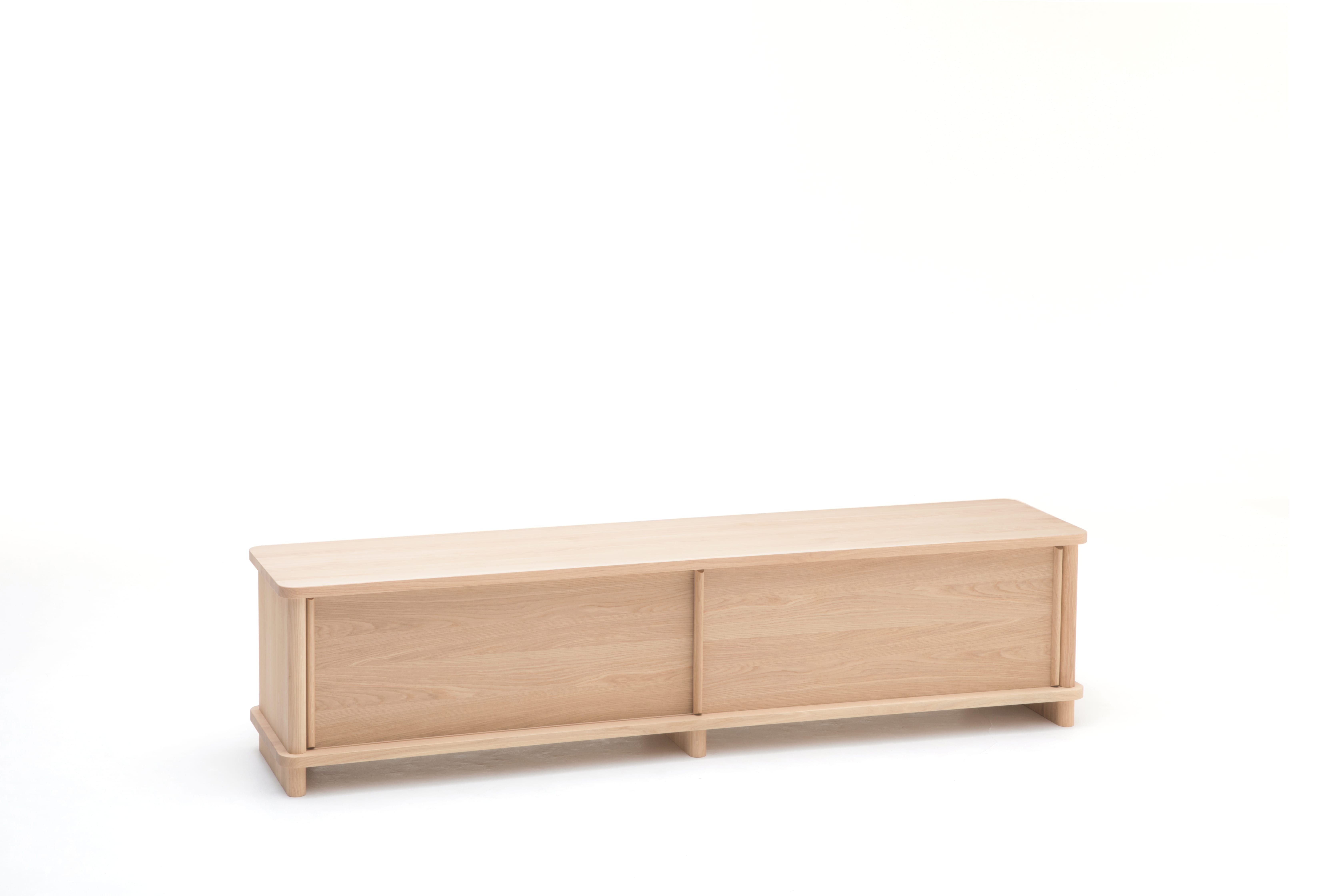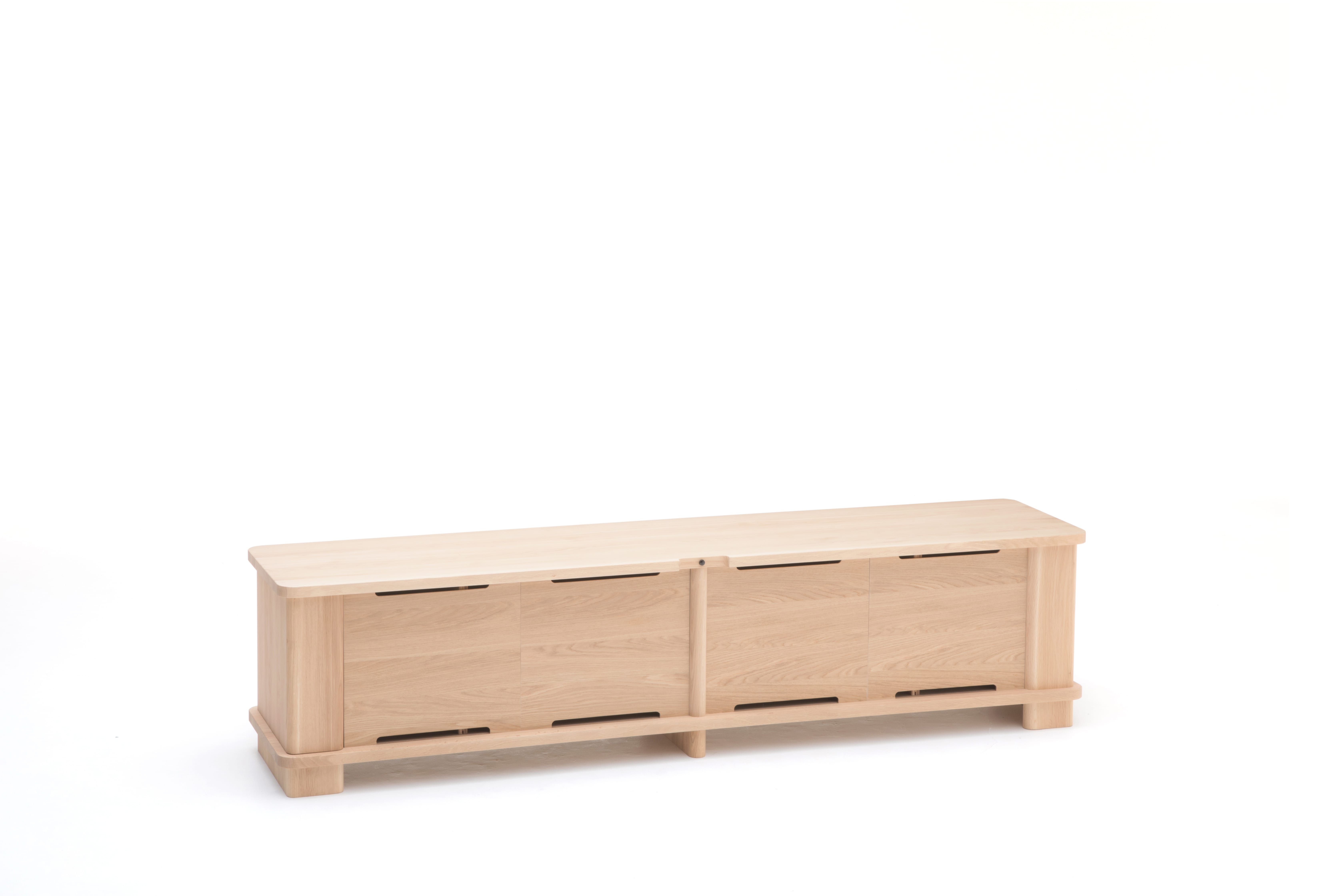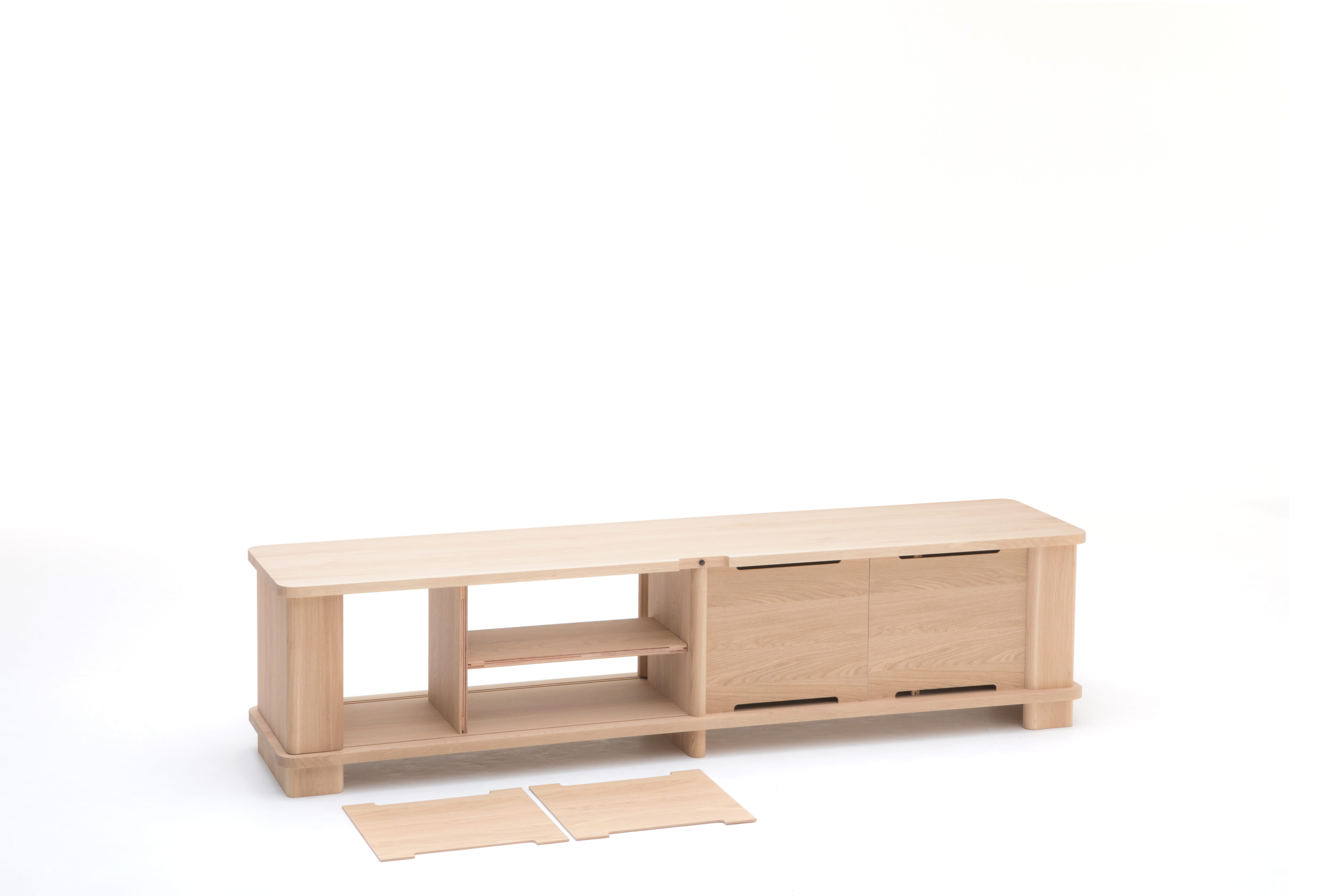 国産ナラ材を用いて作られており、太いL型のサイドモジュールからなるデザインで前面だけからだけではなく、背面からの見え方も美しく、少ないパーツでも安定感を高く保ち、個性的な表情をもたらします。使いやすい取り外しが可能なスライド扉を備え、深く考えられたプロポーションやディテールは、リビングルーム、廊下やオフィスなどでの収納やディスプレイにぴったりです。内部の棚には配線用の開口が設けられており、電子機器の収納にも適しています。