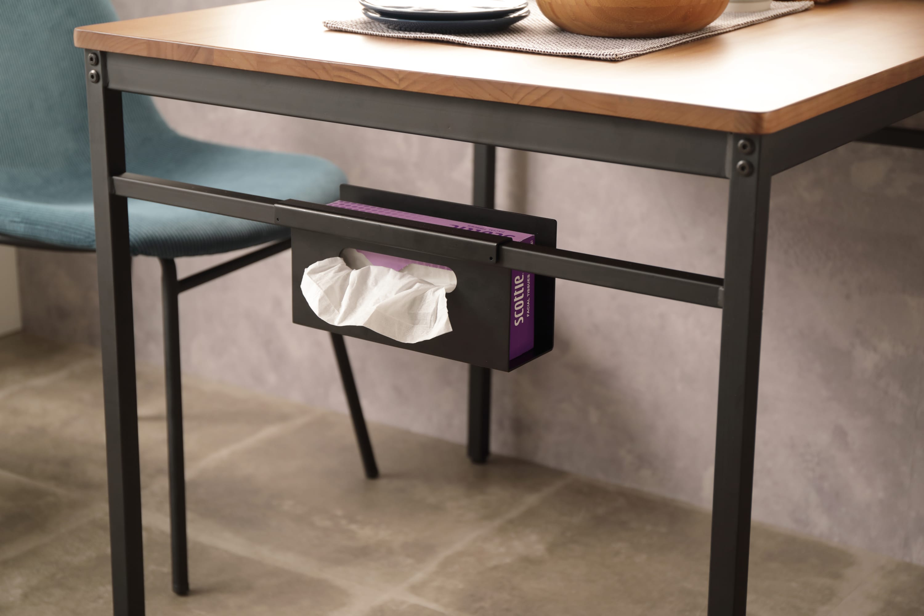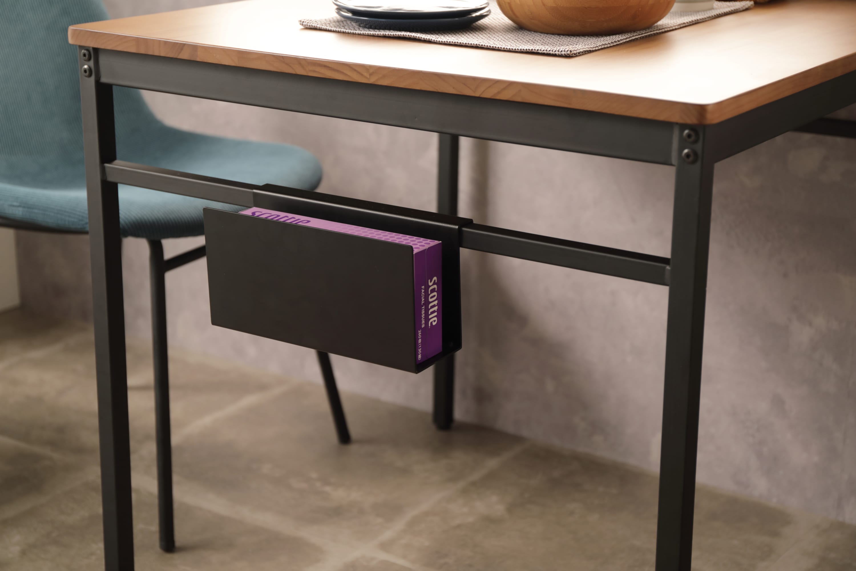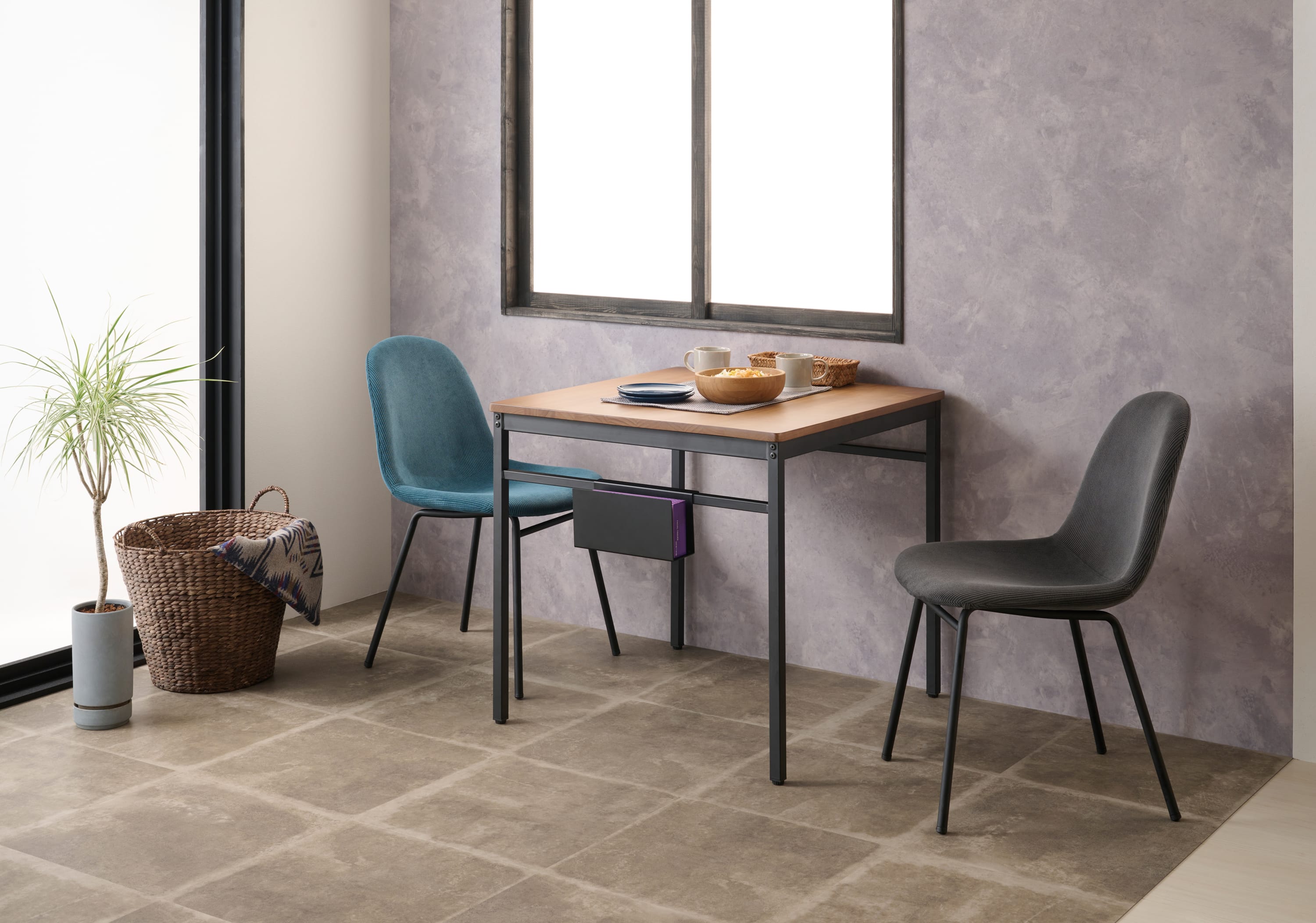 テーブルは生活スタイルに合わせて3型展開。明るめのナチュラルの雰囲気に、引き締まった黒いフレームのインダストリアルデザインの家具は、メリハリが効いたアクセントのある空間になります。