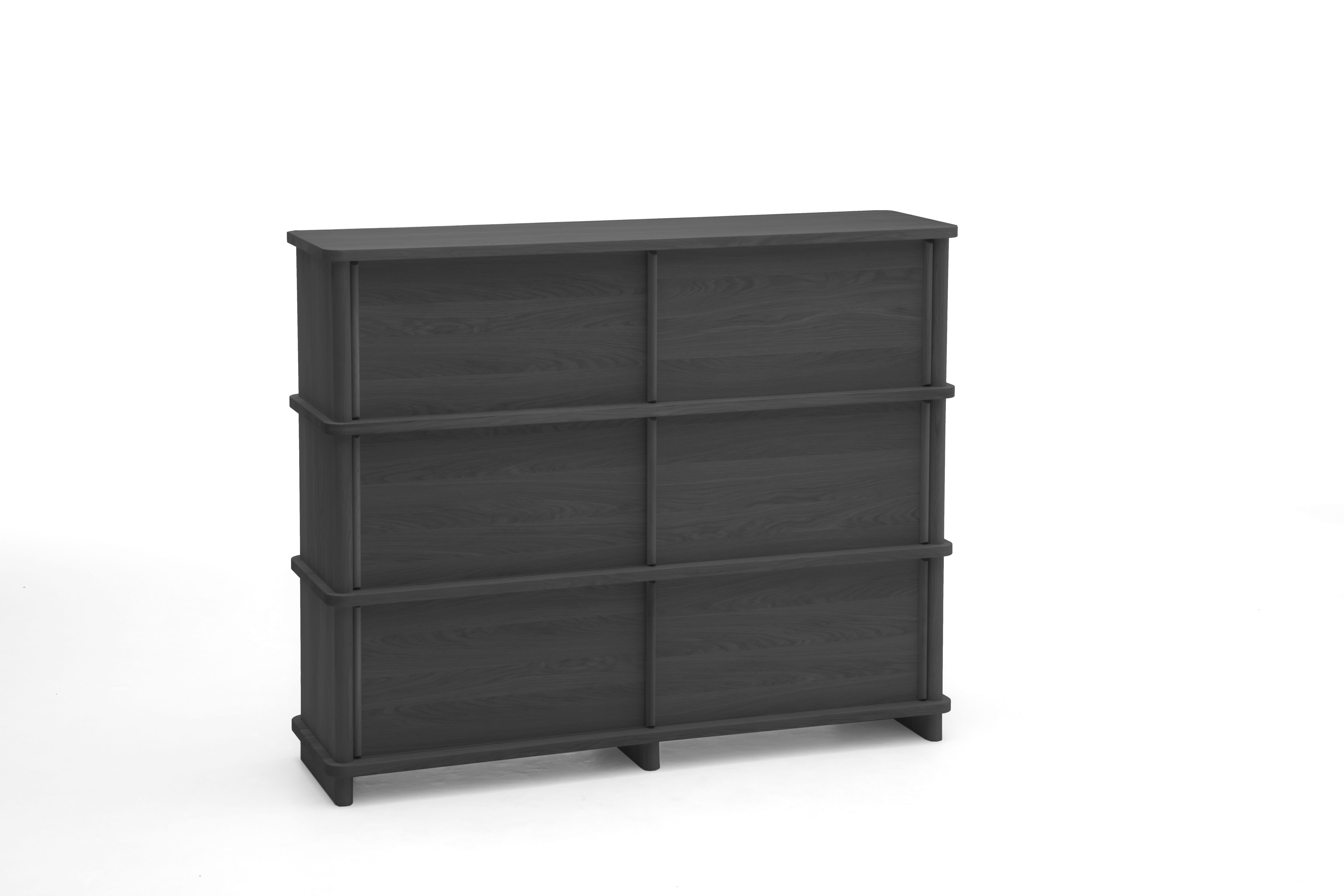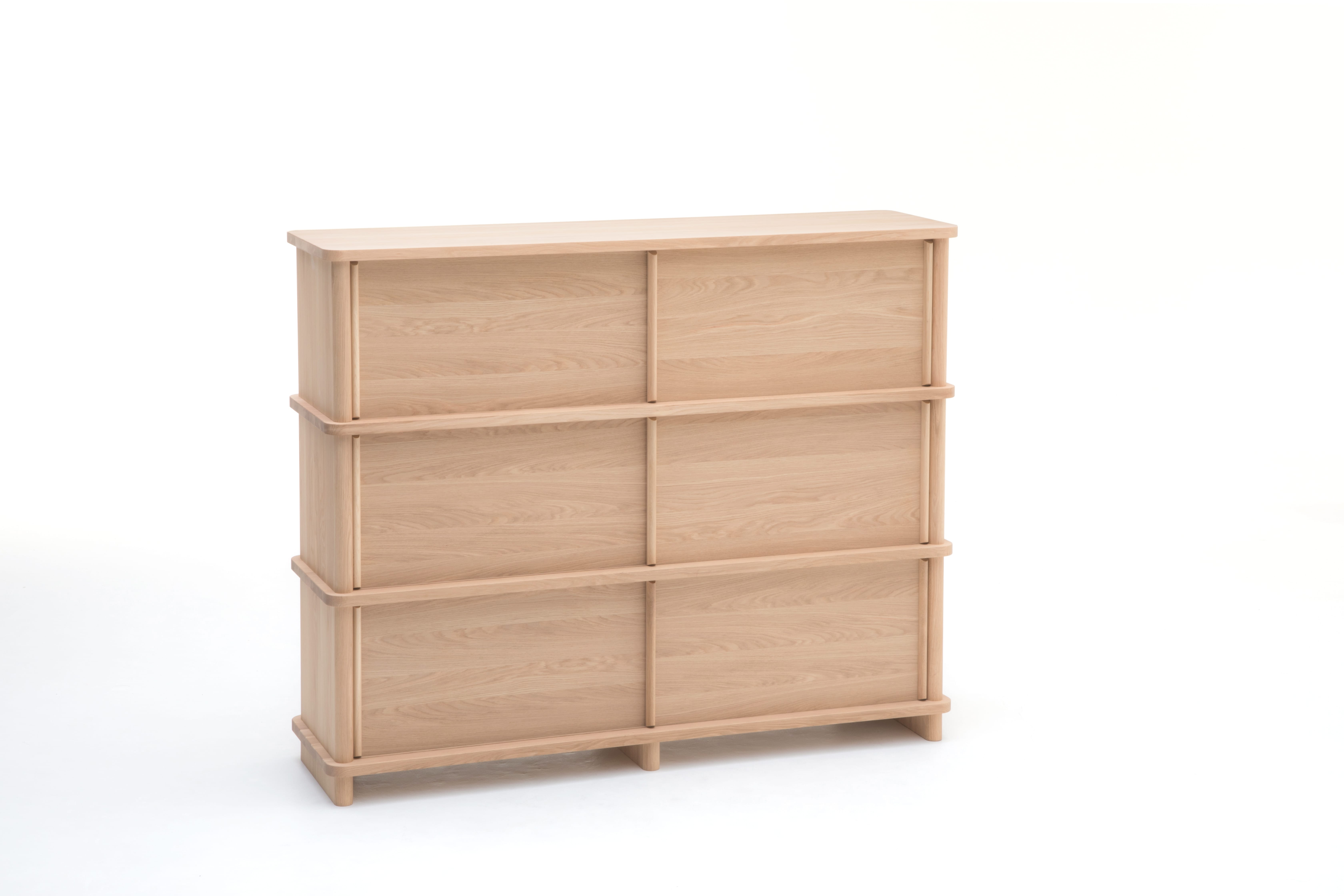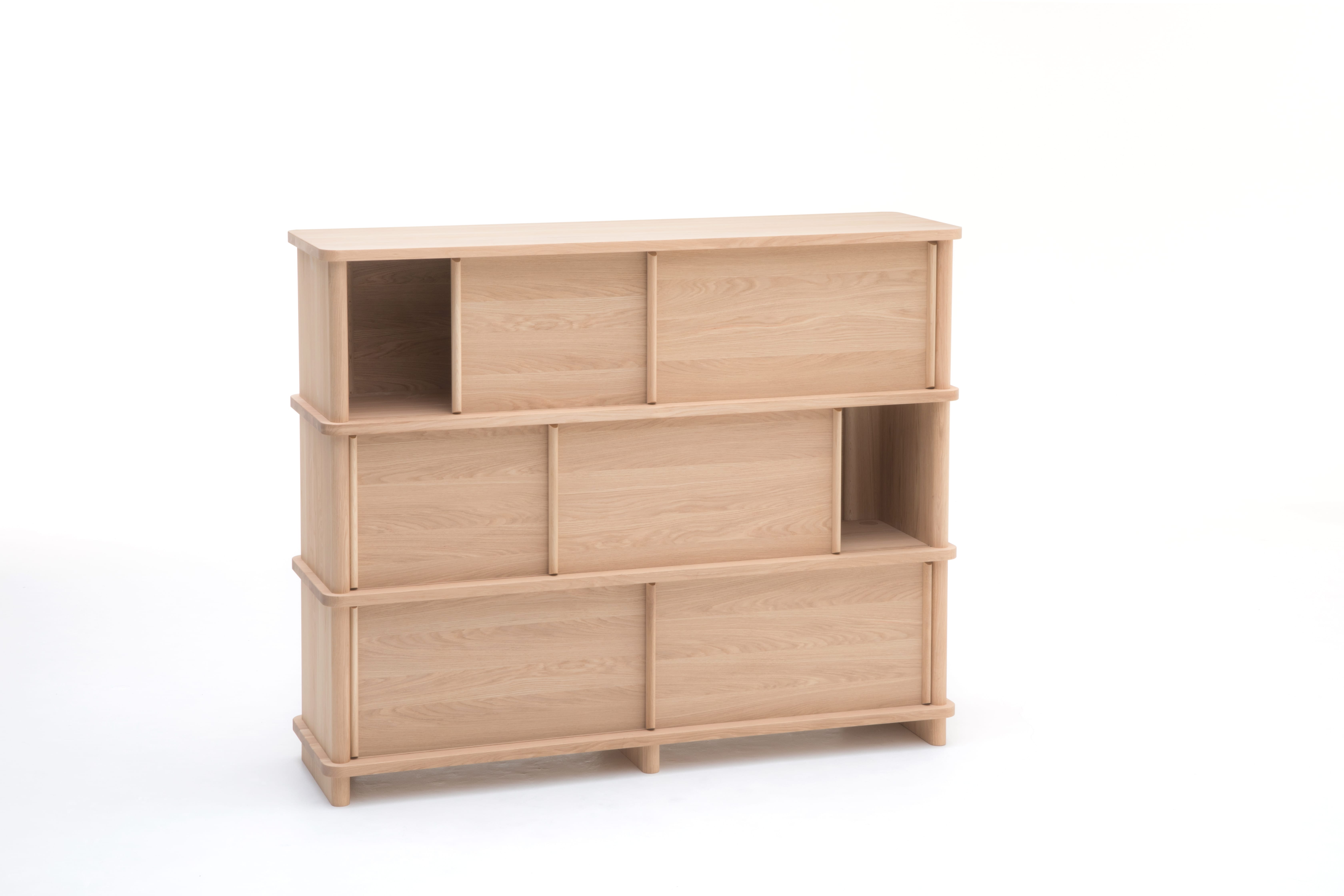国産ナラ材を用いて作られており、太いL型のサイドモジュールからなるデザインで前面だけからだけではなく、背面からの見え方も美しく、少ないパーツでも安定感を高く保ち、個性的な表情をもたらします。使いやすい取り外しが可能なスライド扉を備え、深く考えられたプロポーションやディテールは、リビングルーム、廊下やオフィスなどでの収納やディスプレイにぴったりです。内部の棚には配線用の開口が設けられており、電子機器の収納にも適しています。