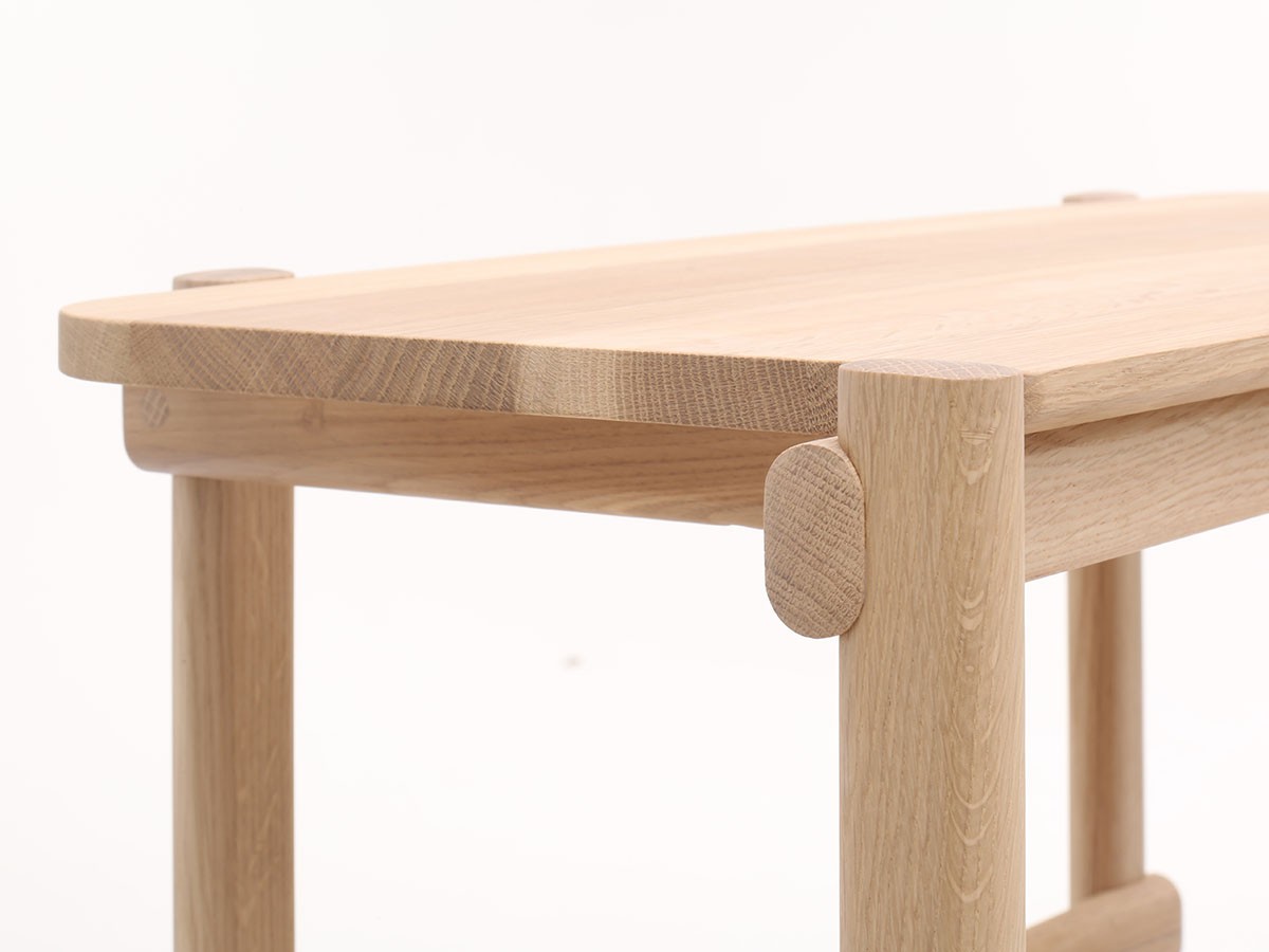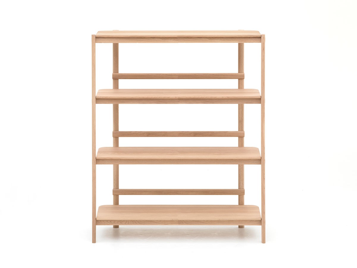 本や雑誌、CD やレコードなどをあまり持たなくなったデジタル時代、アーカイブシェルフは個人が収集したアイテムを長く安全に保管するためのプラットフォームです。2種類のサイズ展開で、私たちが日々の生活で使用し、眺めて思い出したいものを収納、ディスプレイするための家具です。カリモクの熟練の職人の手によって、国産のナラ材で作った細い部材と棚板で組み立てられています。美しく仕上げられたディテール、上品な接合部、柔らかな曲線でアーカイブシェルフは、どの部屋に置いても中心的な存在になるはずです。