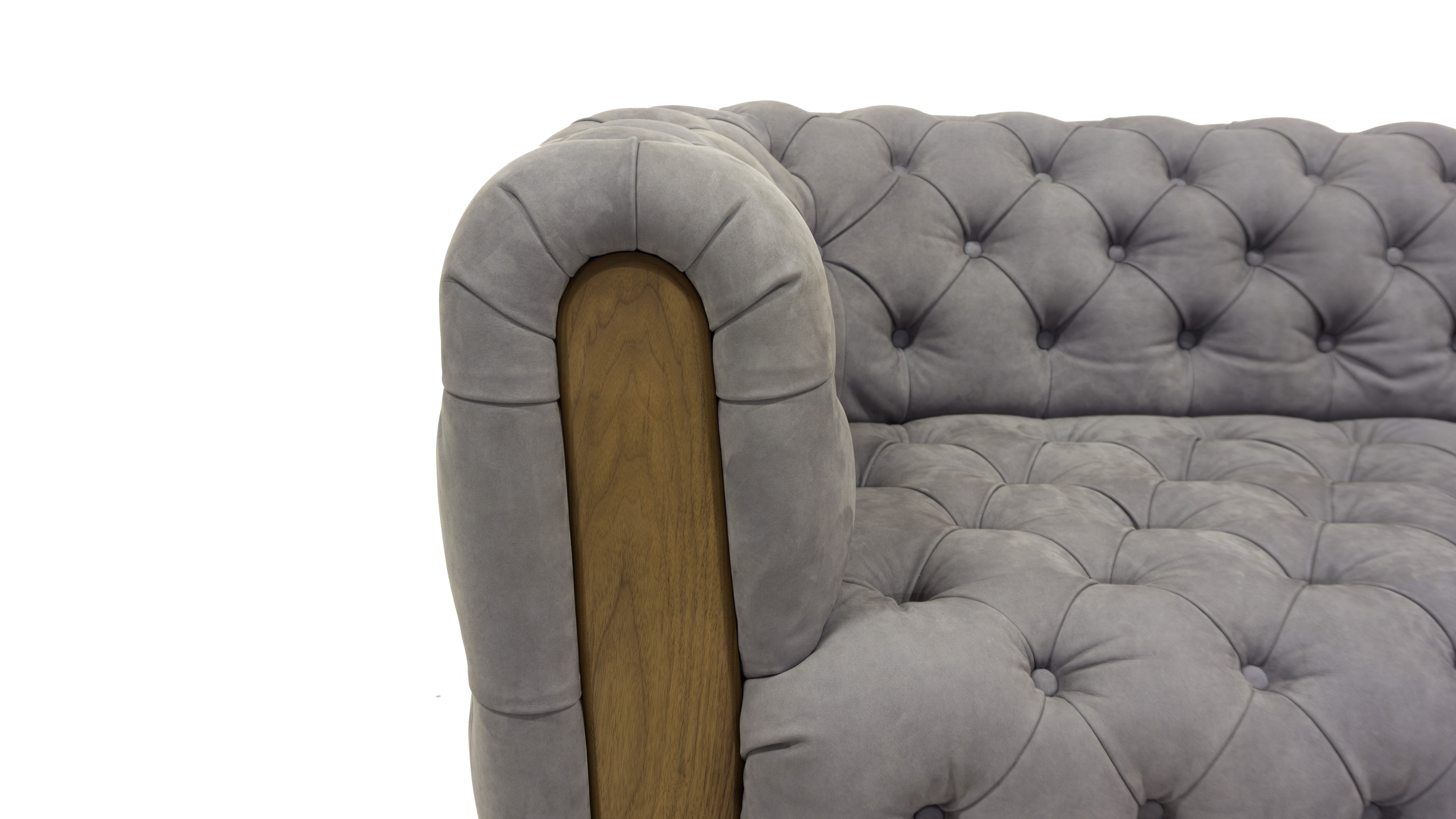 総革張り・ボタン留めの表情は、100年後のアンティーク家具を体現した風格を感じさせます。