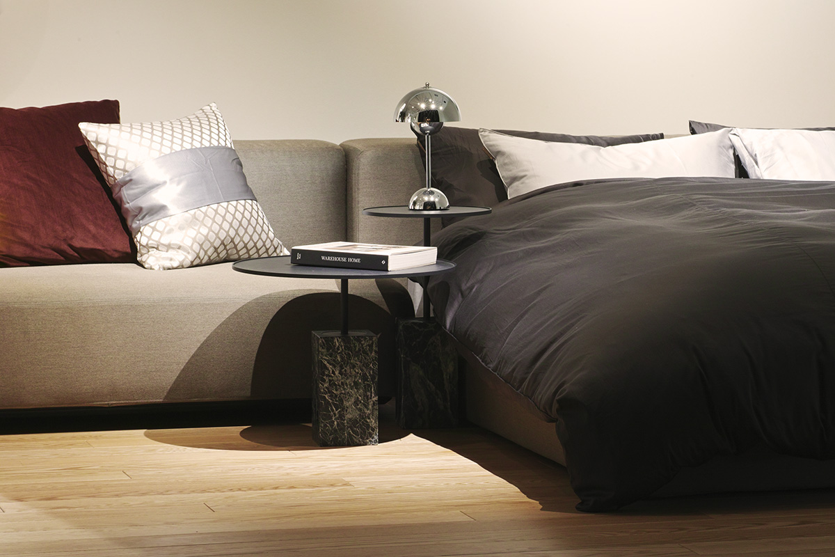 レザーや金属と大理石を使用した新しい素材感のサイドテーブル。