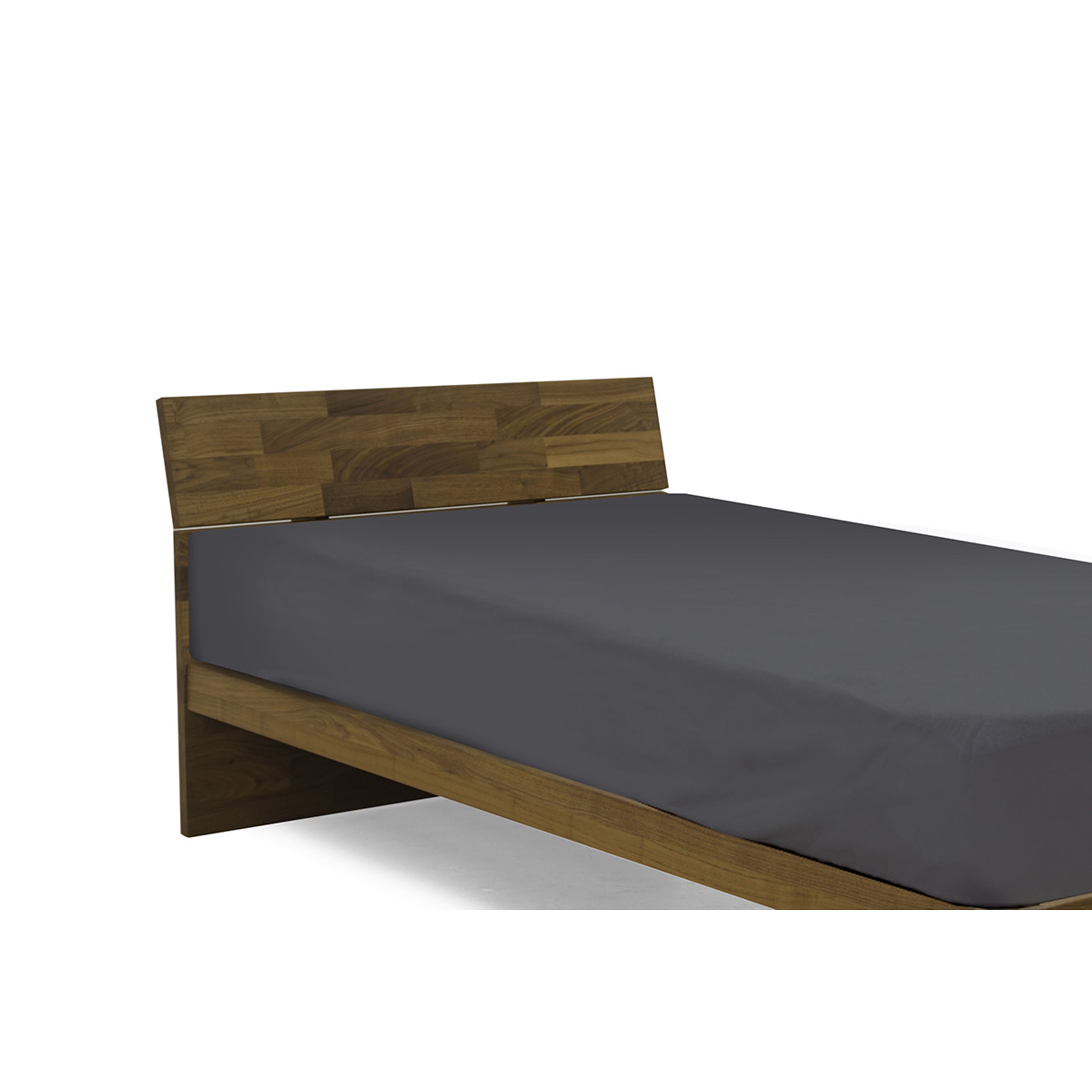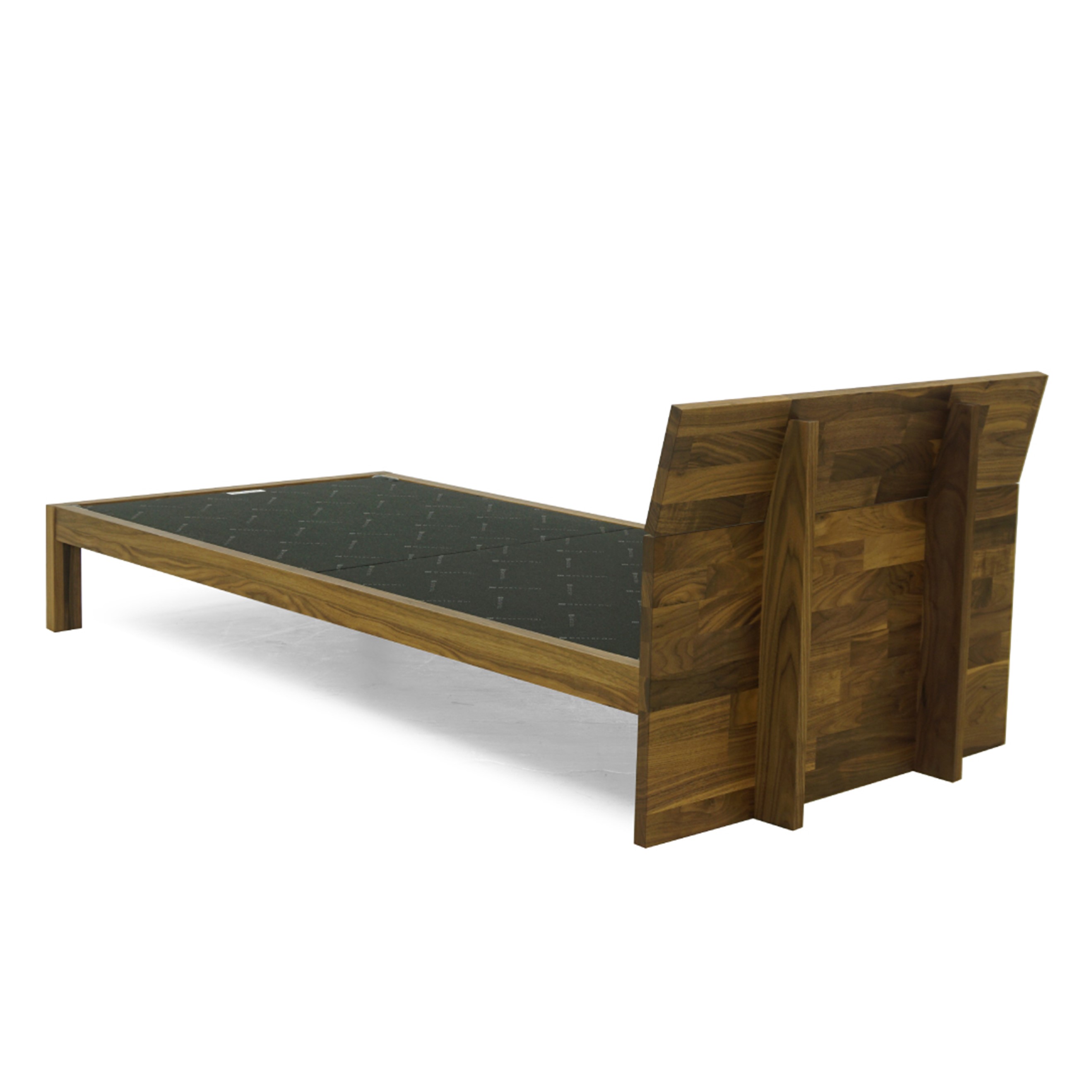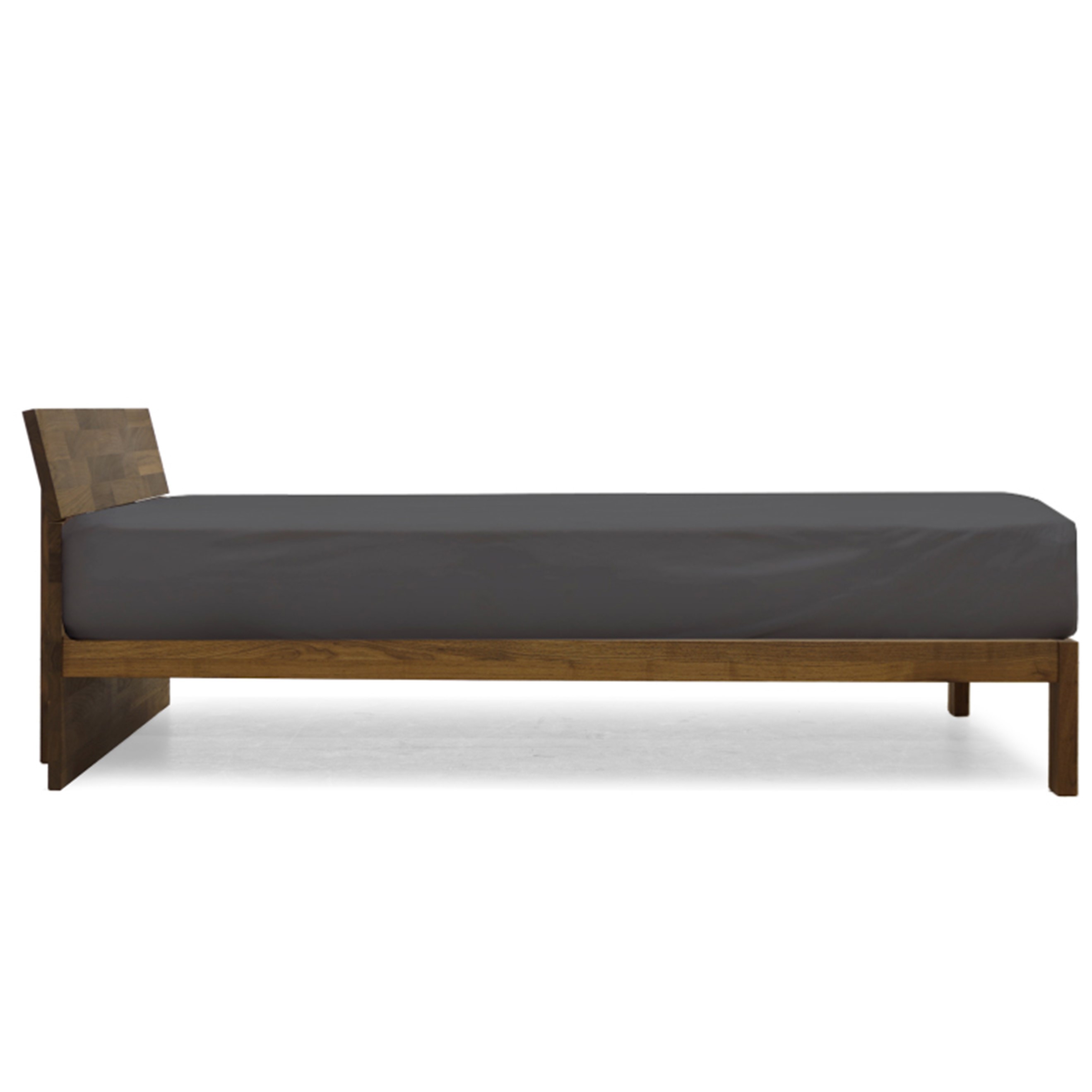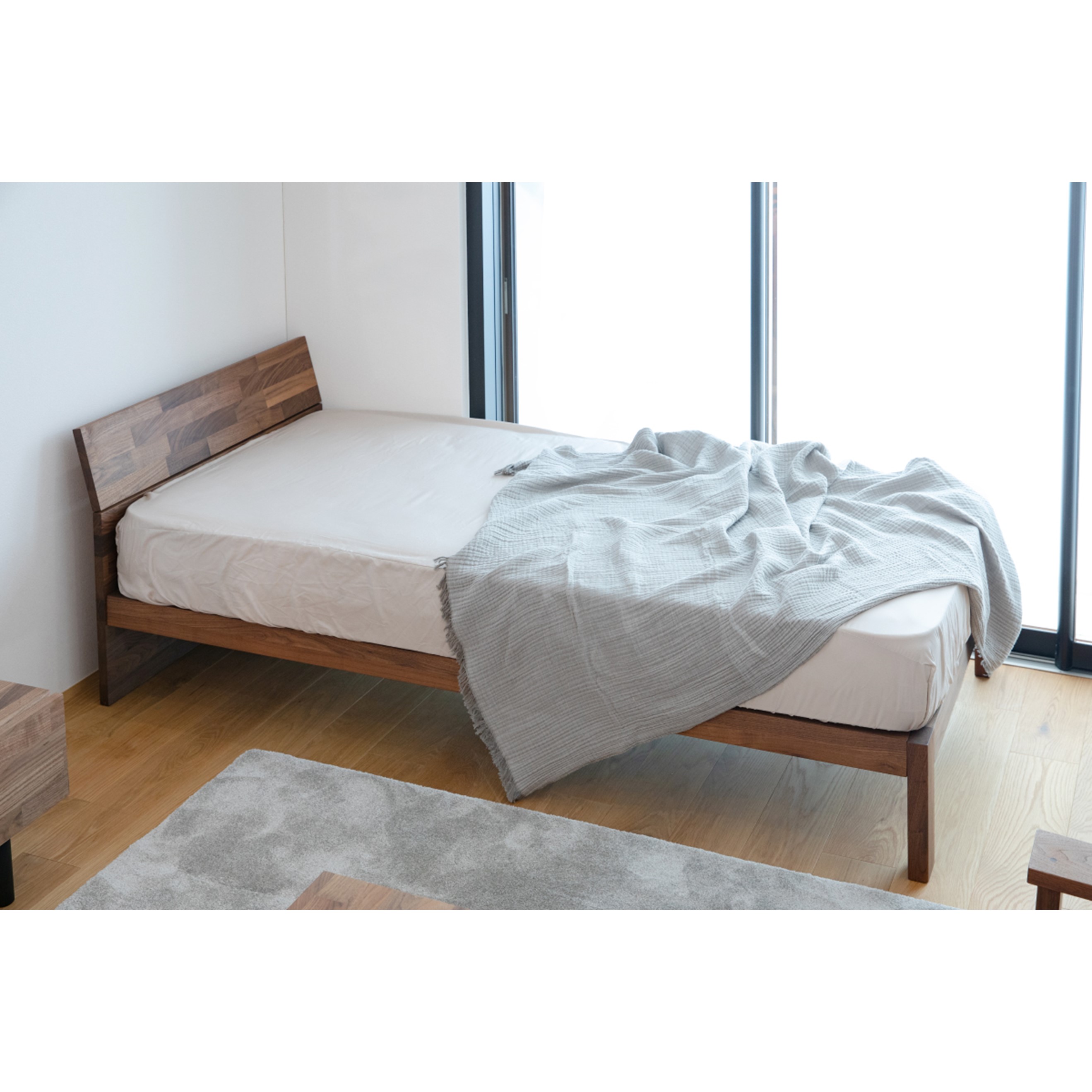 ウォールナット集成材を使用し、ランダムな木目を楽しめるヘッドボードのベッド。