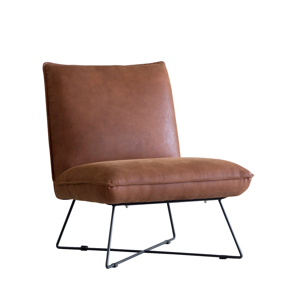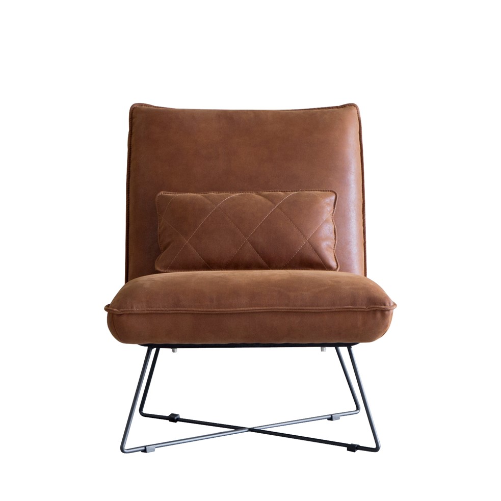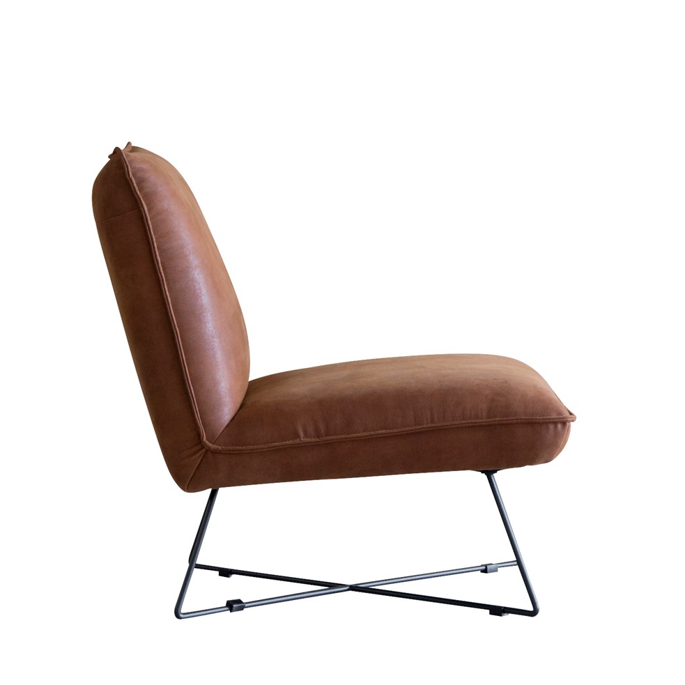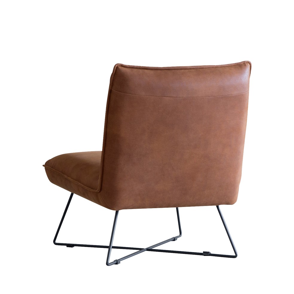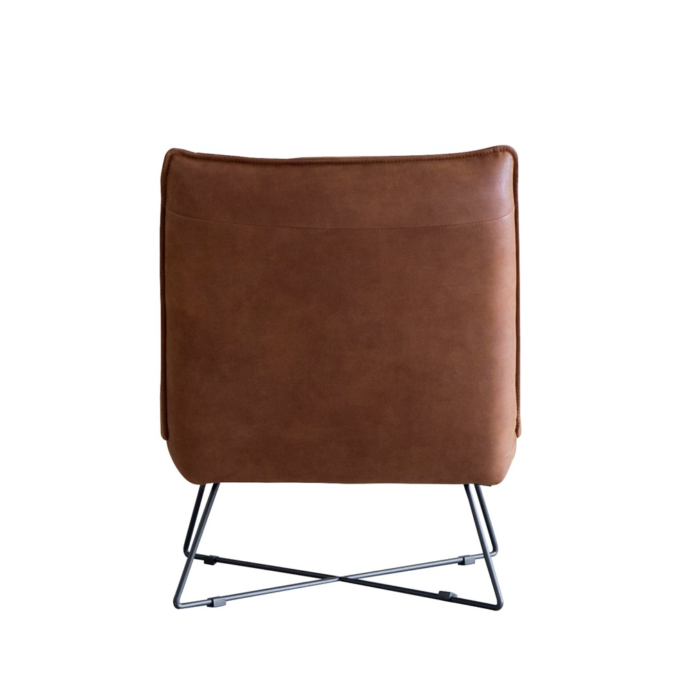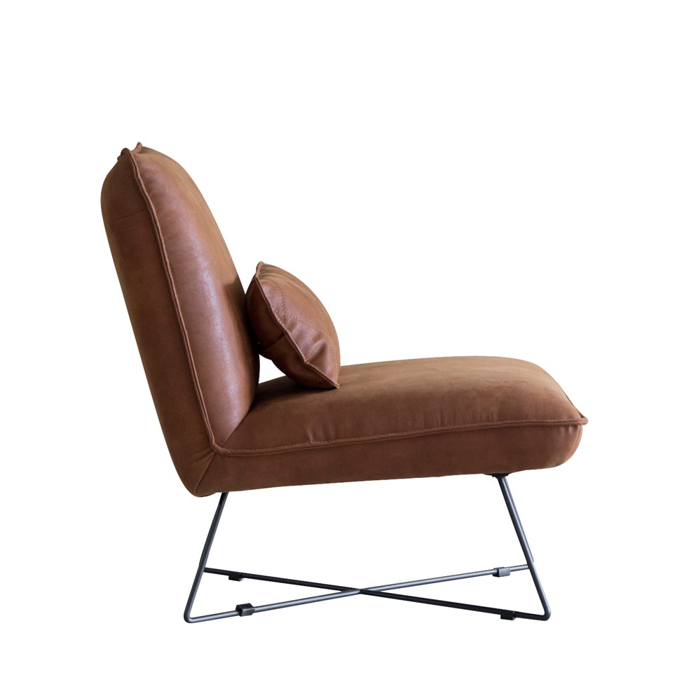 本革風張地の重厚な雰囲気と、スチール脚の抜け感が絶妙バランスの1人掛けソファ