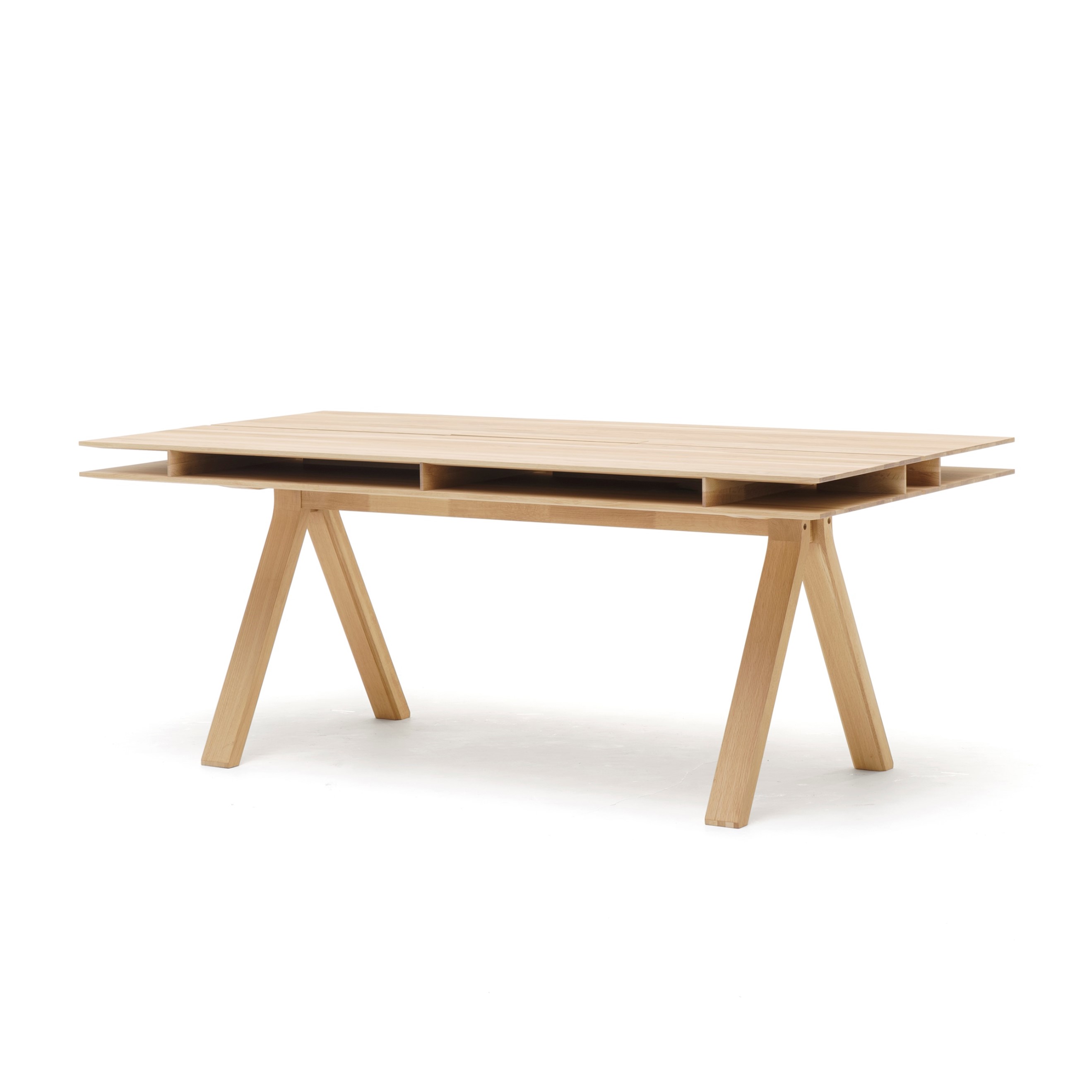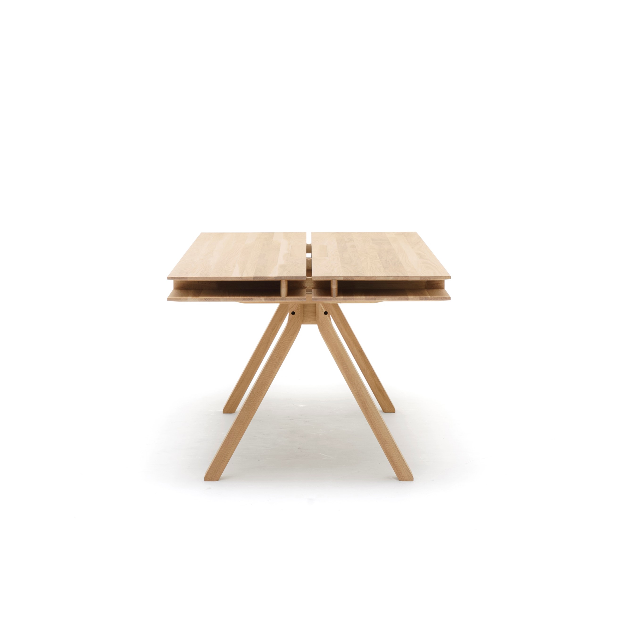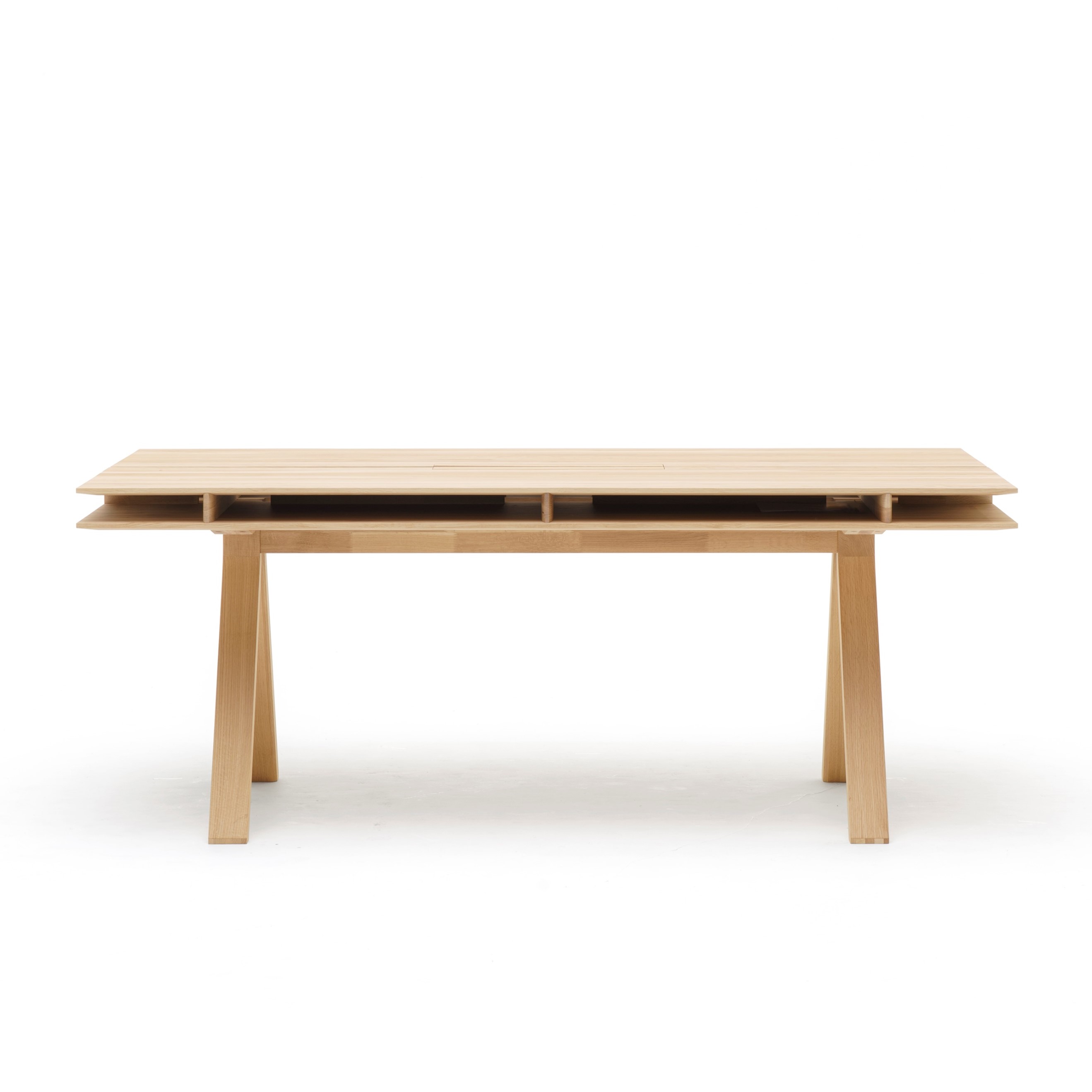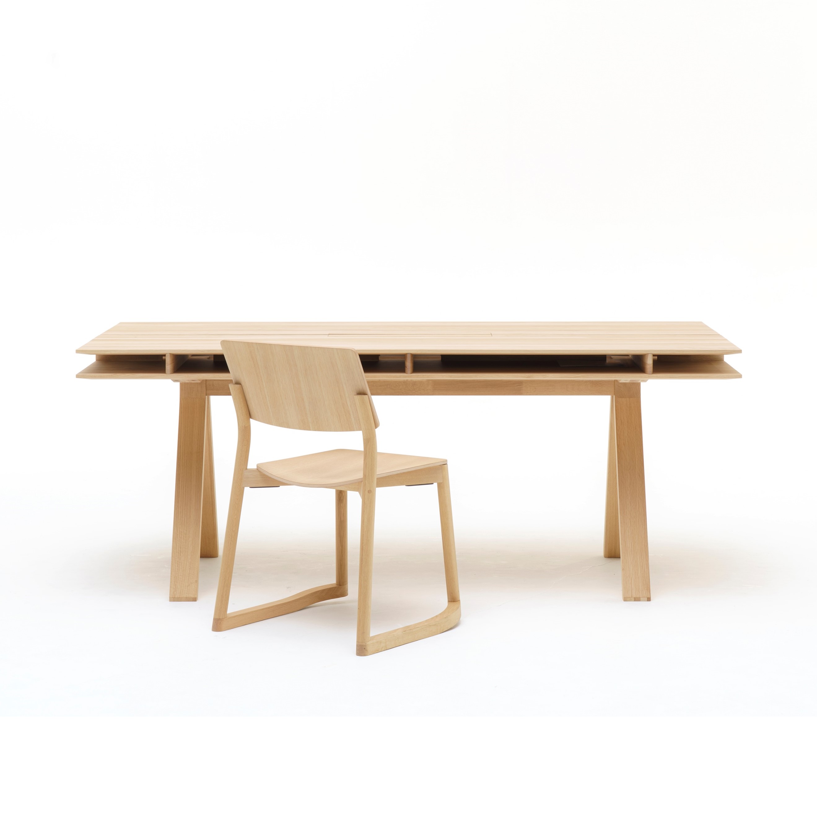 ミーティングテーブルのSpectrum Workstation DT は、特徴的なダブルトップ構造を採用し、天板の側面に備えられている収納スペースによりテーブル上が散らかってしまうことを防ぎます。アクセスしやすい大きな開口部を設けたシンプルでスマートな配線システムにより、電子機器を手軽に設置することができます。Spectrum Workstation DT は、国産のナラ材を使用し、2 サイズ、ブラックとナチュラルの2色で展開されています。同システムのデスク、ハイテーブル、丸テーブルなどの発売を順次予定しています。