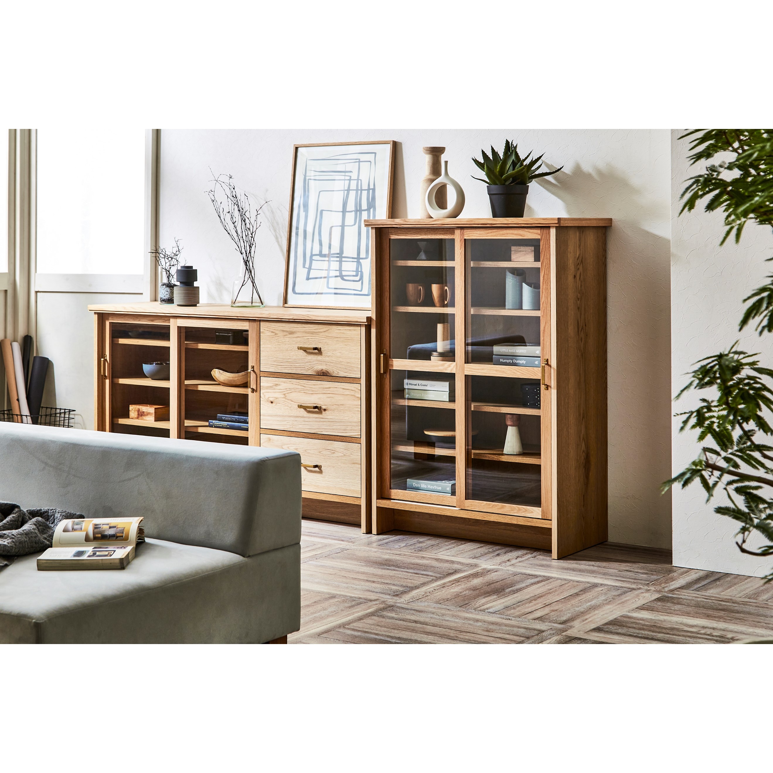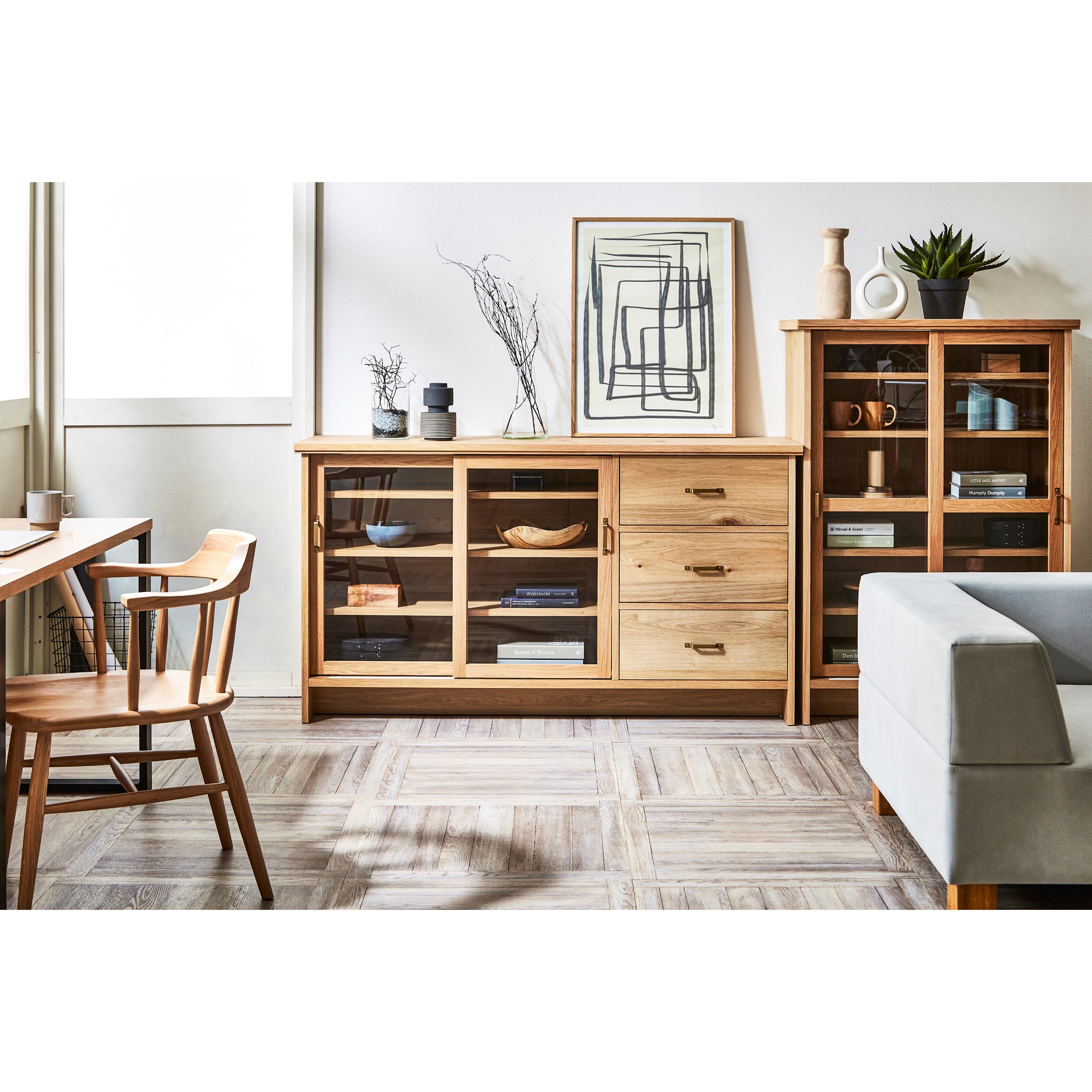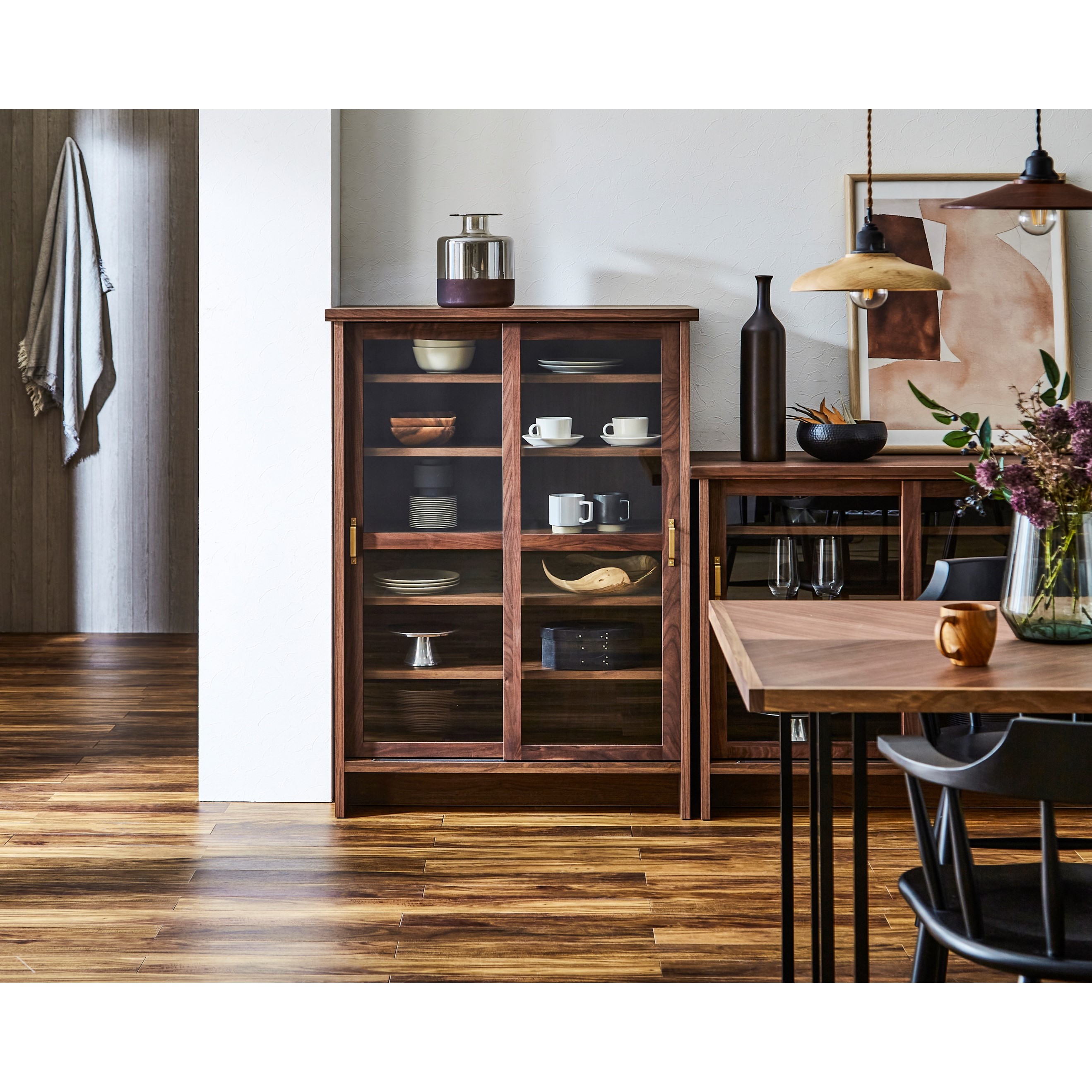 キャビネットは、ダイニングでは食器を飾るように収納でき、リビングではコレクションボードのような使い方が可能です。