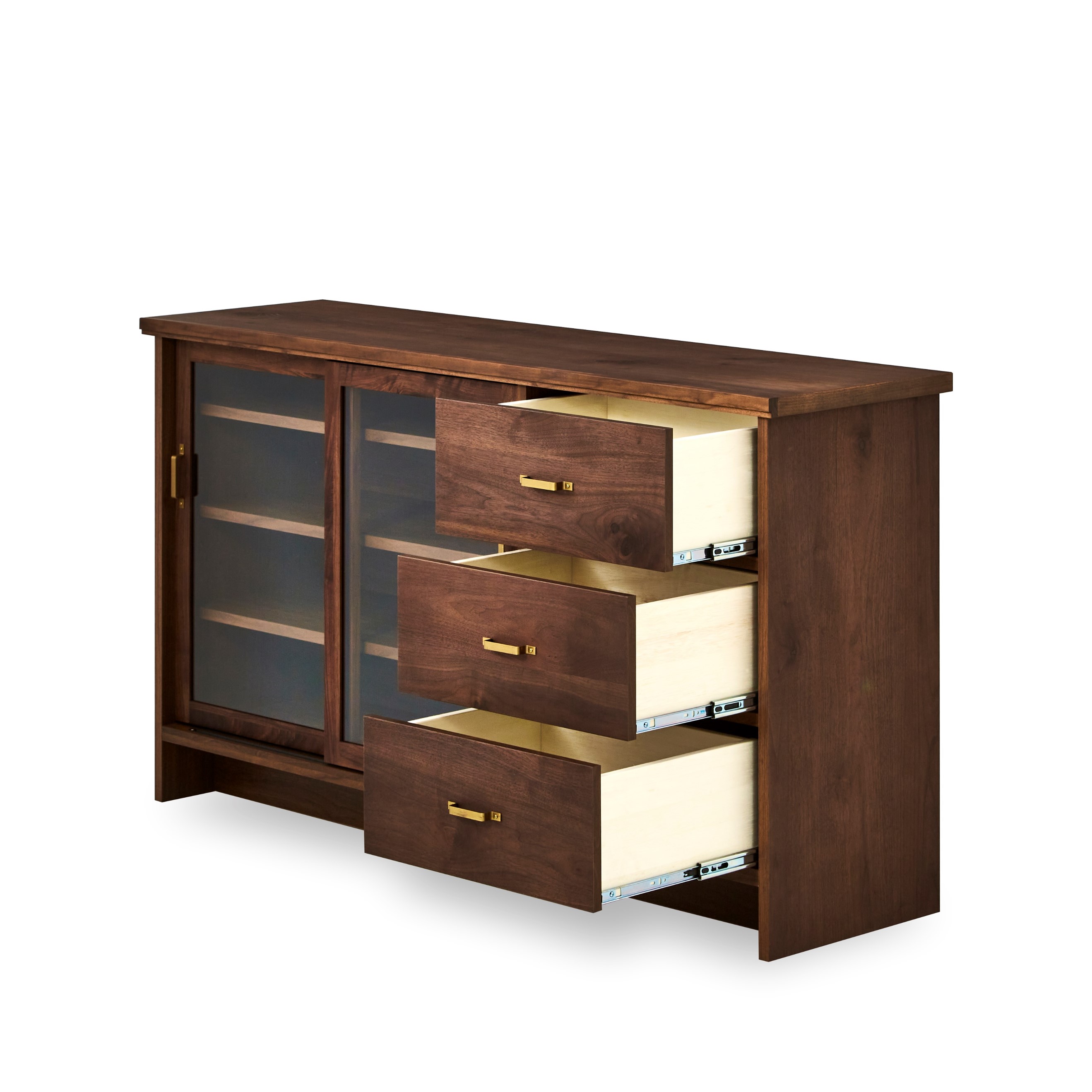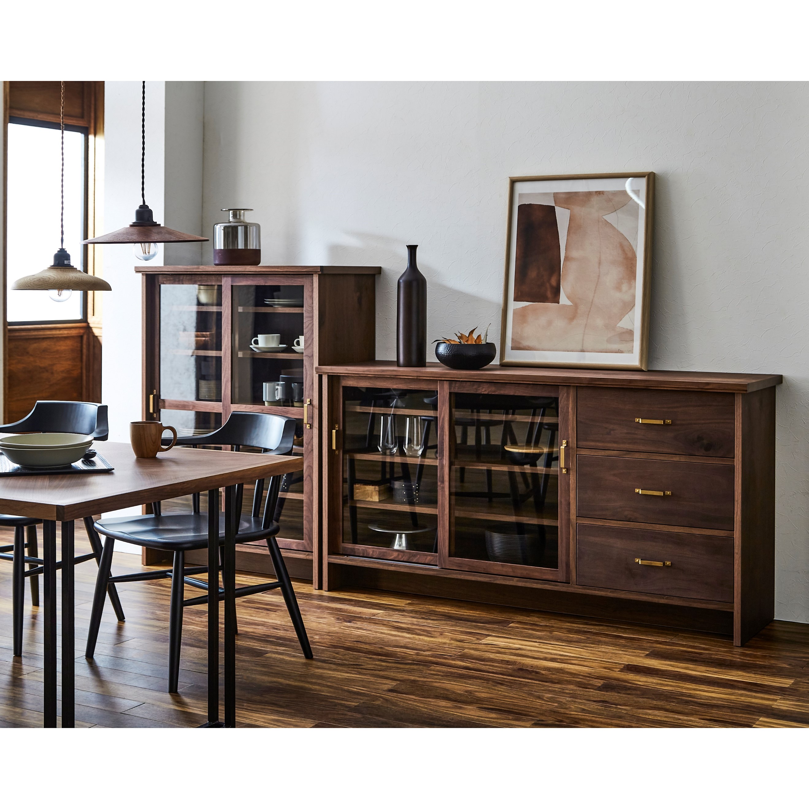 キャビネットは、ダイニングでは食器を飾るように収納でき、リビングではコレクションボードのような使い方が可能です。