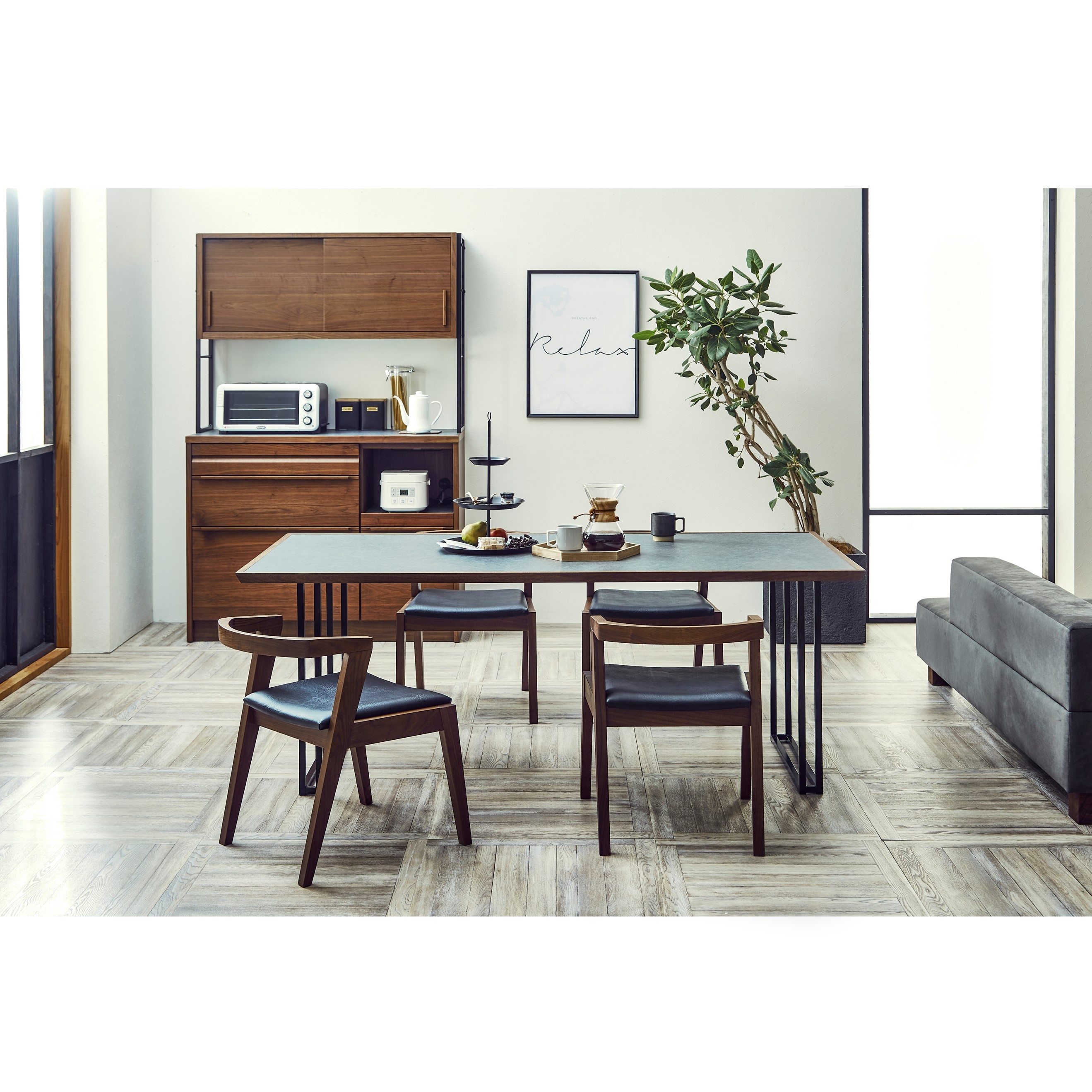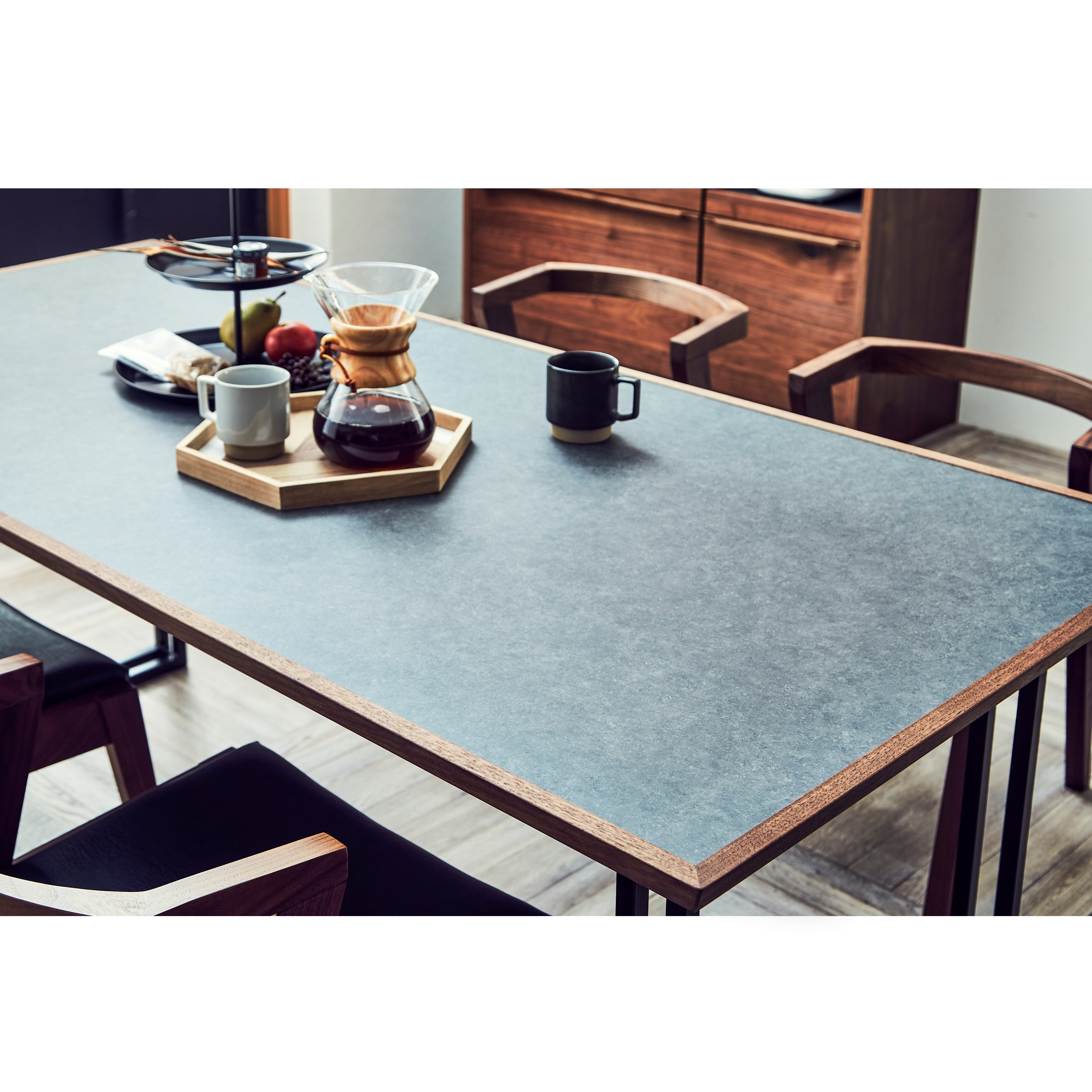| 素材 | 〈木部〉ウォールナット無垢 〈天板〉メラミン化粧板 日本製のメラミン。高い機能性はもちろんのこと、装飾性も評価されています。 ブラック…コントラストが強く、モダンな仕上がりです。 グレー…コンクリートのような質感を表現した仕上がりです。 |