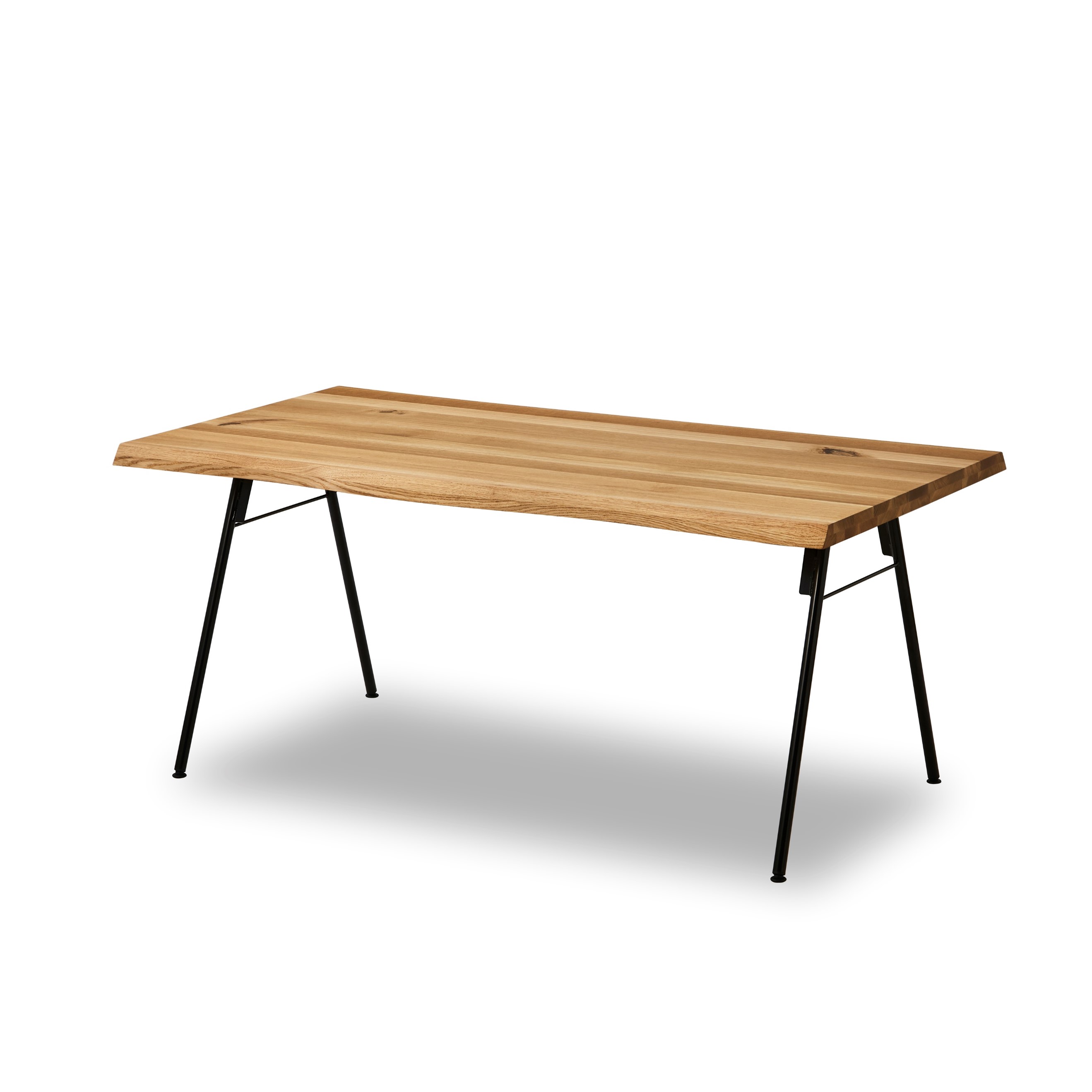| 素材 | 〈WN〉ウォールナット節有無垢 〈OAK〉ホワイトオーク節有無垢 ホワイトオーク材は、節有材を用いることで、コントラストが強くでています。柾目材を用いていますので、オーク特有の虎斑を有している箇所もあります。 ウォールナット材は、節有板目材を用いていますので、質感がより強くでています。荒々しい木目は、厚みのある天板と耳の加工にマッチします。 |