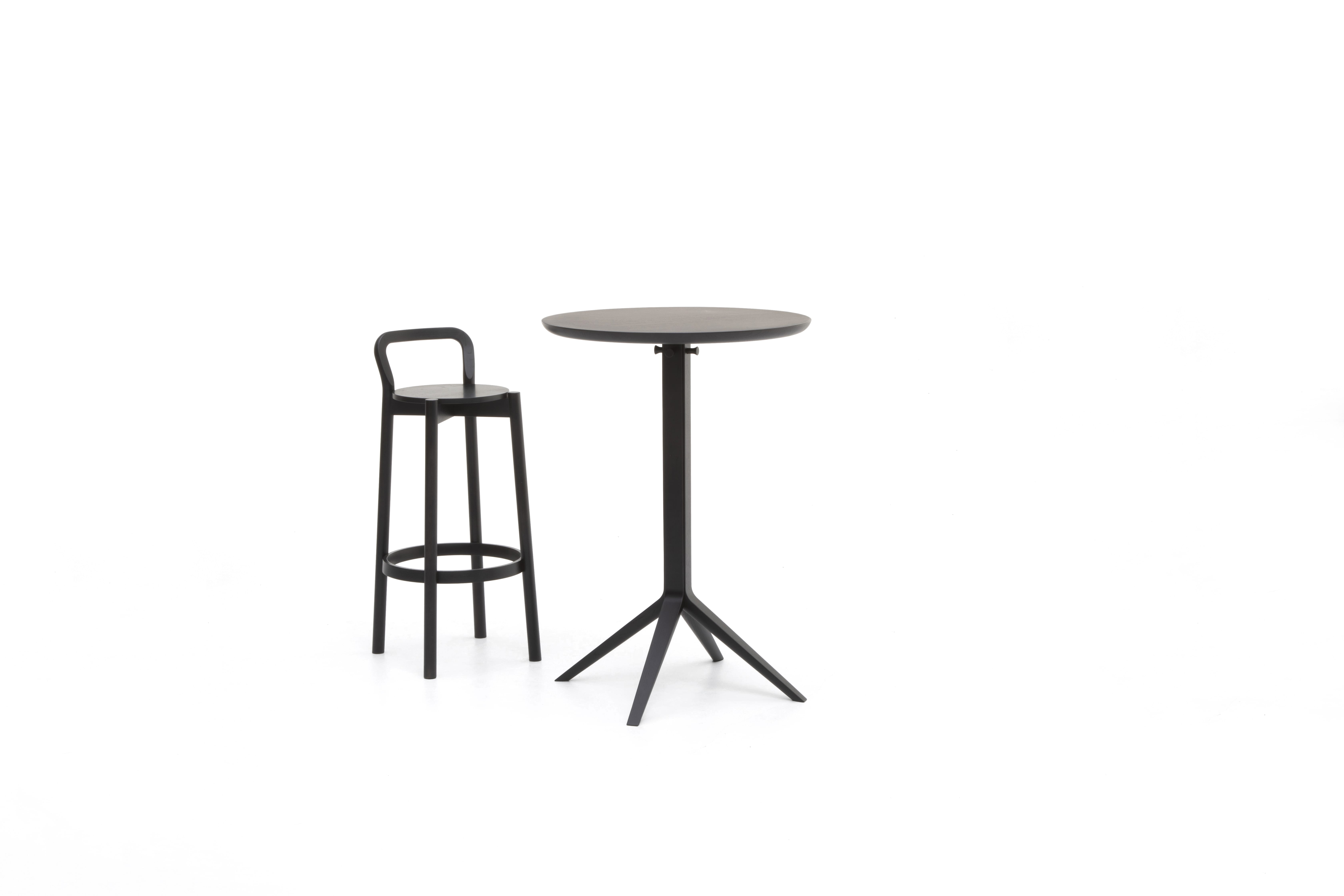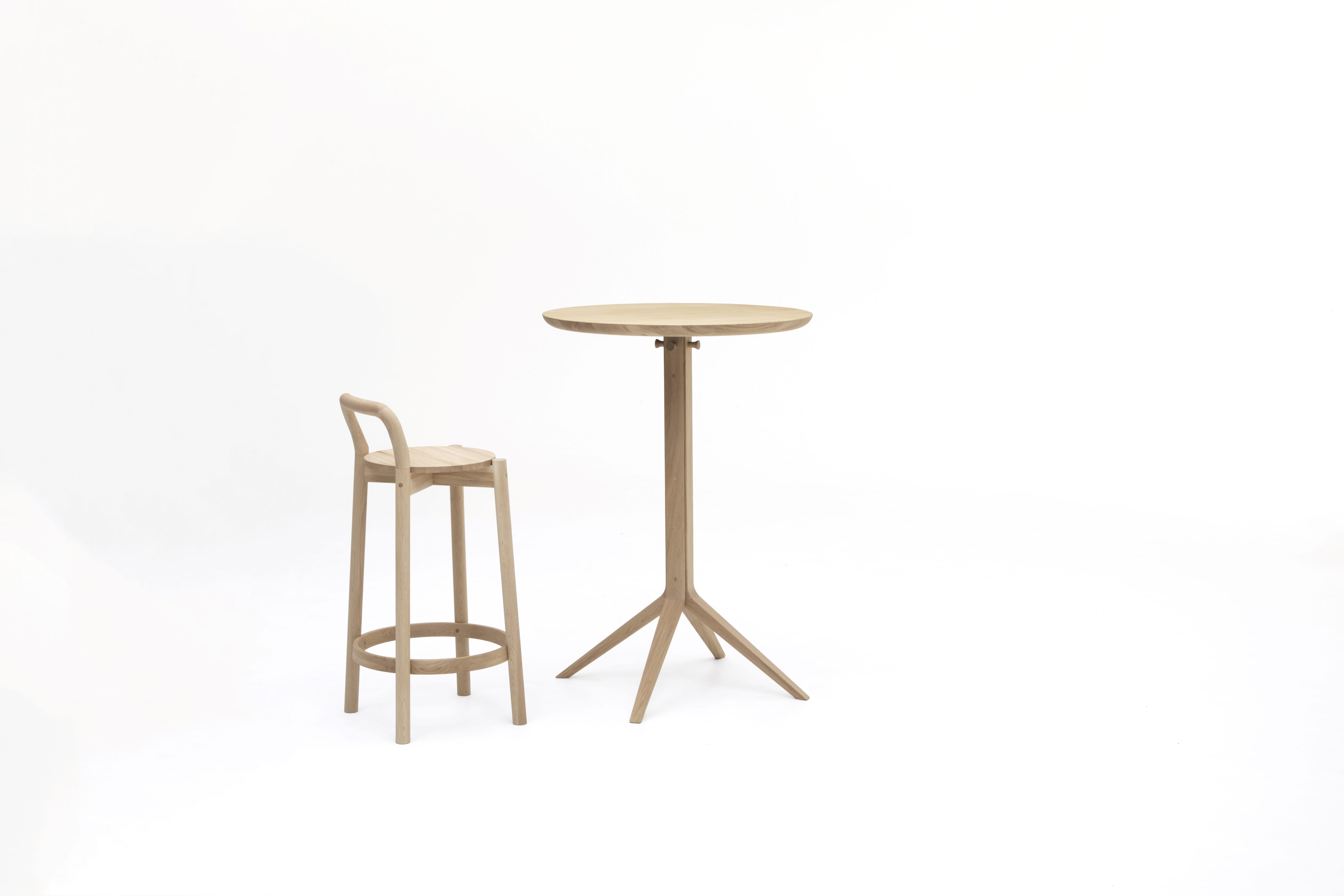国産ナラ材を使用しており、天板と脚部は、スチールパーツで固定されています。バー、ダイニング、ローの3種類の高さと2種類のカラー展開です。コンパクトなサイズで、カフェやレストラン、オフィスのミーティングスペース、家の小さなリビングスペースなどにぴったりです。