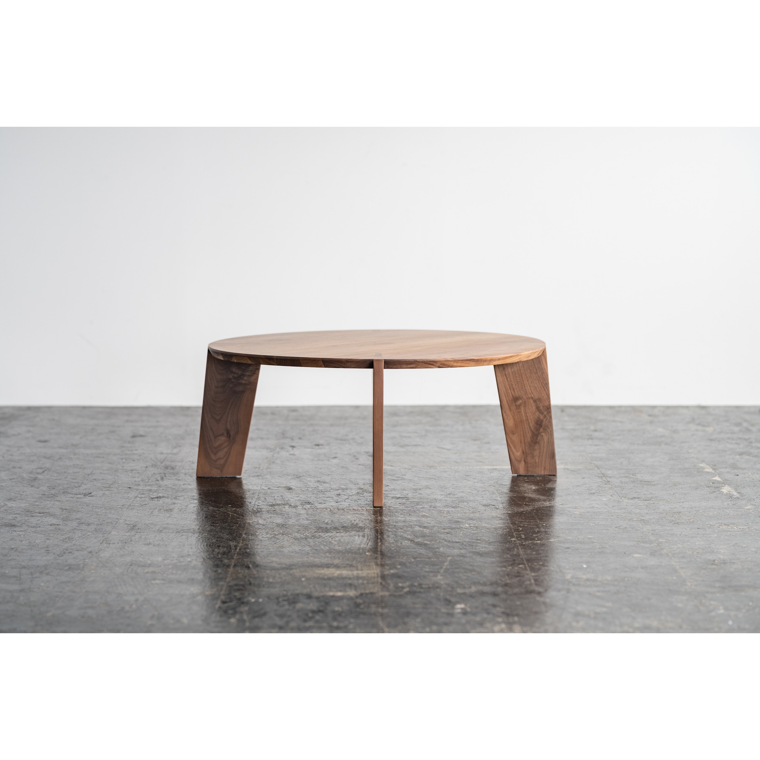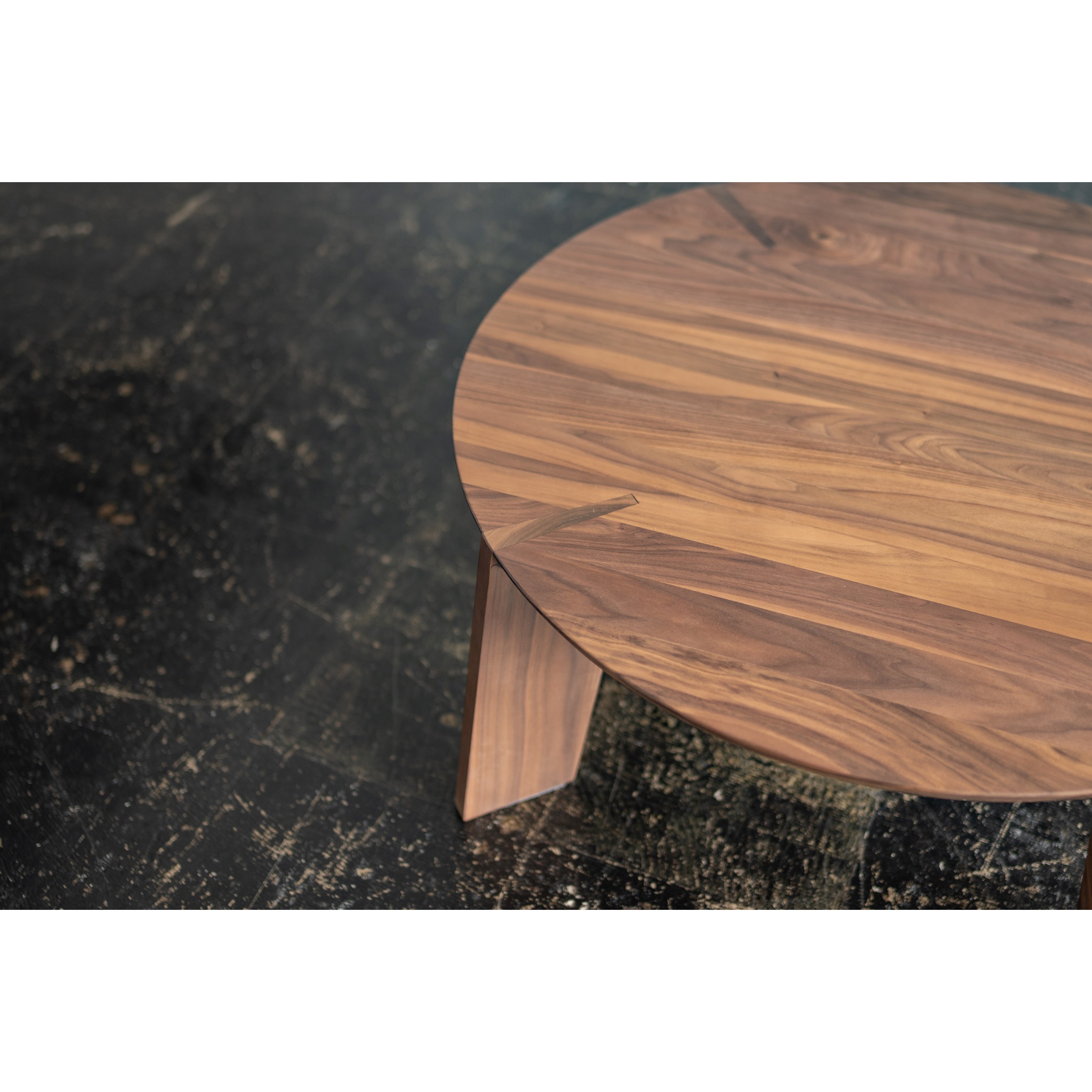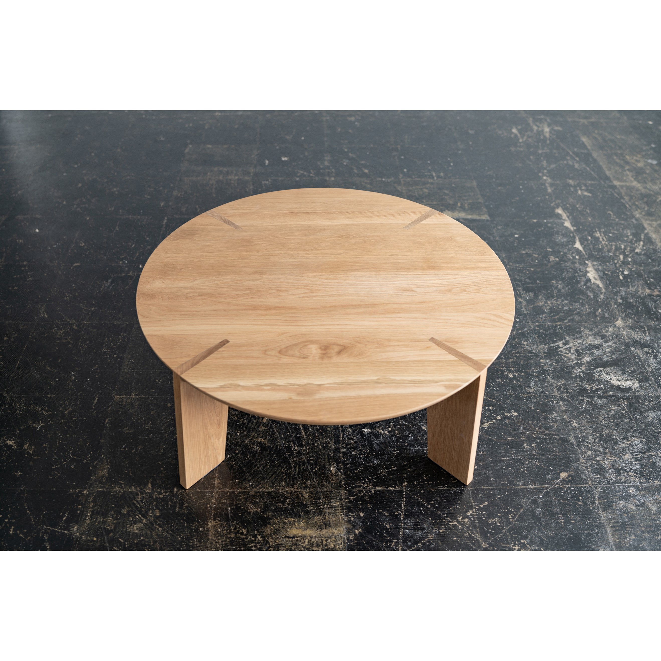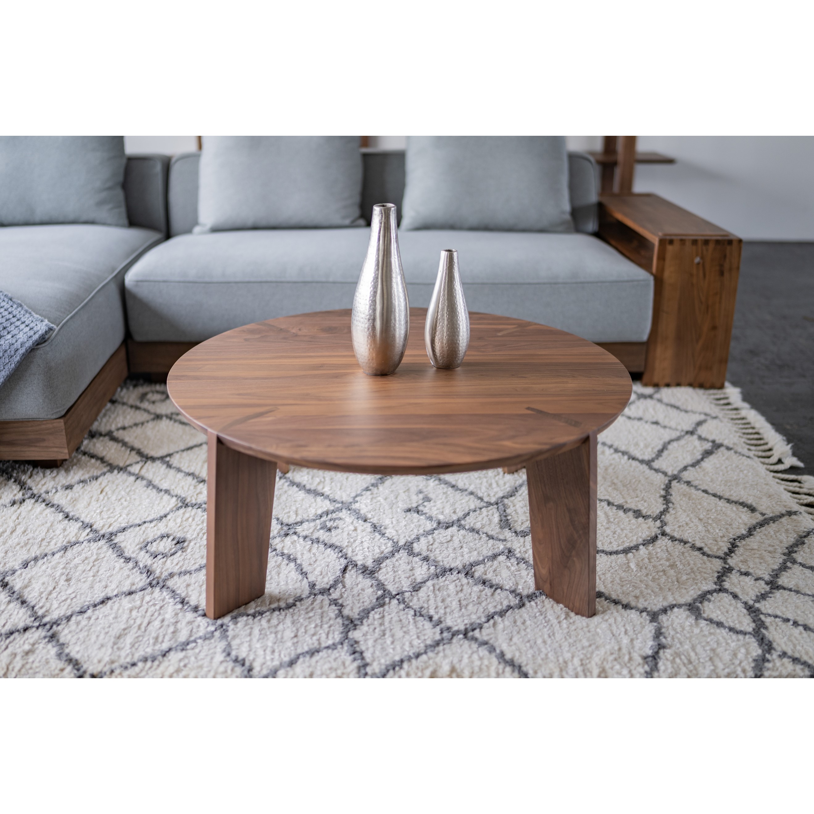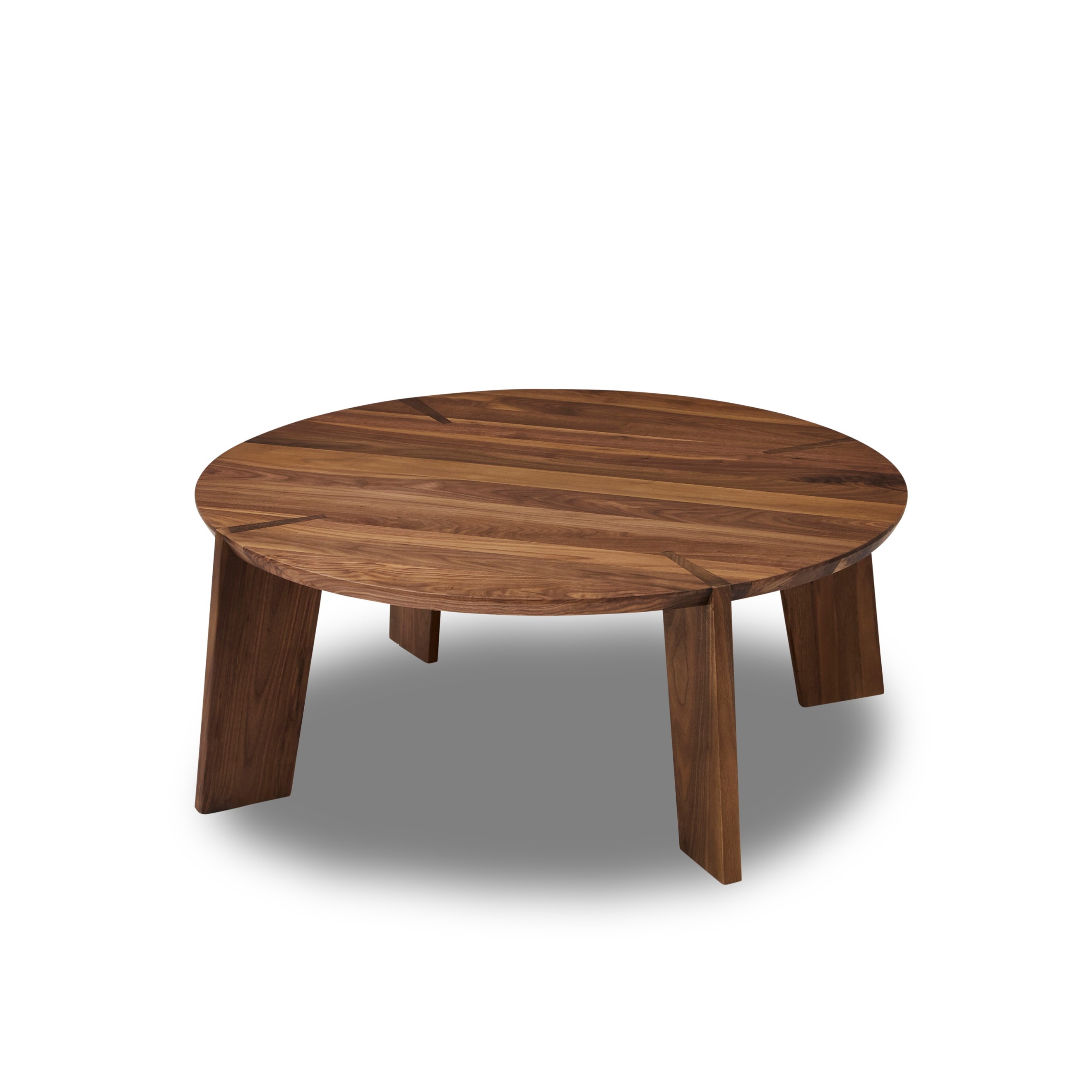 無垢の板で構成されたシンプルな円形のセンターテーブル。
