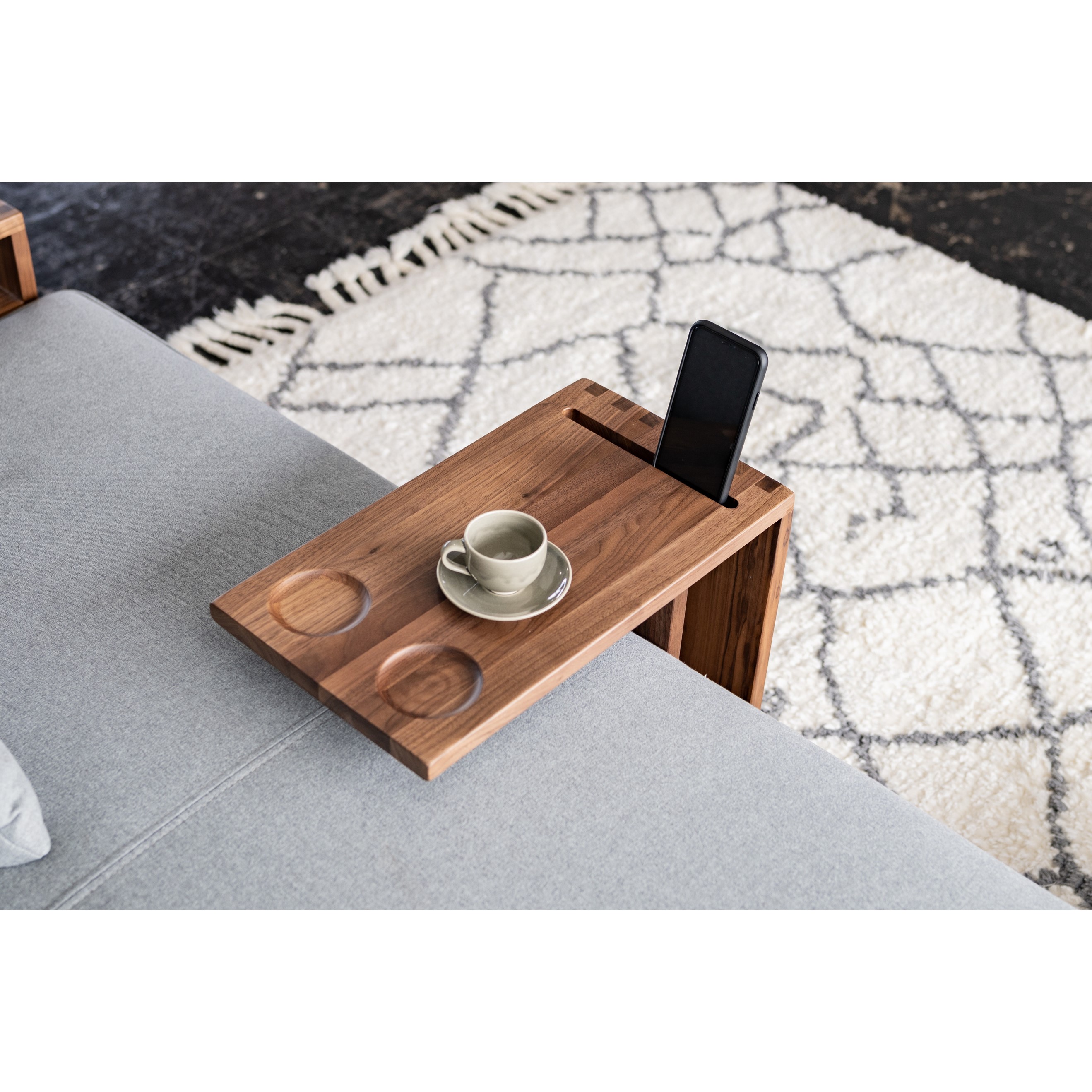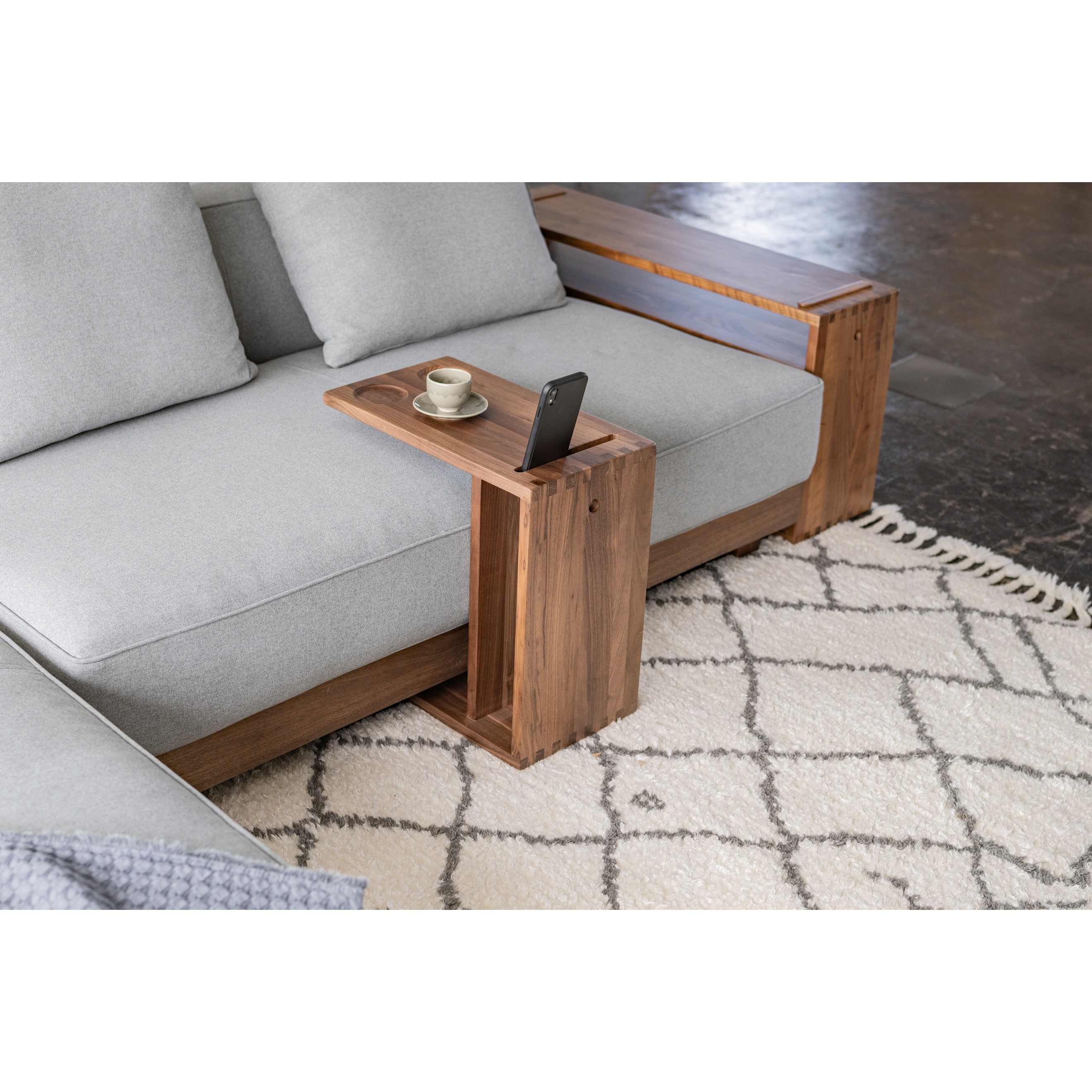 自由な位置に配置できるサイドシェルフとサイドテーブルを組み合わせて、