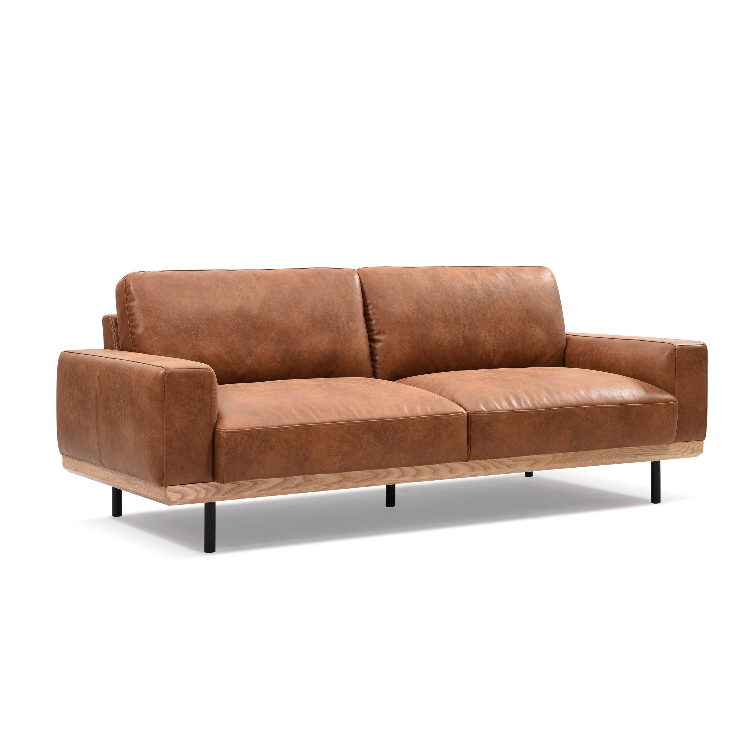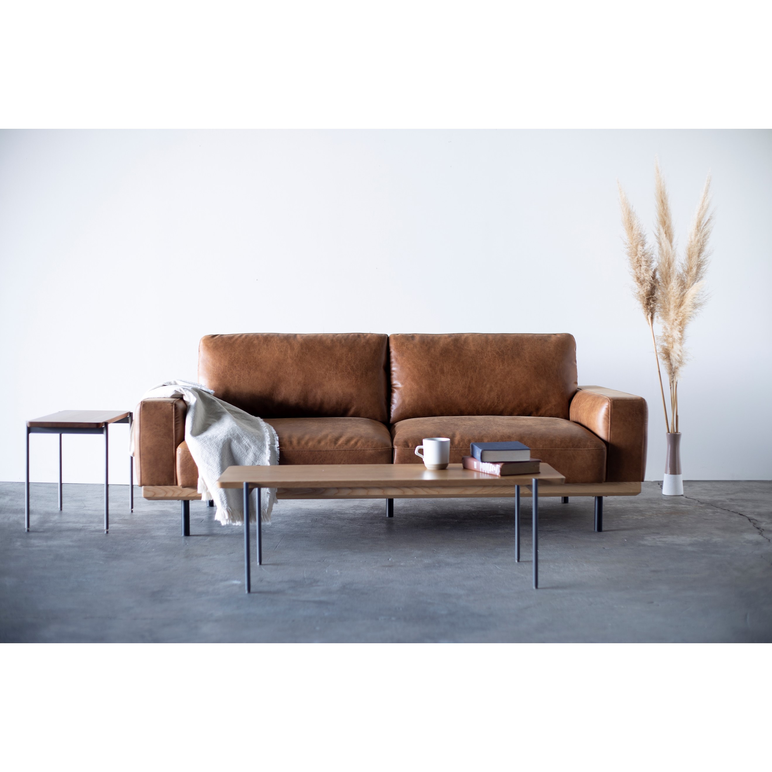 ボリュームのあるクッションに、すっきりとした脚元の木とスチールが